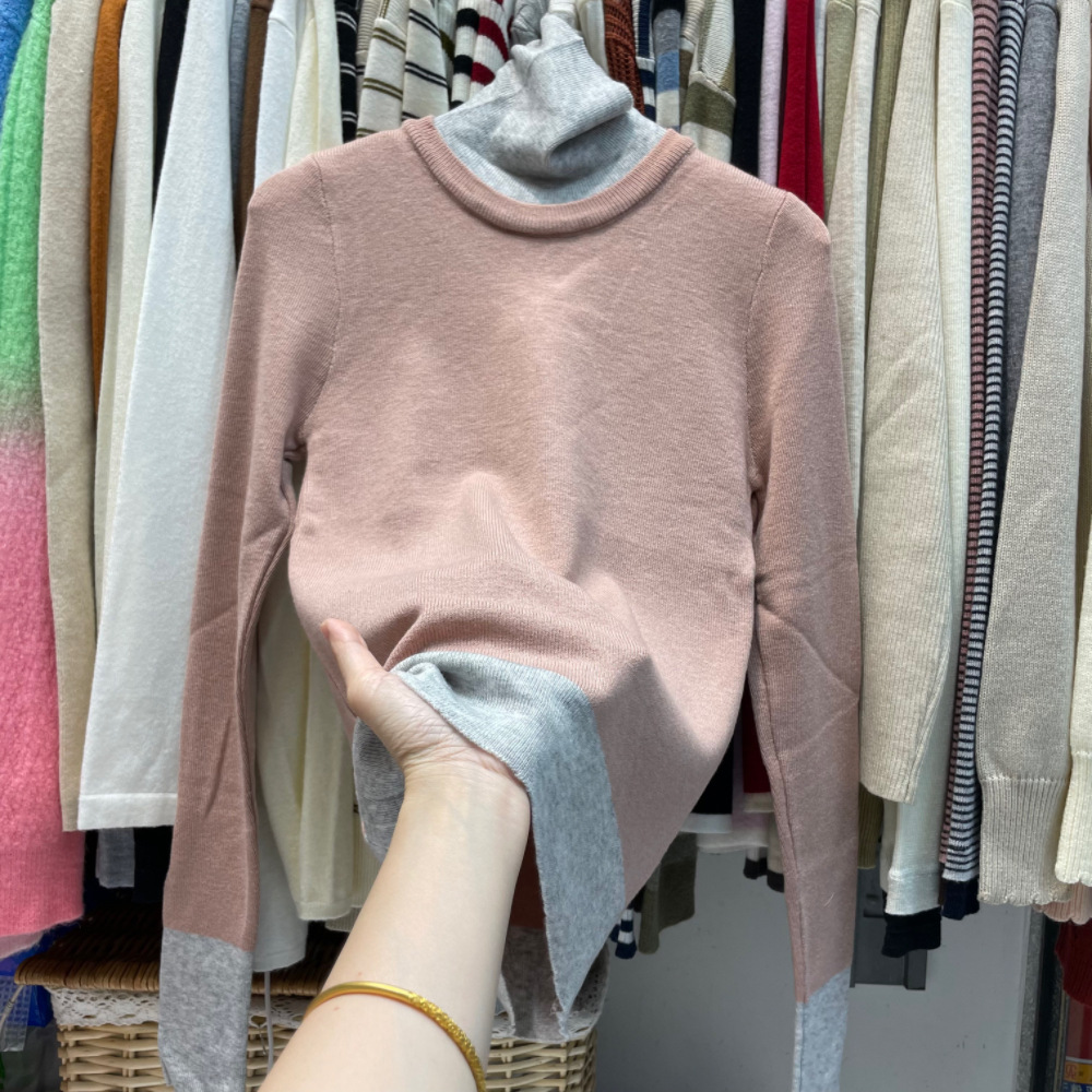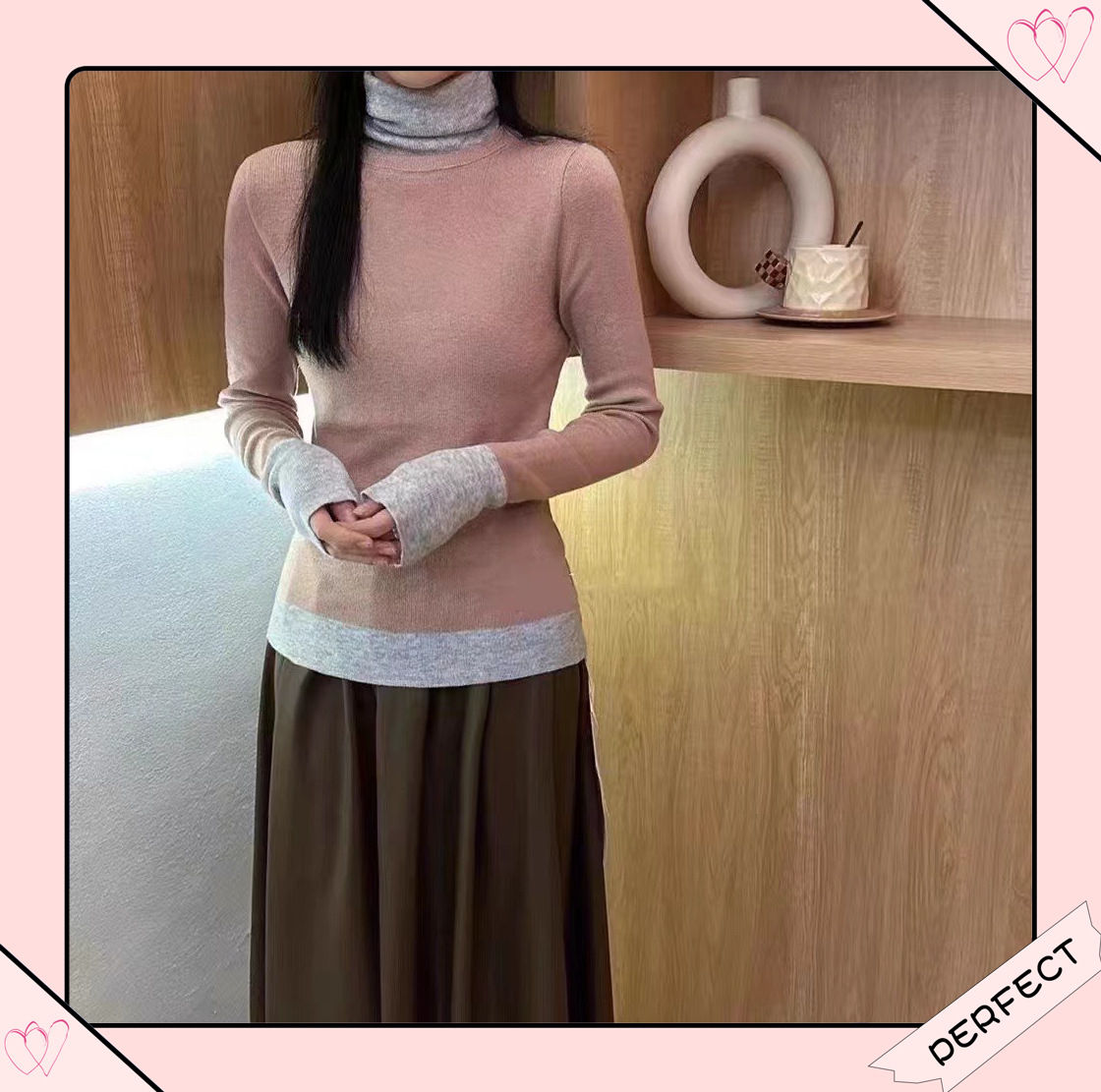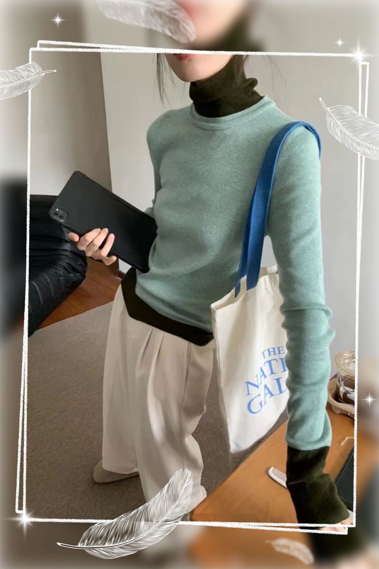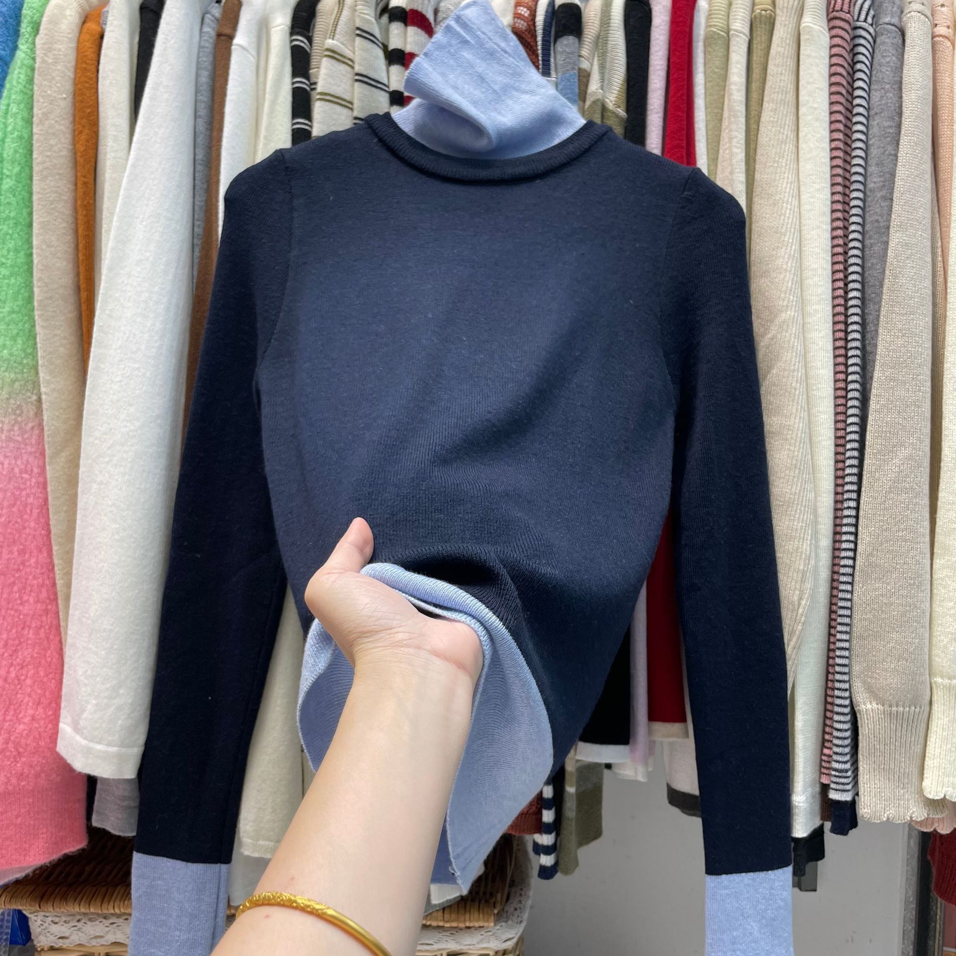 시니어 니치 컬러 대비 가짜 투피스 긴팔 더미 칼라 니트웨어 여성용 가을과 겨울 슬림 핏 얇은 우아한베이스 탑스토어 가기