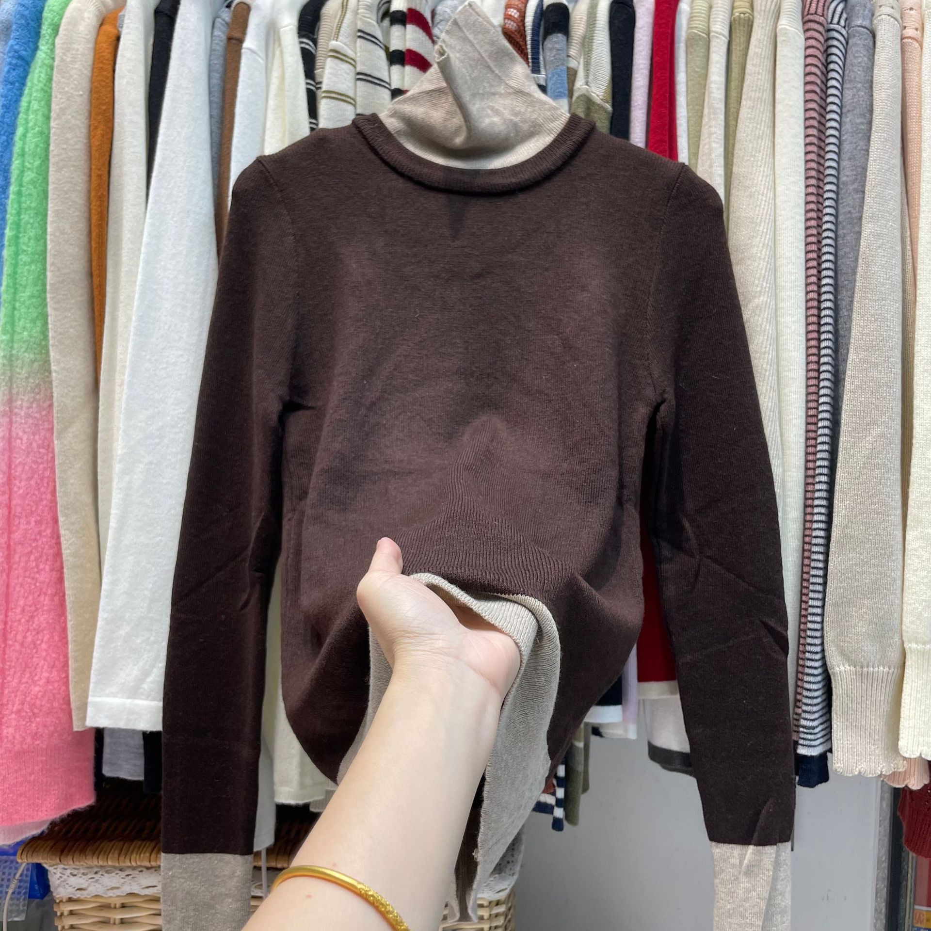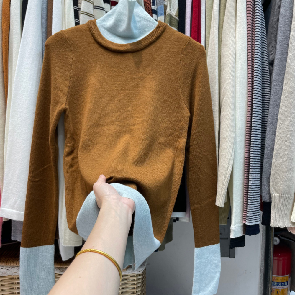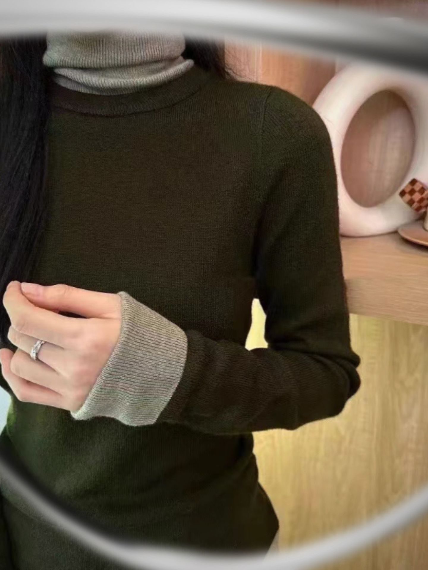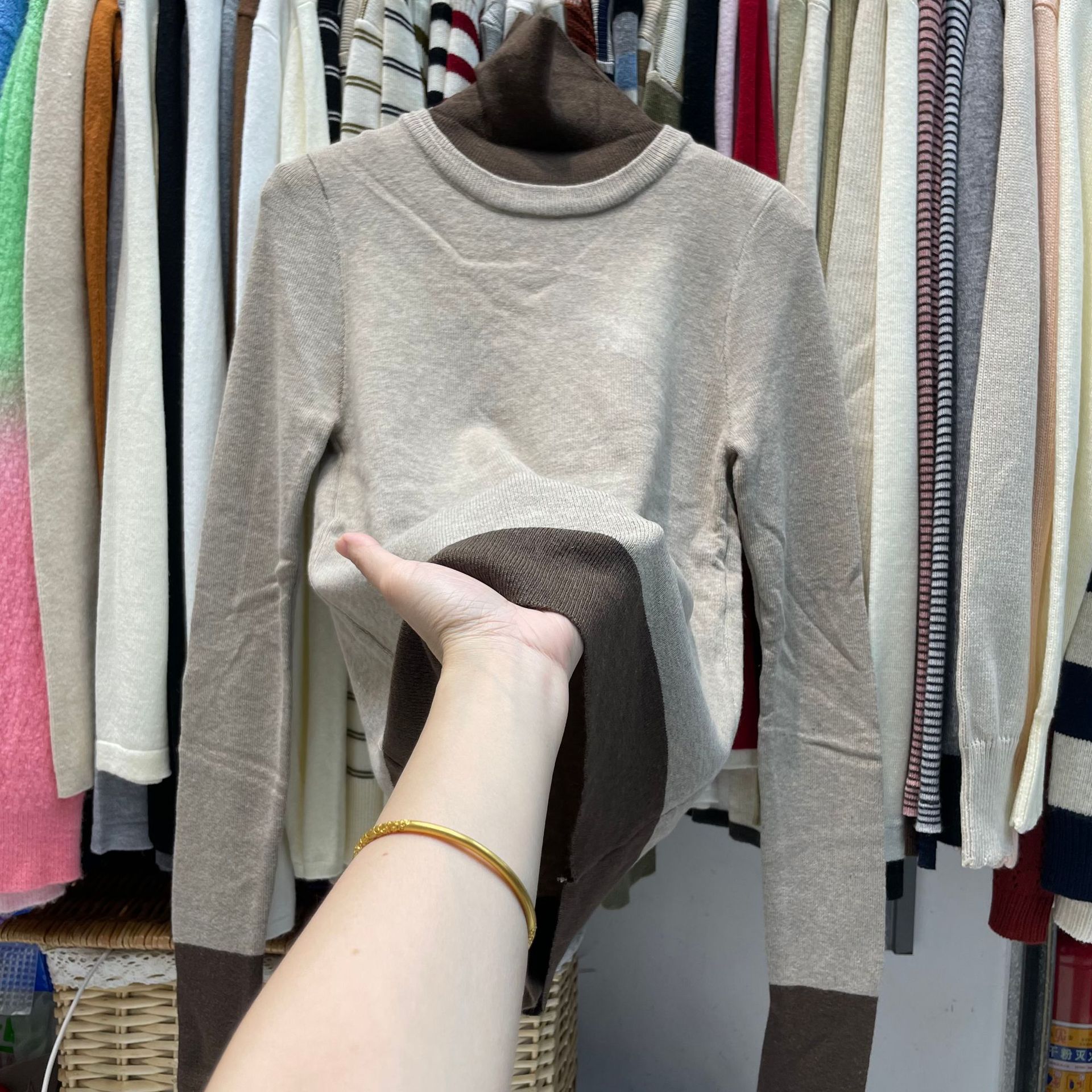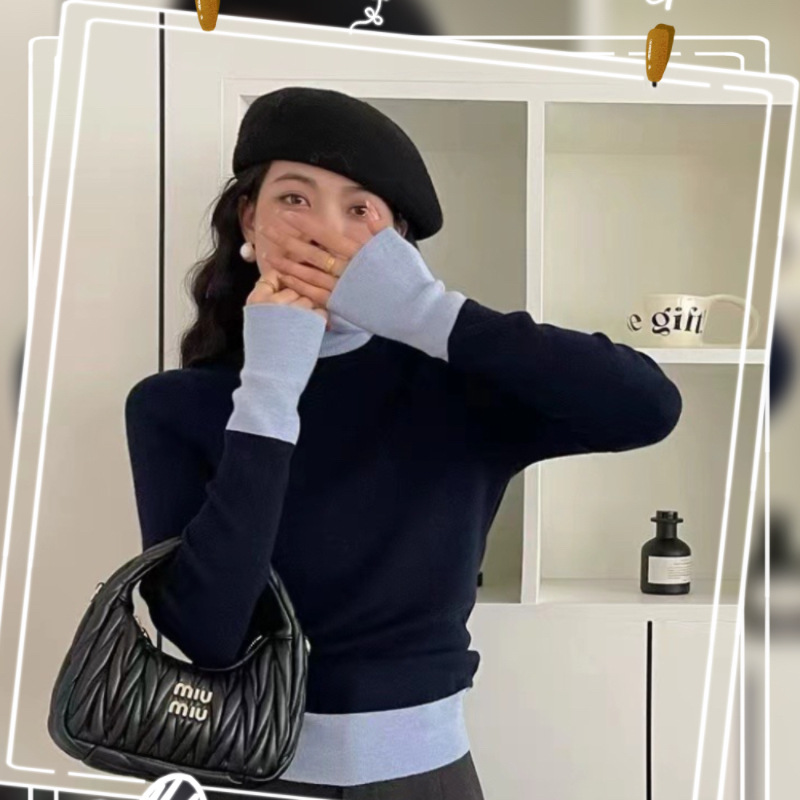 시니어 니치 컬러 대비 가짜 투피스 긴팔 더미 칼라 니트웨어 여성용 가을과 겨울 슬림 핏 얇은 우아한베이스 탑스토어 가기