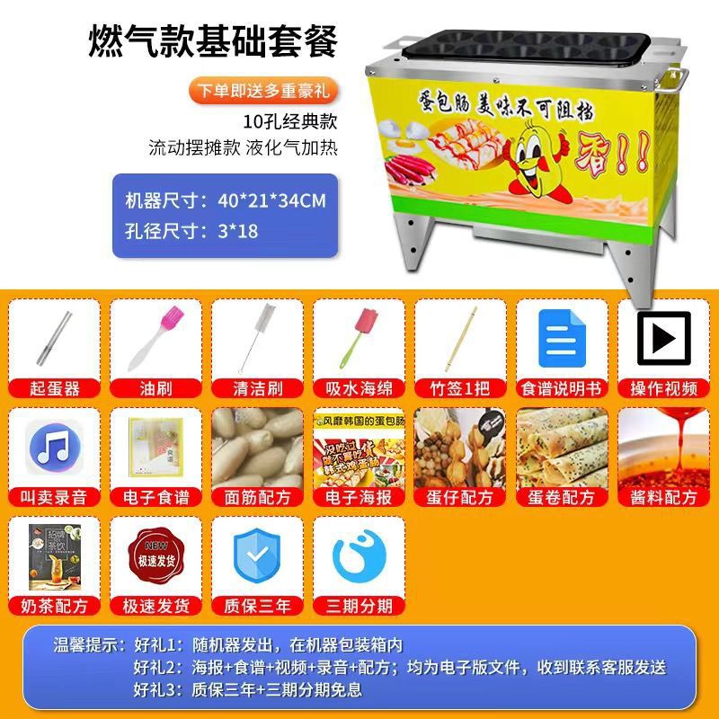 상점들은 상업용 계란 가방 소시지 기계 가스 10 홀 아침 식사 야시장 달걀 햄 삶은 계란 소시지 간식을 설치했습니다.