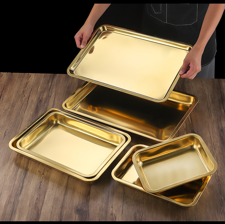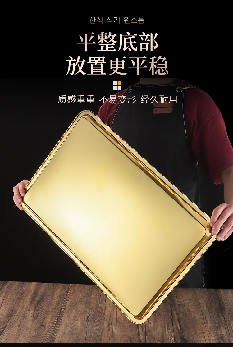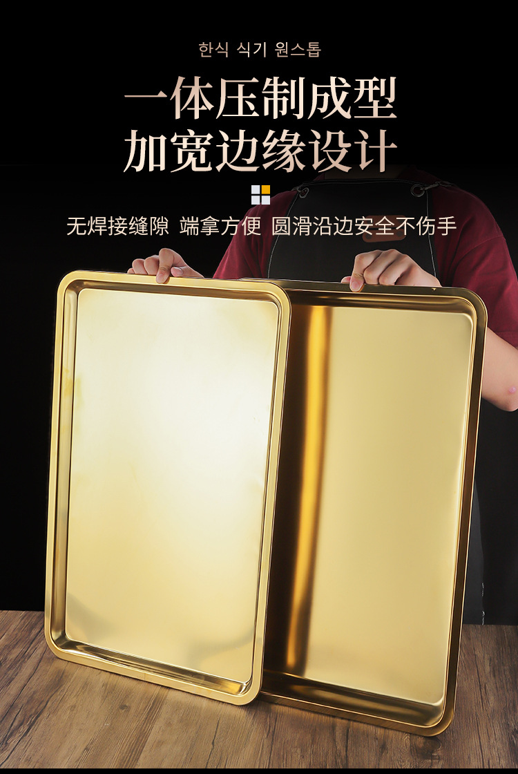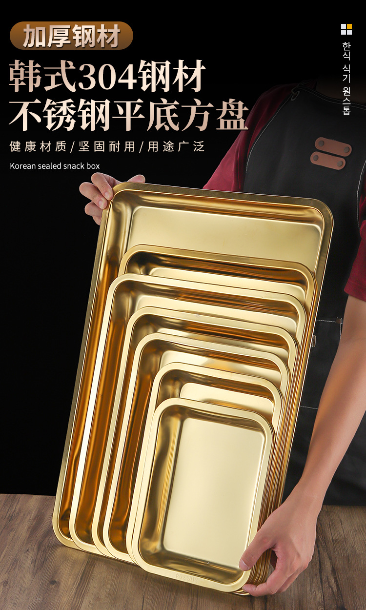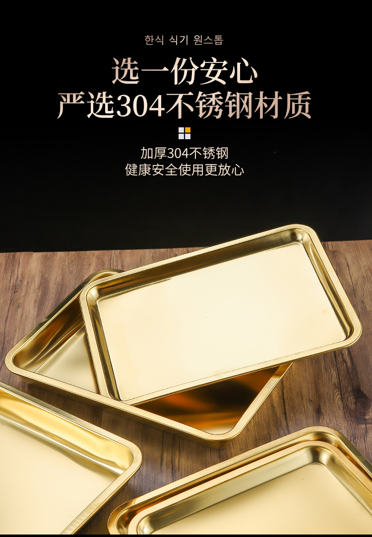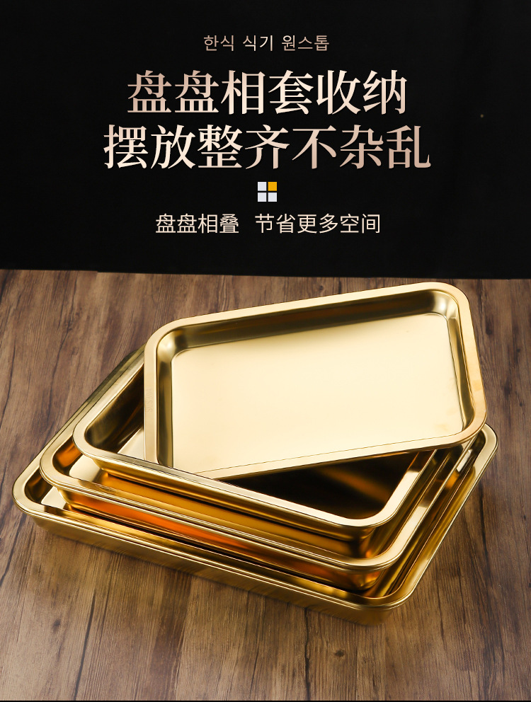 두꺼운 스테인레스 스틸 평평한 바닥 쟁반 쌀 그릇 만두 스퀘어 플레이트 직사각형 황금 한국 스타일 바베큐 플레이트 차가운 피부 김이 판스토어 가기
