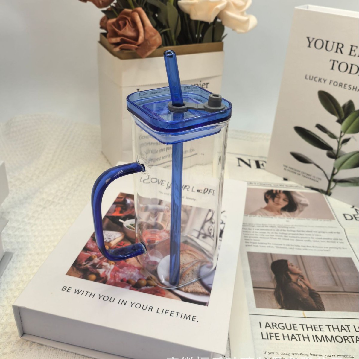• 파란색 손잡이와 빨대가 달린 사각 컵(파란색 뚜껑) 380ml