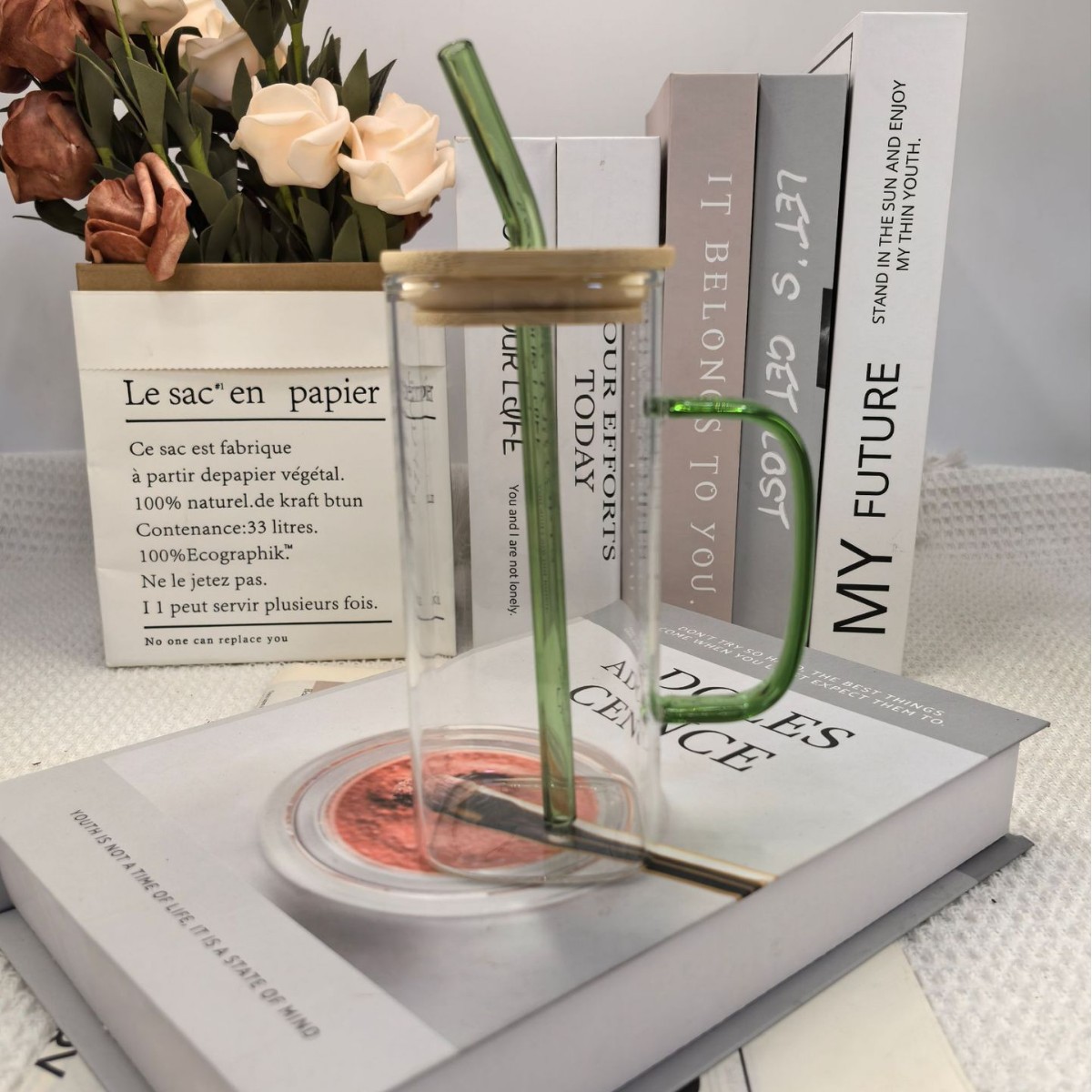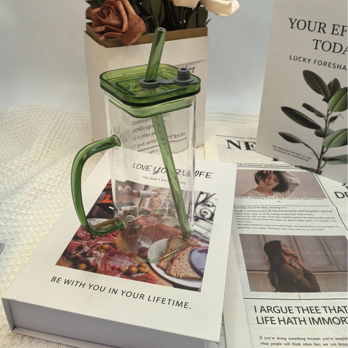 • 대나무 뚜껑과 빨대가 달린 사각 컵(녹색 손잡이) 380ml