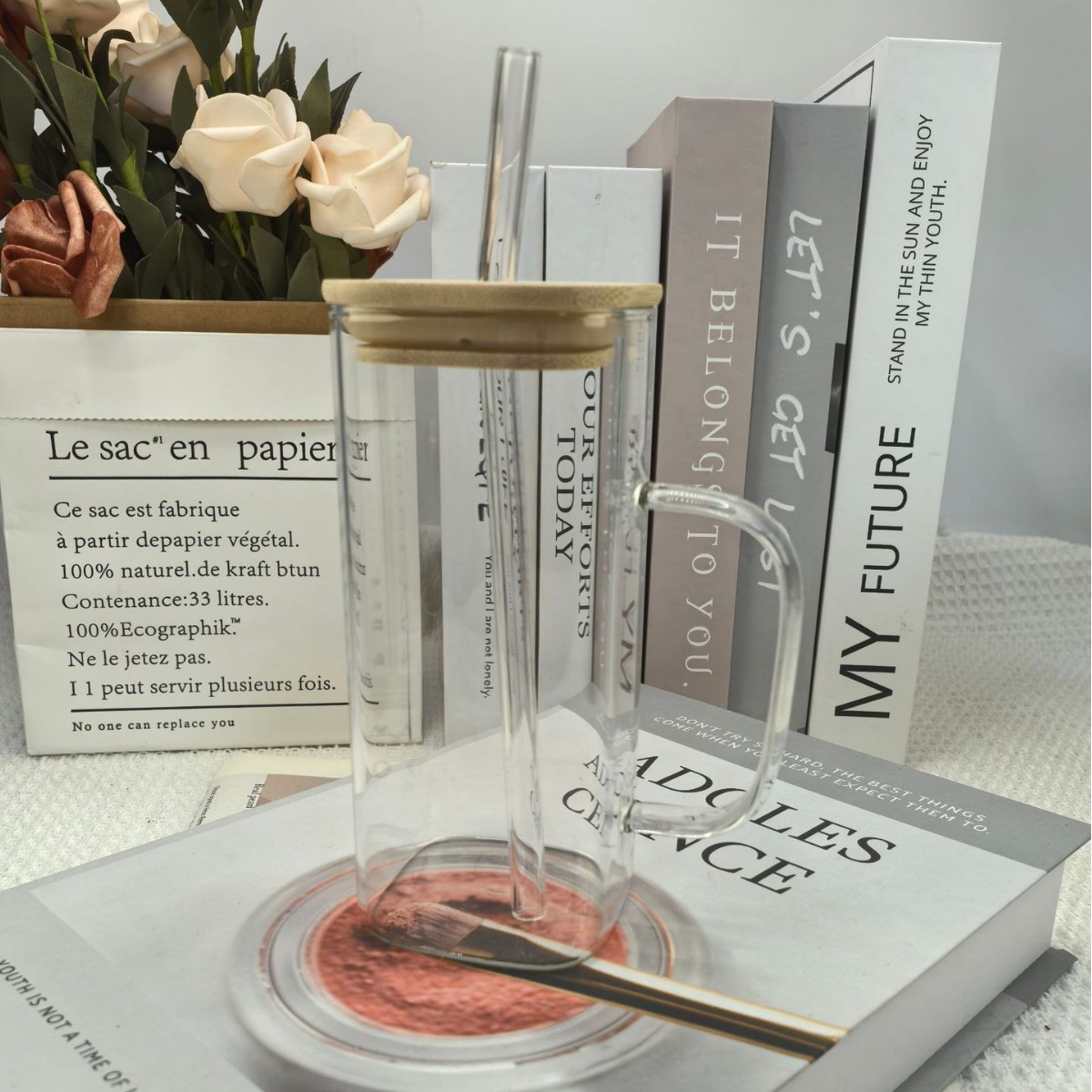 • 대나무 뚜껑이 달린 사각 빨대컵(투명손잡이) 380ml
