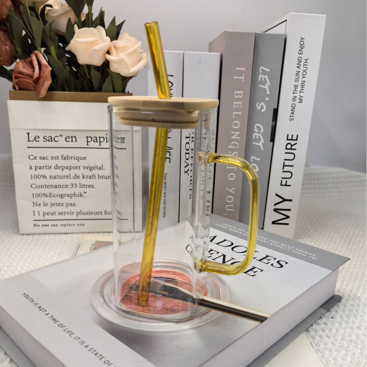 • 대나무 뚜껑과 빨대가 달린 사각 컵(노란색 손잡이) 380ml