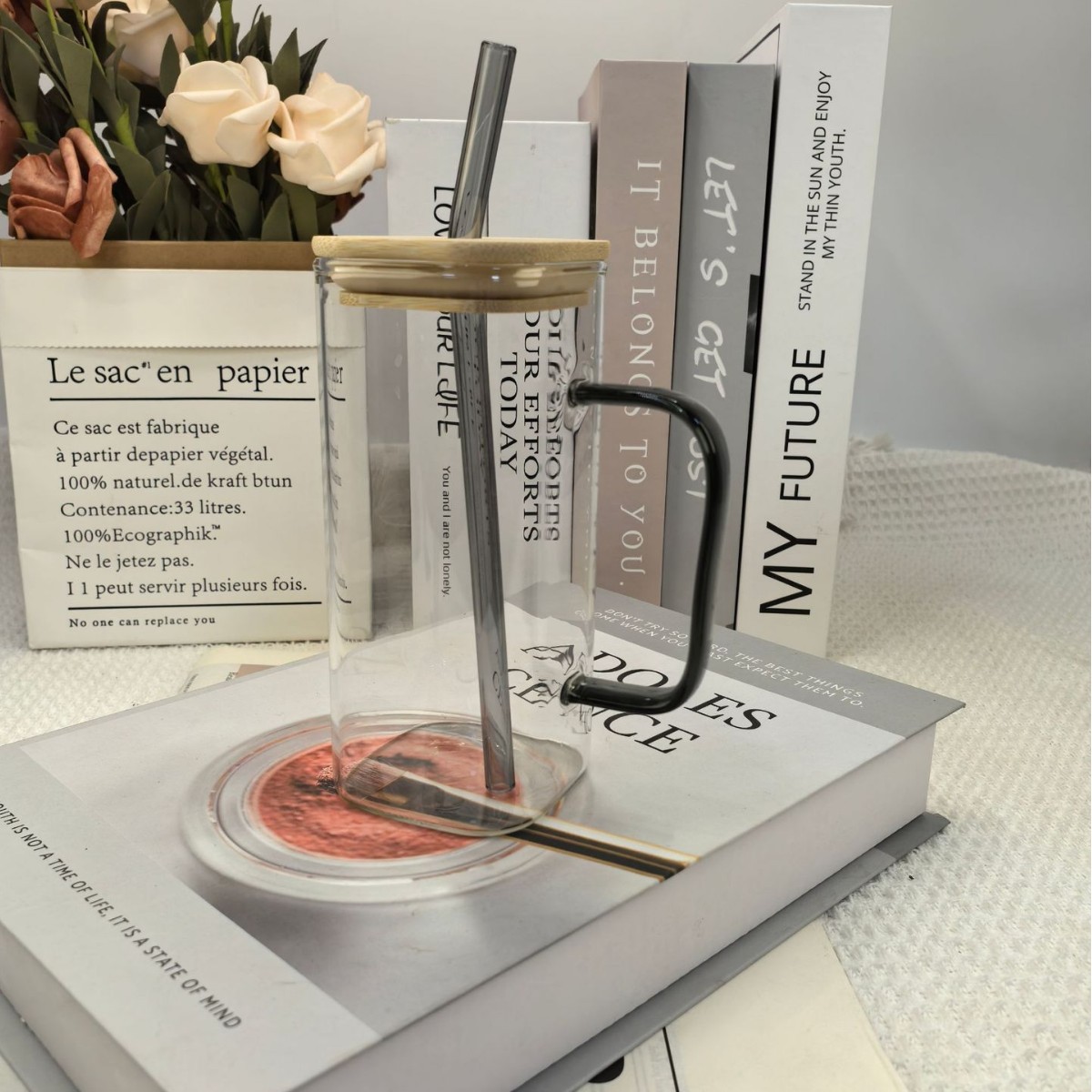 • 대나무 뚜껑과 빨대가 달린 사각 컵(검은색 손잡이) 380ml