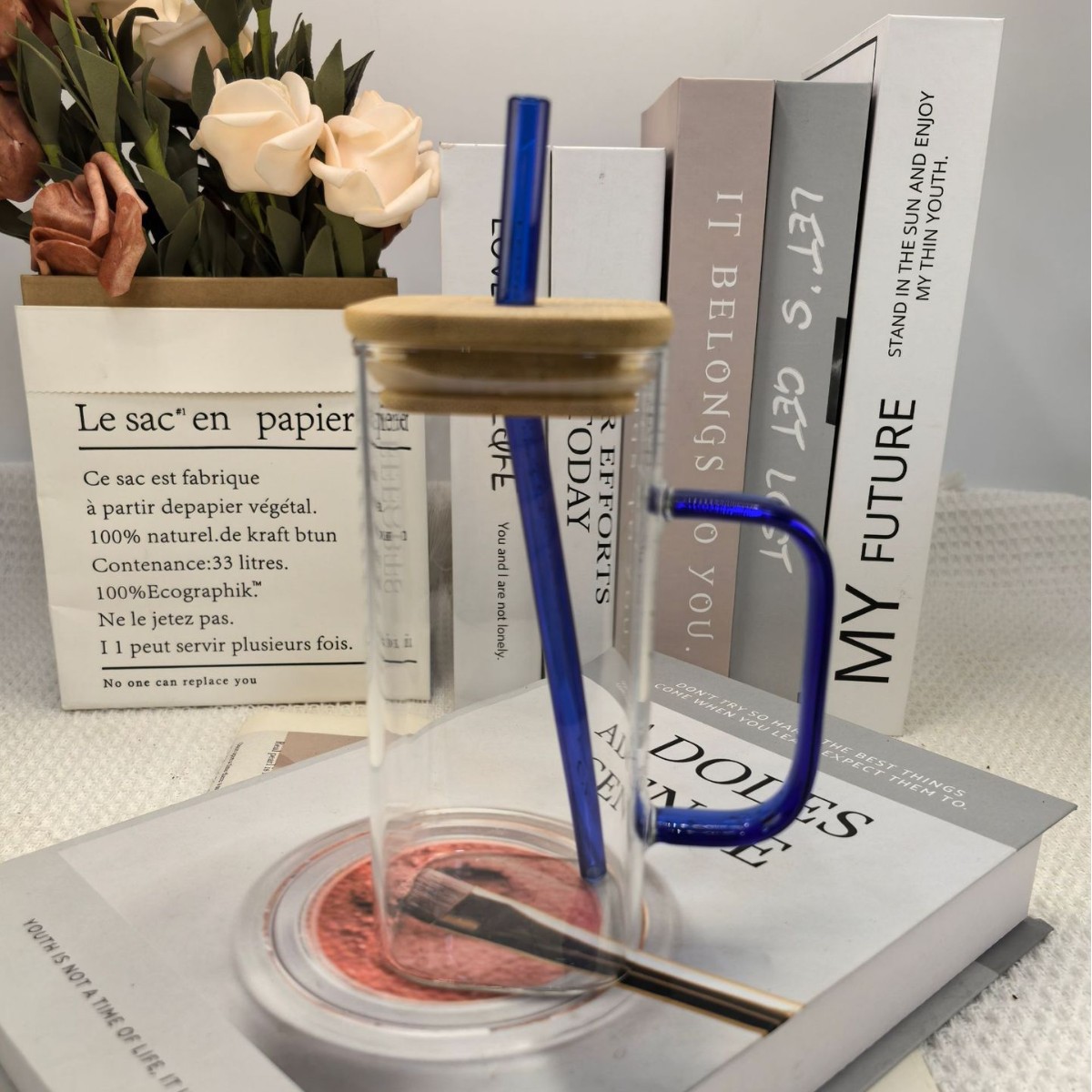 • 대나무뚜껑과 빨대가 달린 사각컵(파란색 손잡이) 380ml