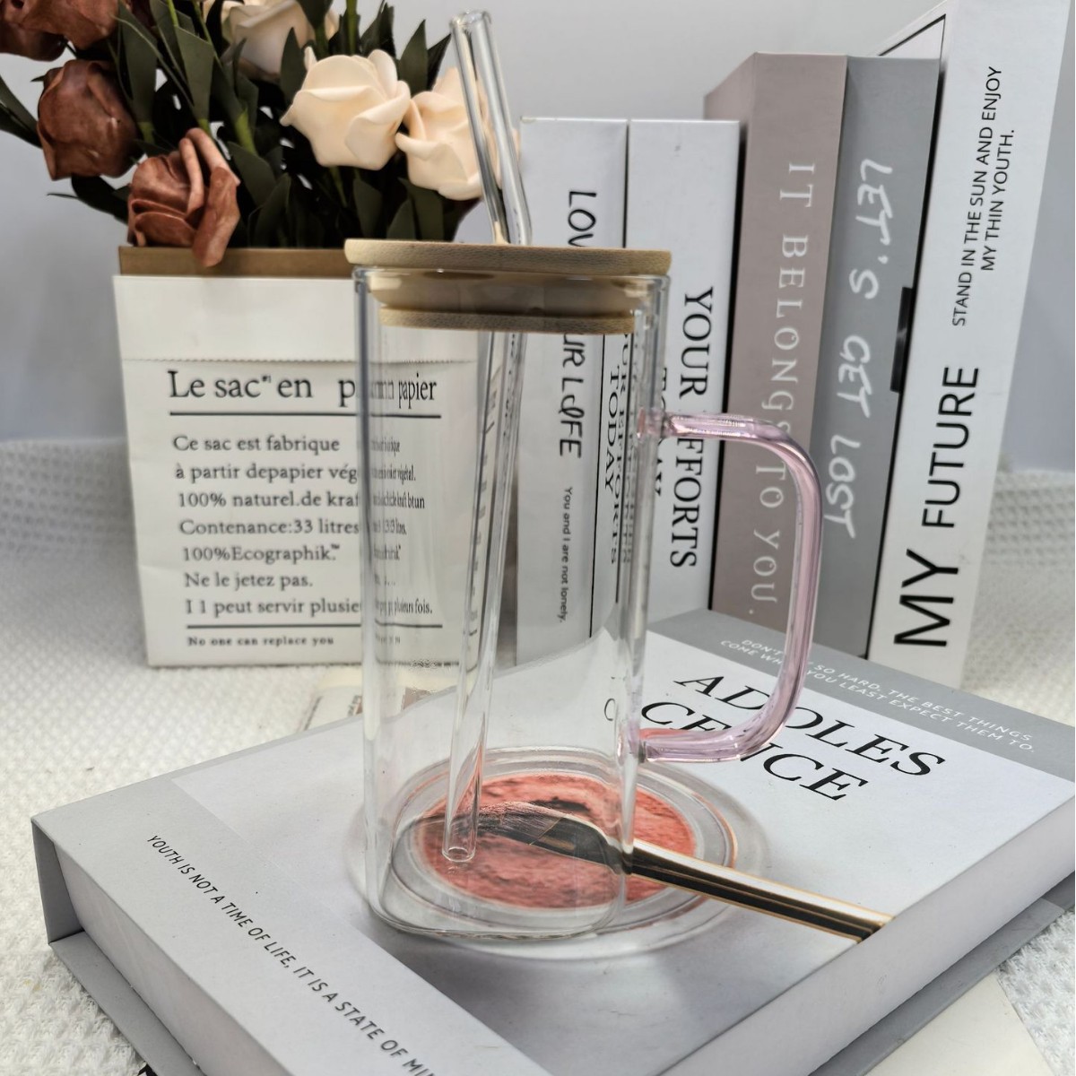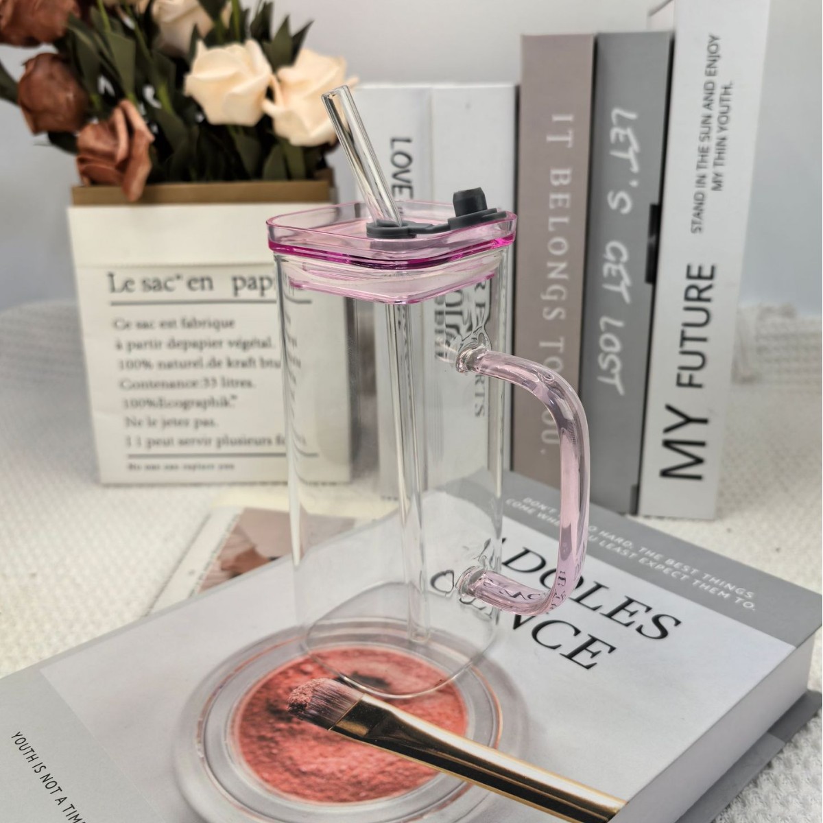 • 대나무 뚜껑과 빨대가 달린 사각 컵(핑크색 손잡이) 380ml