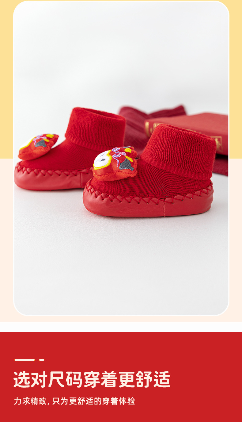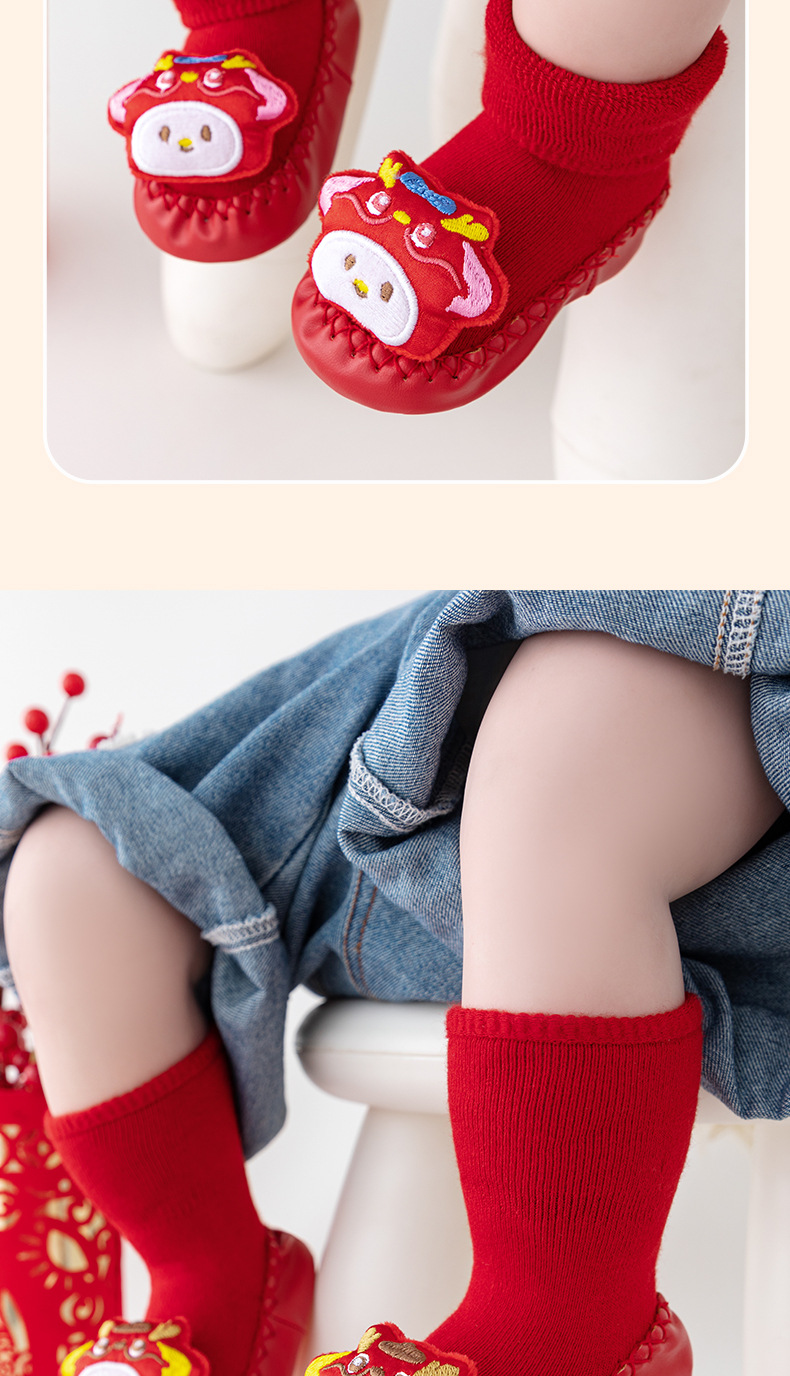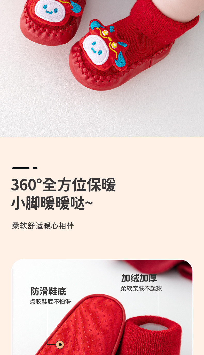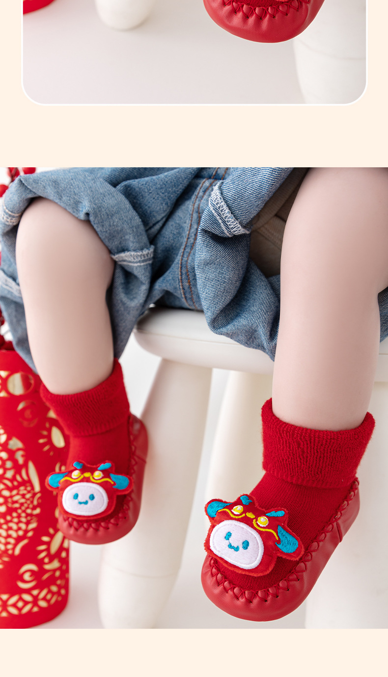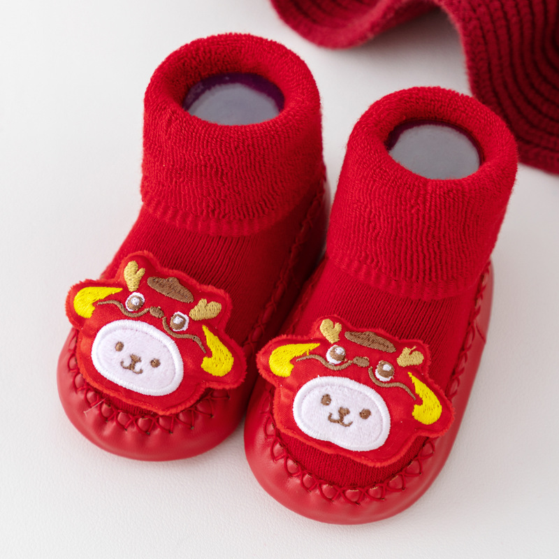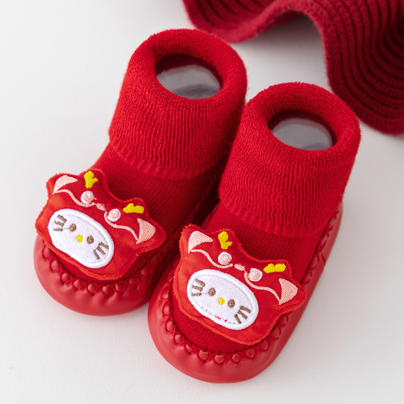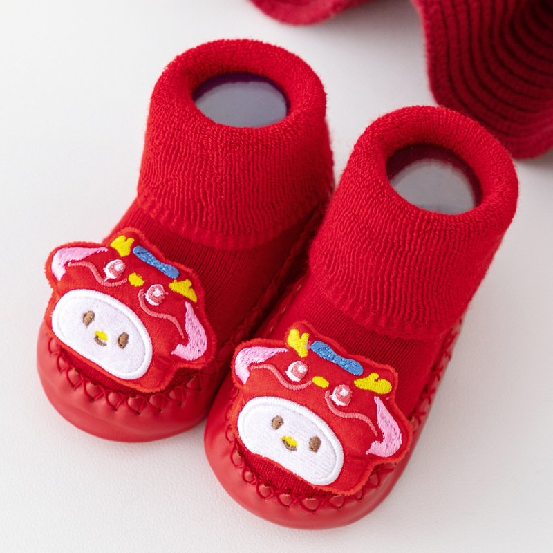 새해 아기 바닥 양말 큰 붉은 축제 아기 양말 신발 가을과 겨울 미끄럼 방지 어린이 유아 신발 양말