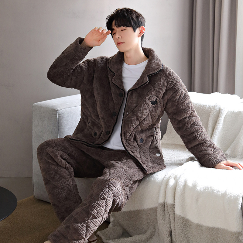 산호 양털 잠옷 여성의 겨울 3 층 퀼트 두꺼운 옷깃 세트 따뜻한 고급 남성 홈 옷