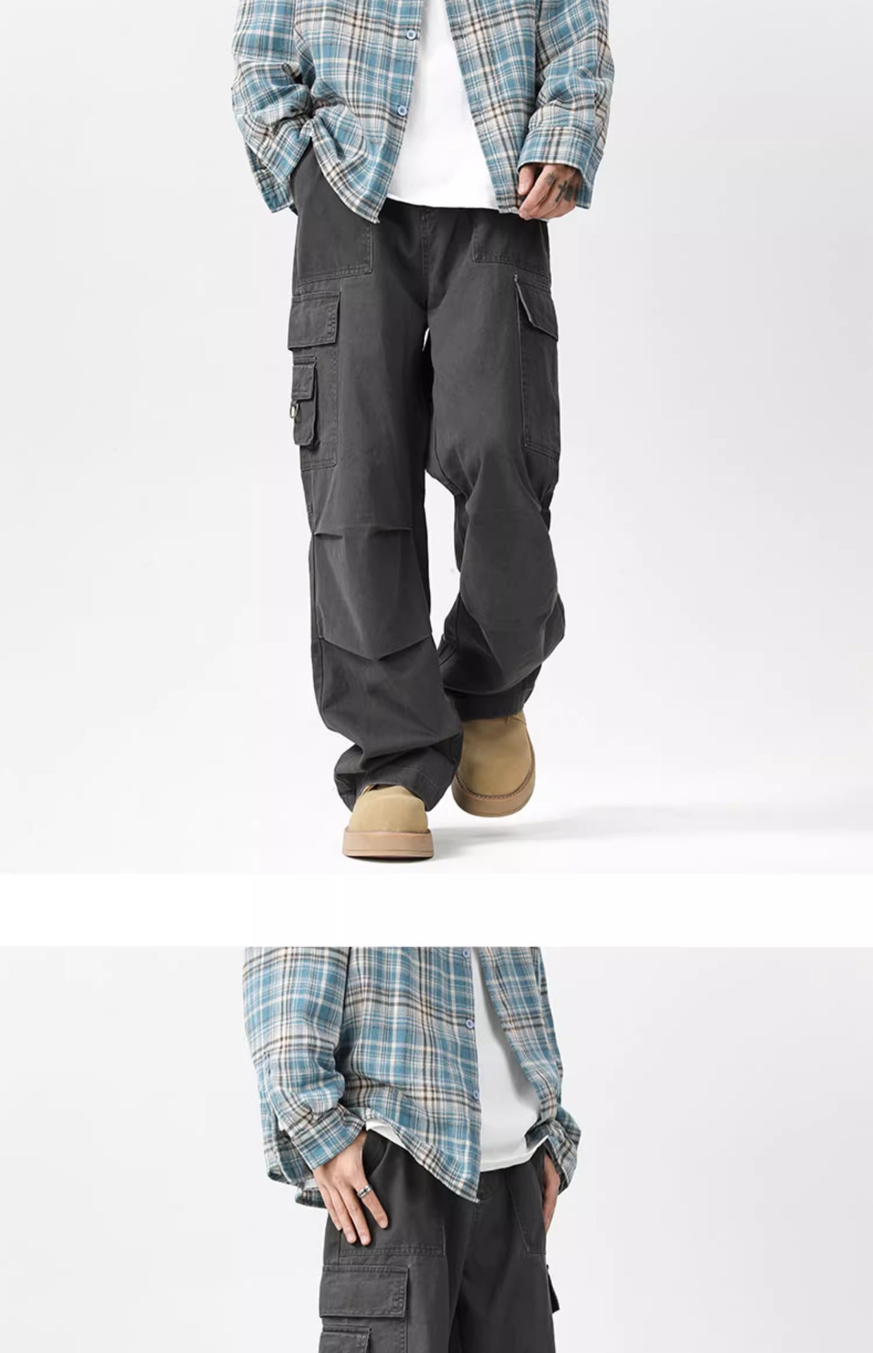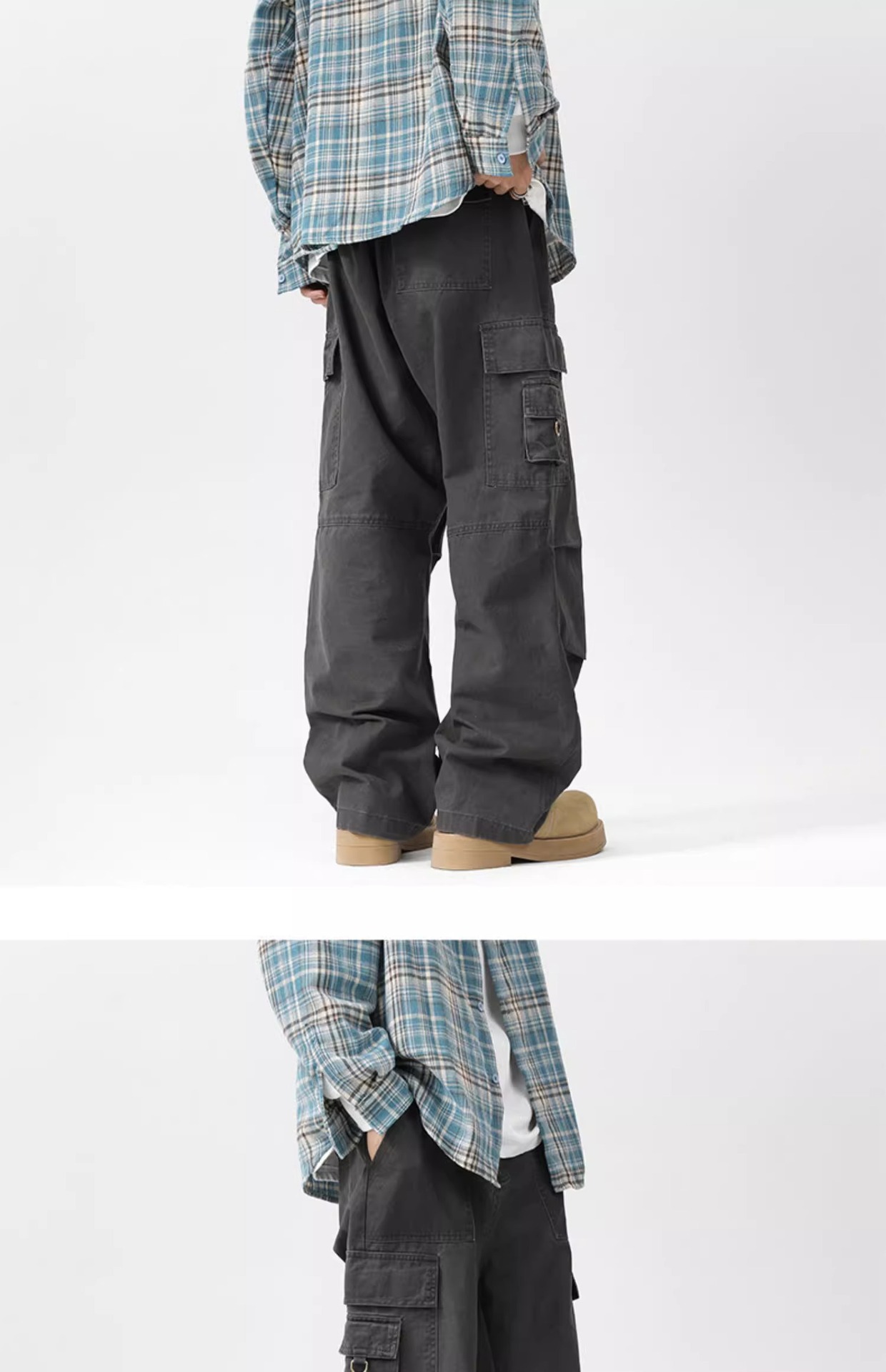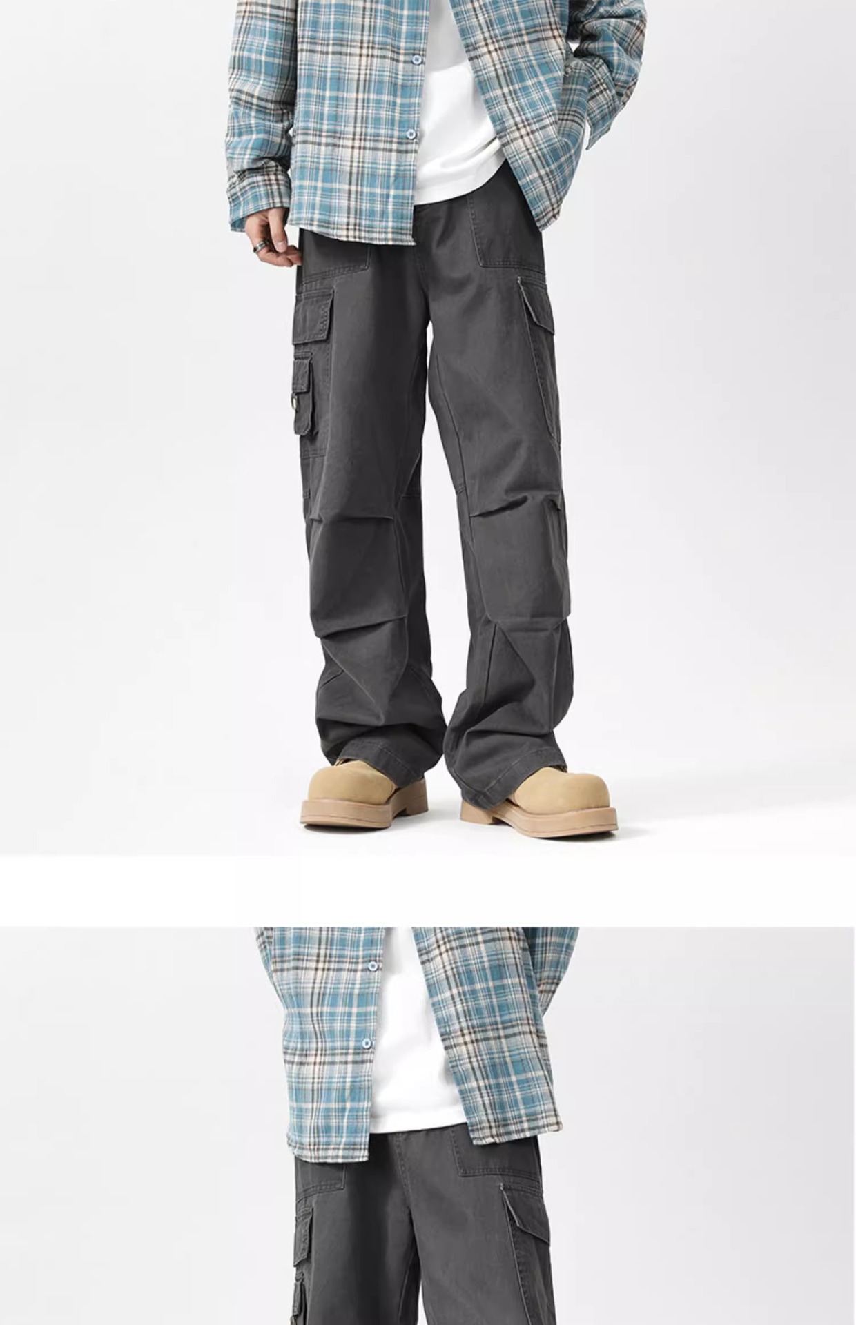 미국 스타일 빈티지 세탁 크레인 바지 남성 가을 패션 브랜드 틈새 느슨한 스트레이트 와이드 다리 바지 포켓 낙하산 바지스토어 가기