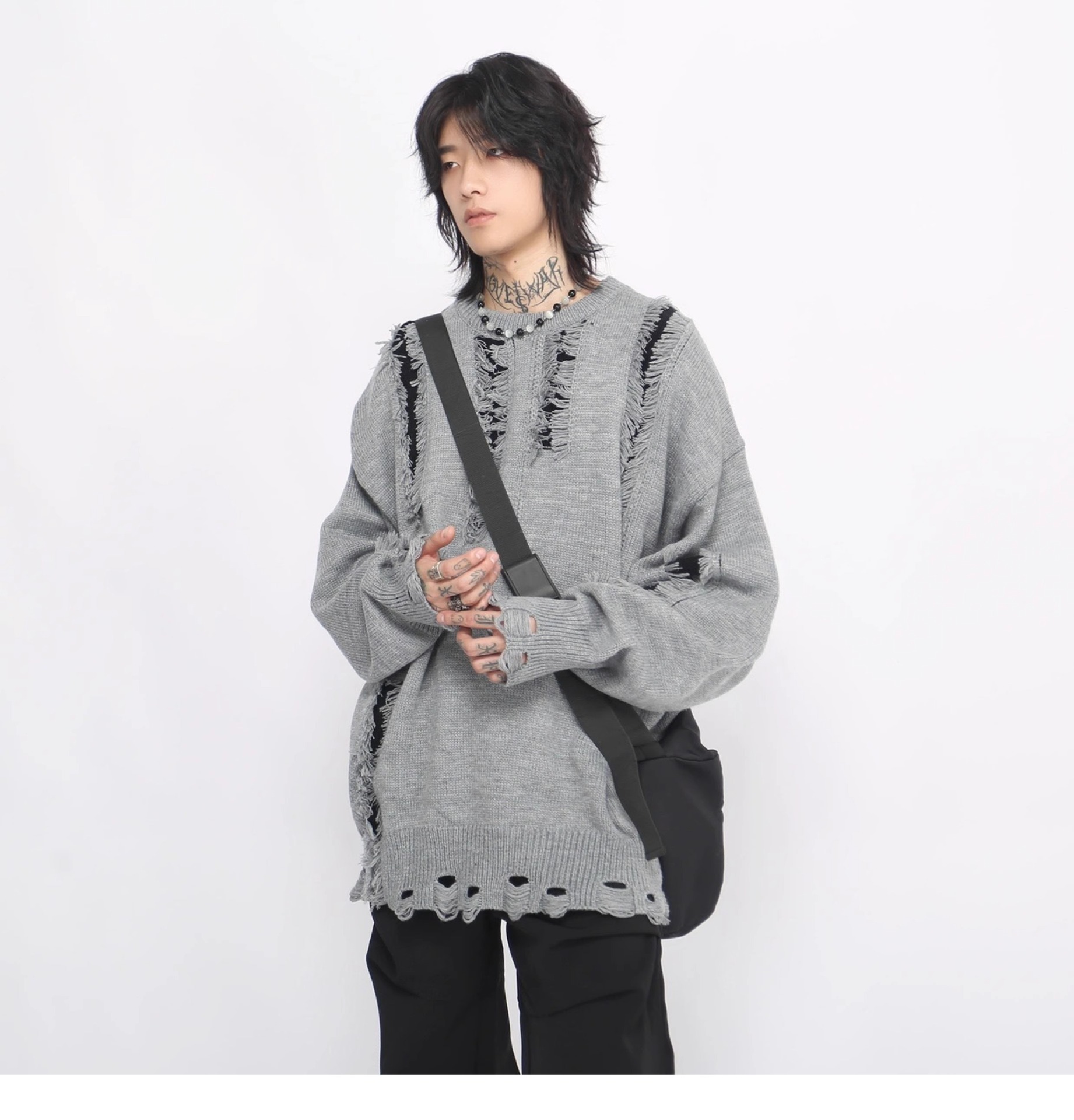 하이 스트리트 헤어 디자인 센스 헴스 리핑 크루 넥 스웨터 남성 가을과 겨울 새로운 게으른 스타일 아메리칸 스트리트 스웨터