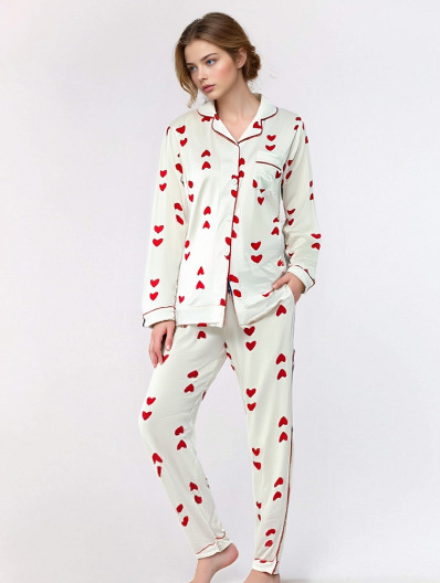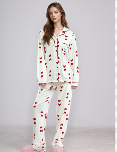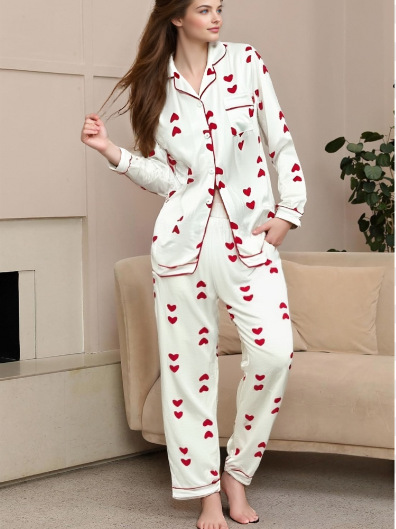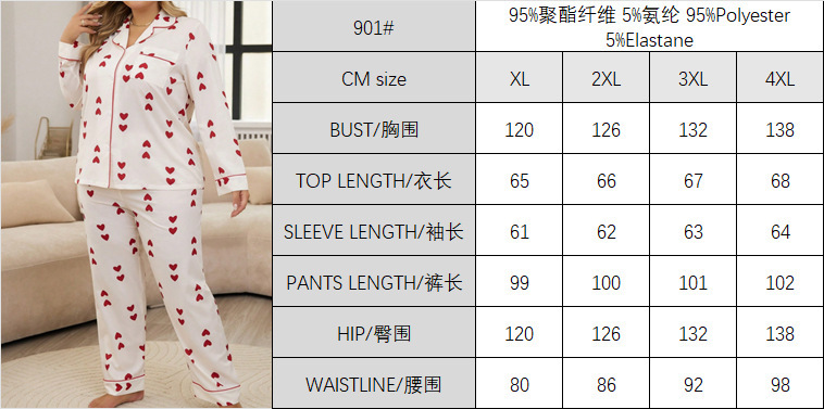 크로스보더 대형 사이즈 잠옷 와플 가디건 긴팔 바지 하트 달콤한 홈웨어 세트 외출복으로도 착용 가능 밀크 실크
