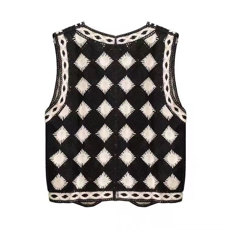 검은 마름모꼴 니트 크로 셰 뜨개질 중공 조끼 여성 가을 겨울 새로운 한국식 슬리밍 싱글 브레스트 탑