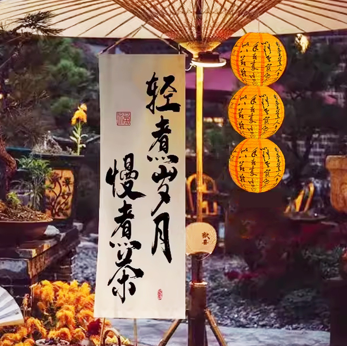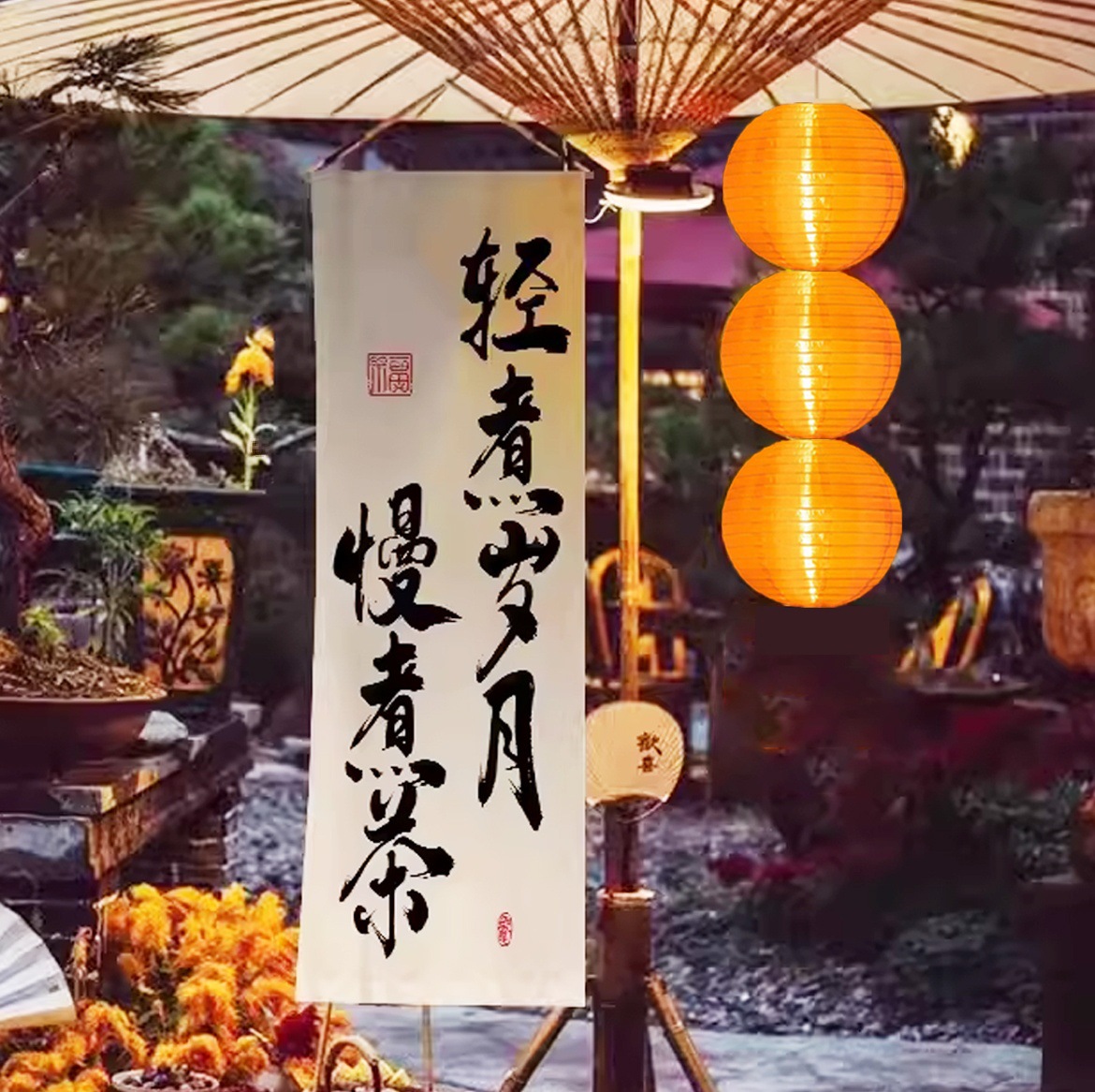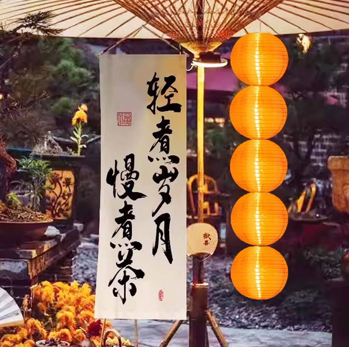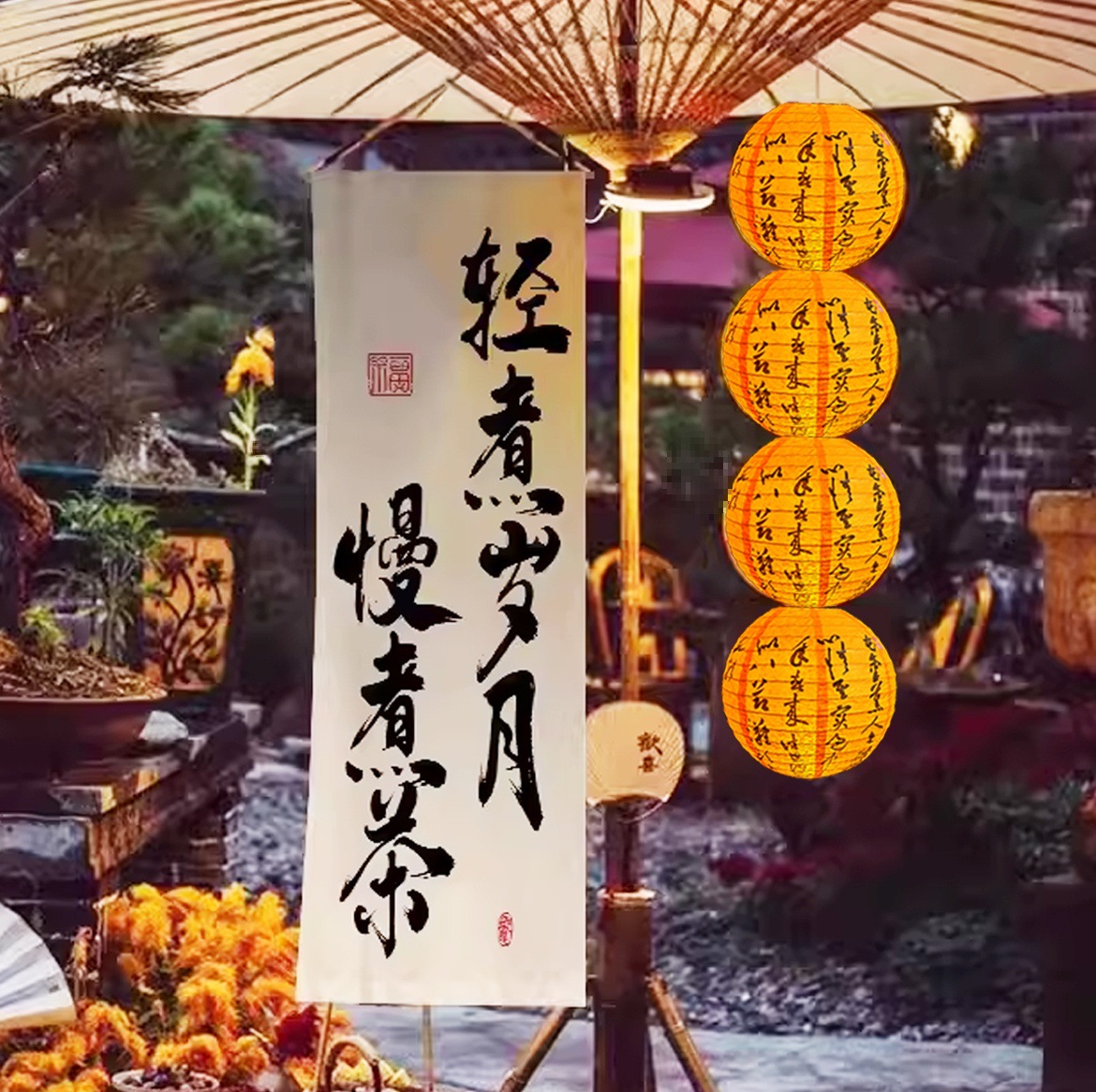 오븐 요리 찻집의 안뜰 장면은 골동품 중국 스타일의 국가 조수 오렌지 종이 랜턴 행운의 소품 랜턴으로 장식되어 있습니다.