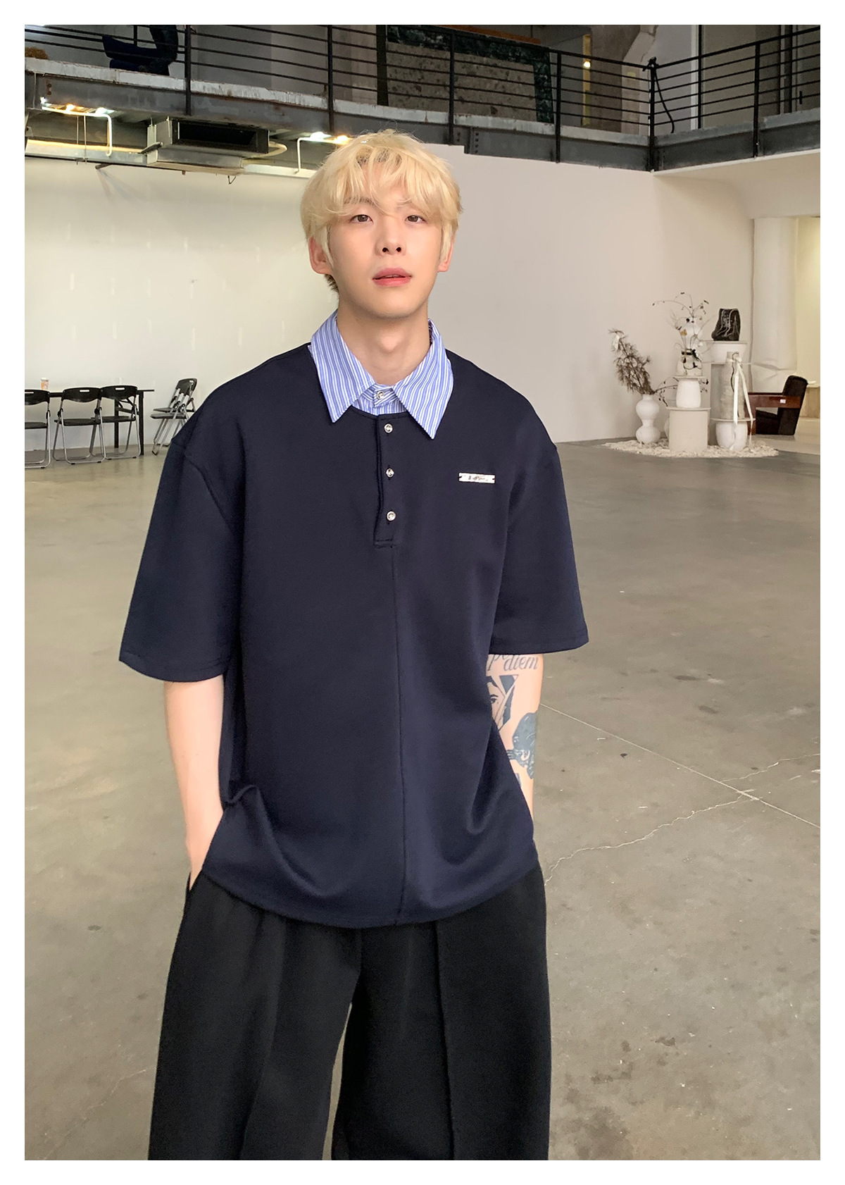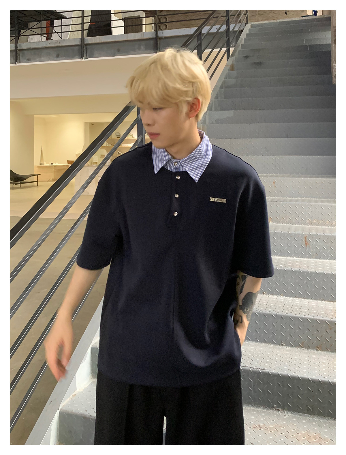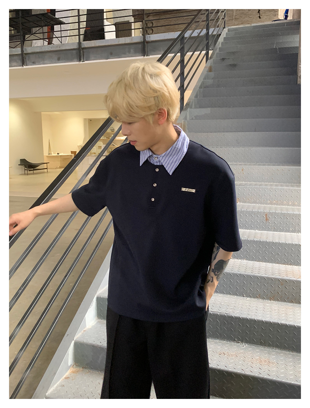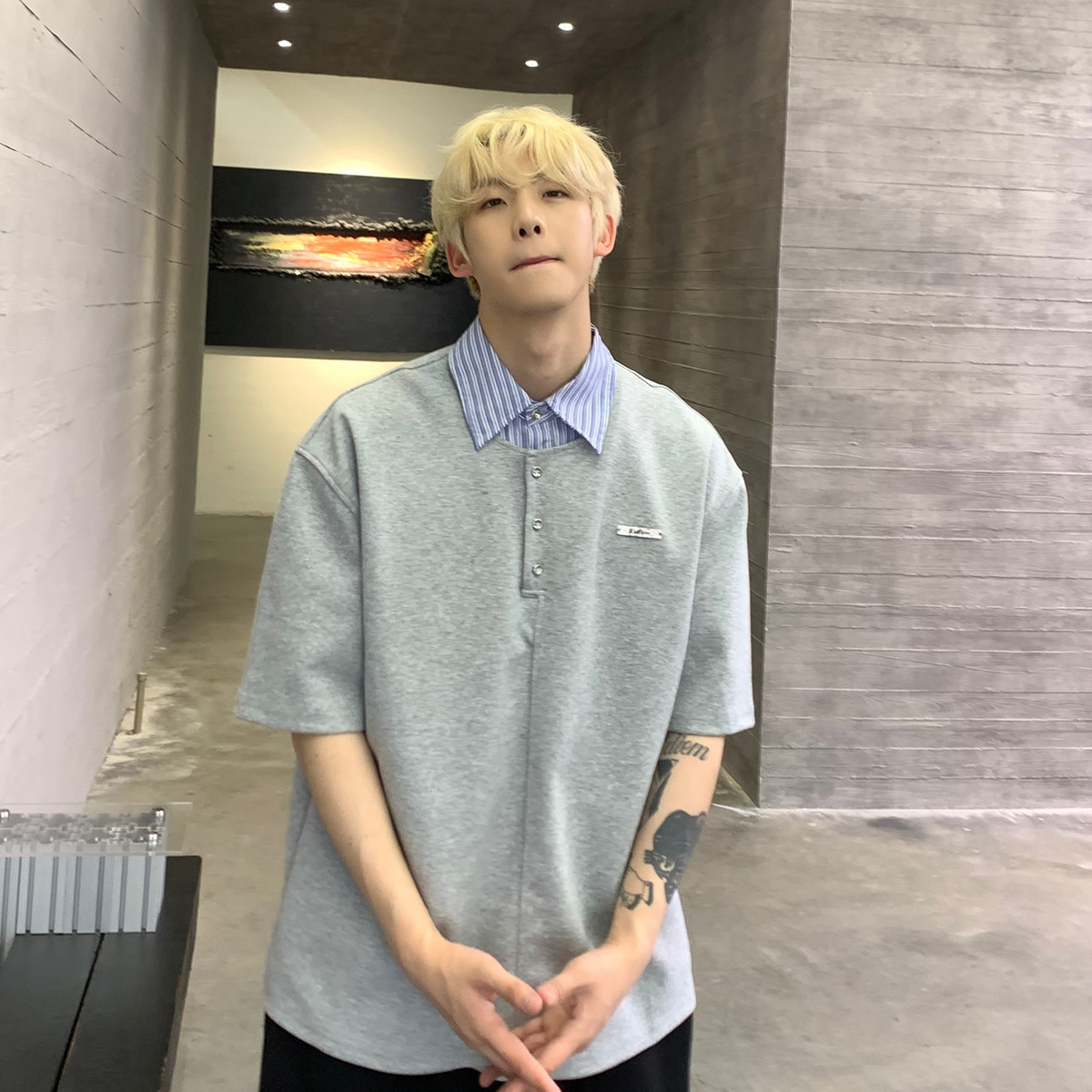 틈새 디자인 센스 스트라이프 랩 스티칭 가짜 투피스 폴로 셔츠 남성 반팔 셔츠 여름 새로운 루즈 탑스토어 가기