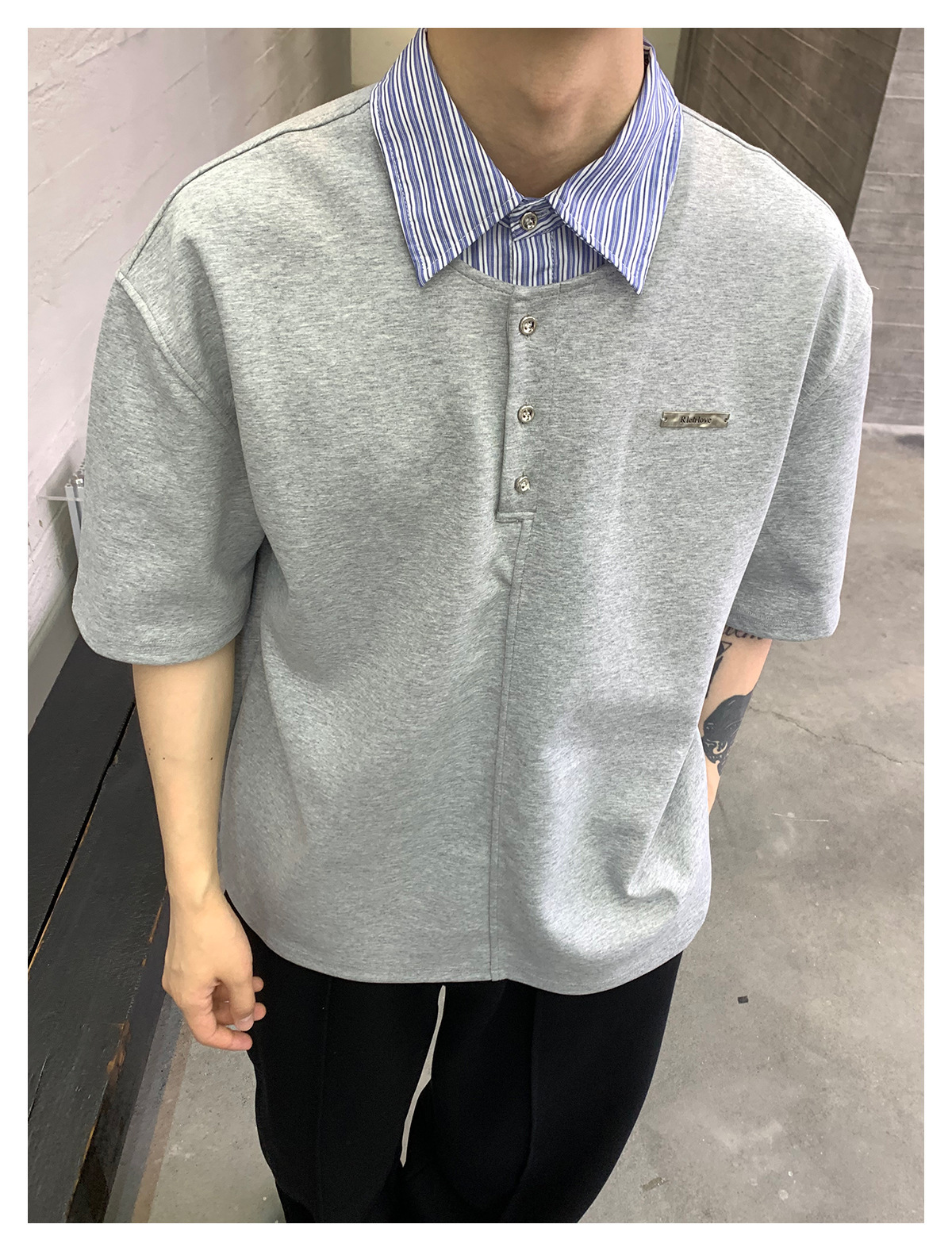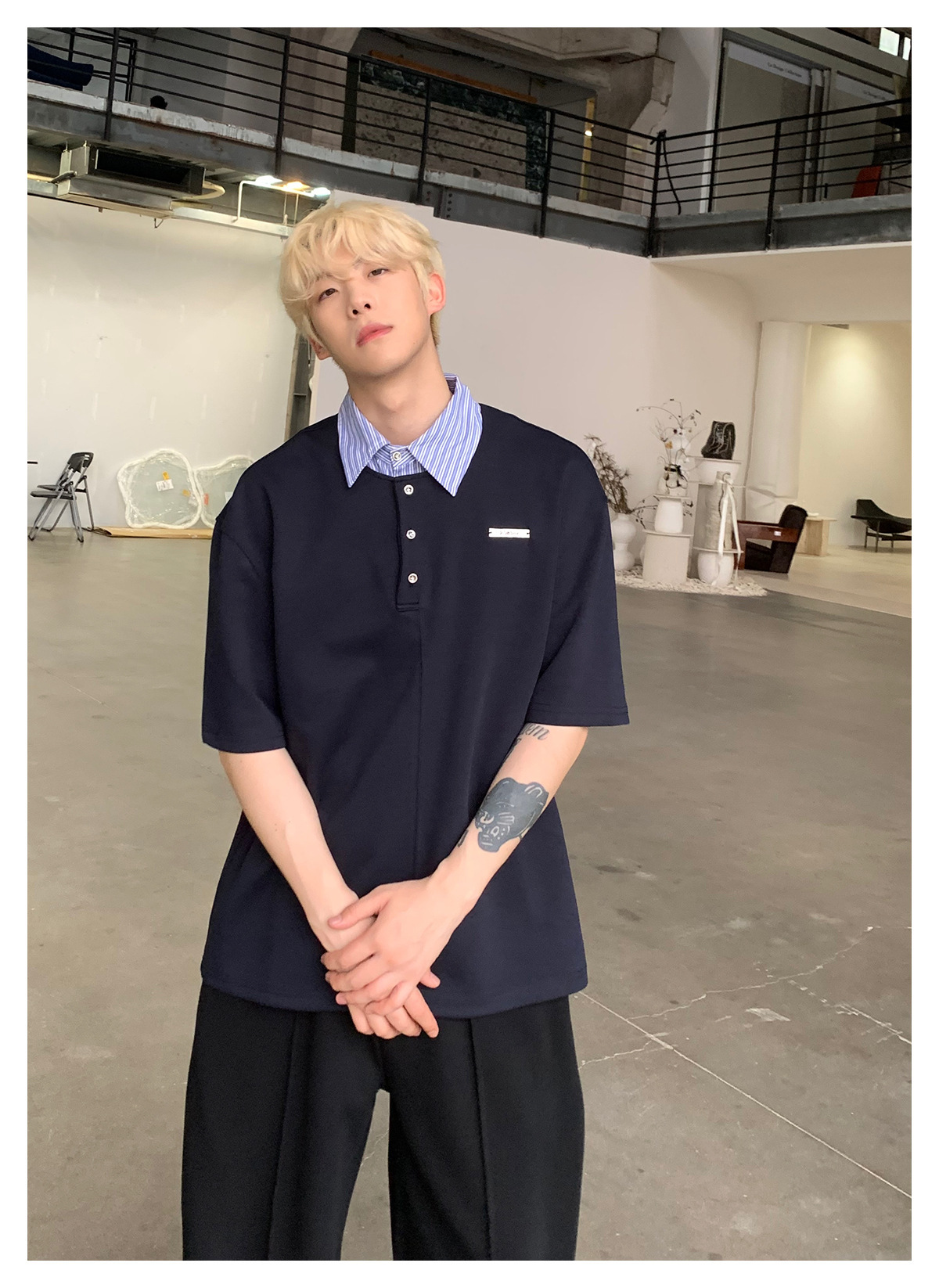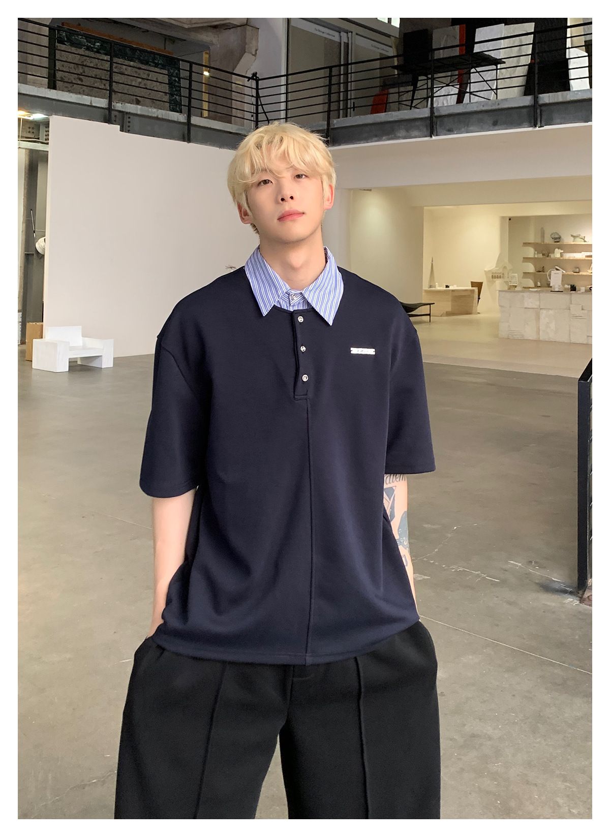 틈새 디자인 센스 스트라이프 랩 스티칭 가짜 투피스 폴로 셔츠 남성 반팔 셔츠 여름 새로운 루즈 탑스토어 가기