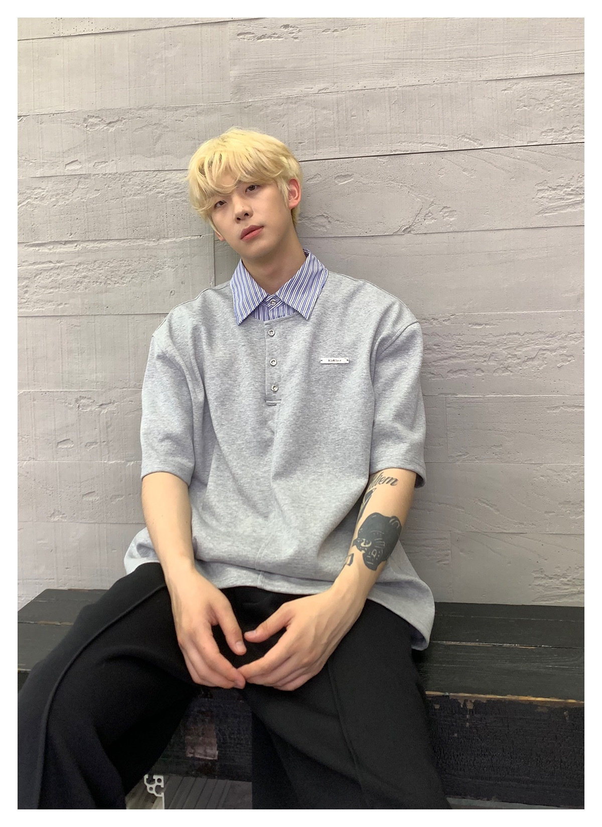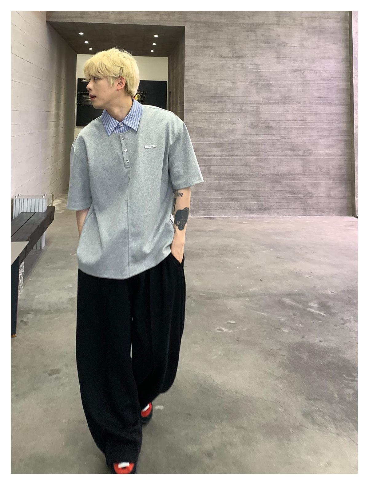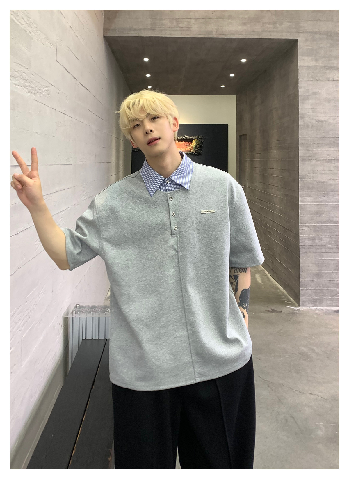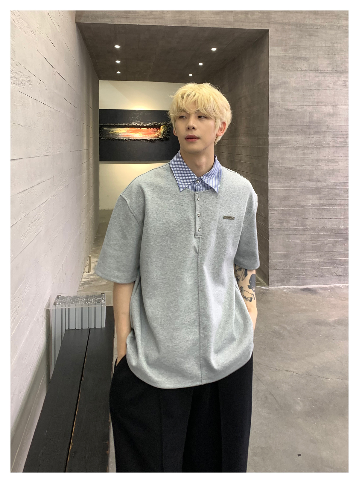 틈새 디자인 센스 스트라이프 랩 스티칭 가짜 투피스 폴로 셔츠 남성 반팔 셔츠 여름 새로운 루즈 탑스토어 가기