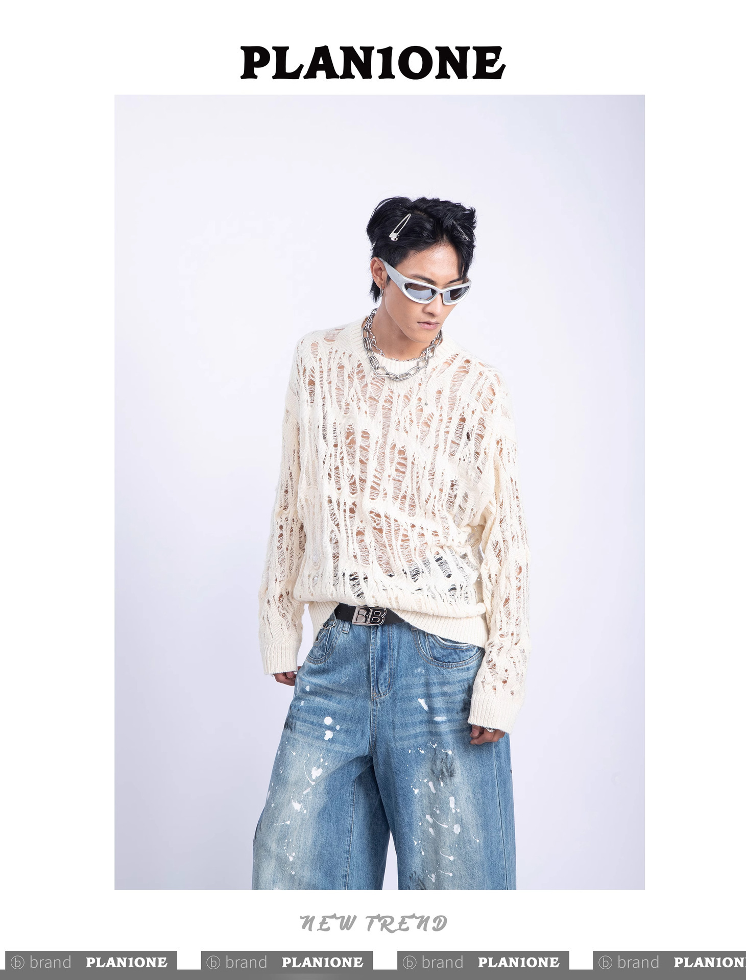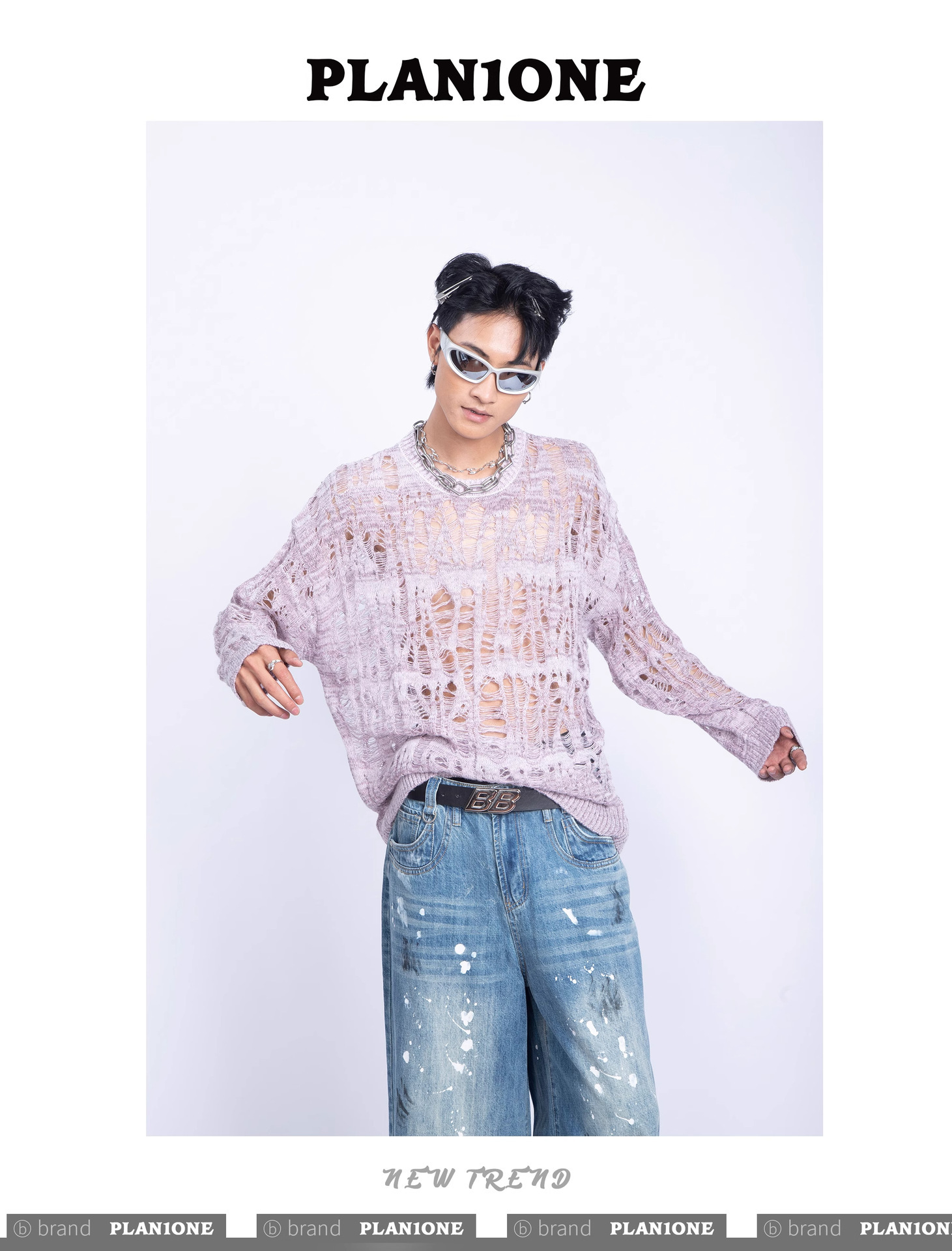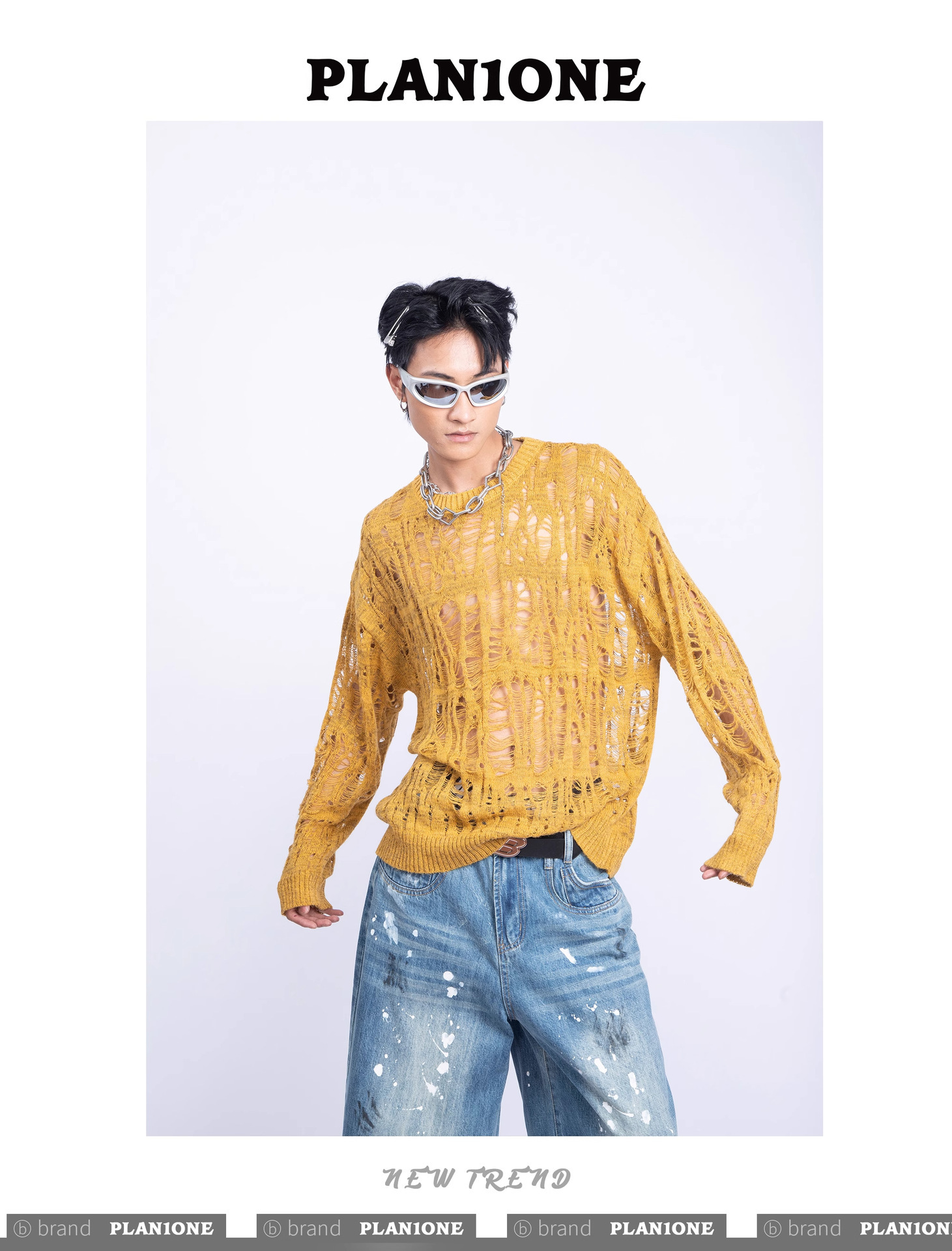 이른 가을 새로운 느슨한 빈 구멍 니트 스웨터 남자 하이 엔드 센스 게으른 선 스크린 프로필 스웨터 캐주얼 탑스토어 가기
