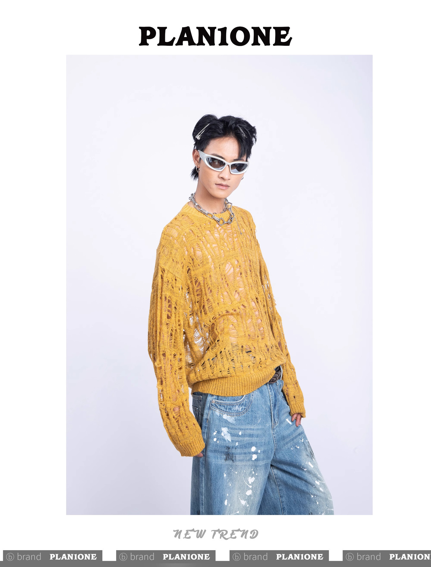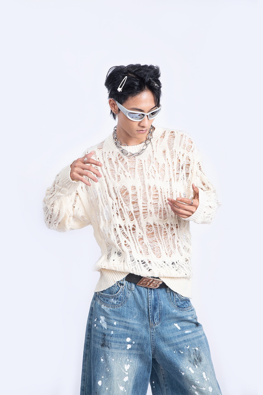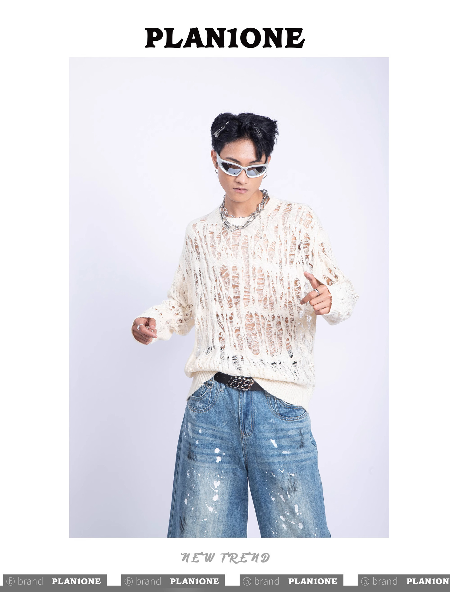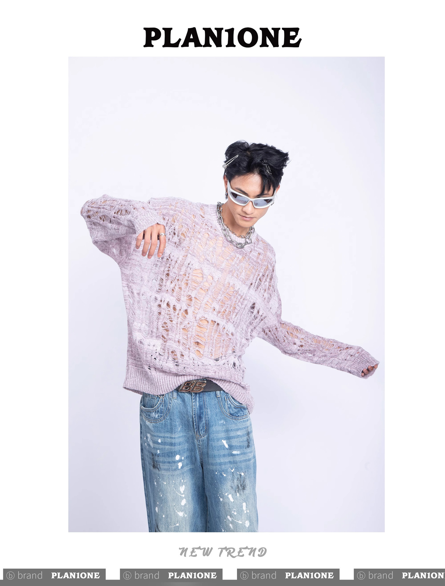 이른 가을 새로운 느슨한 빈 구멍 니트 스웨터 남자 하이 엔드 센스 게으른 선 스크린 프로필 스웨터 캐주얼 탑스토어 가기