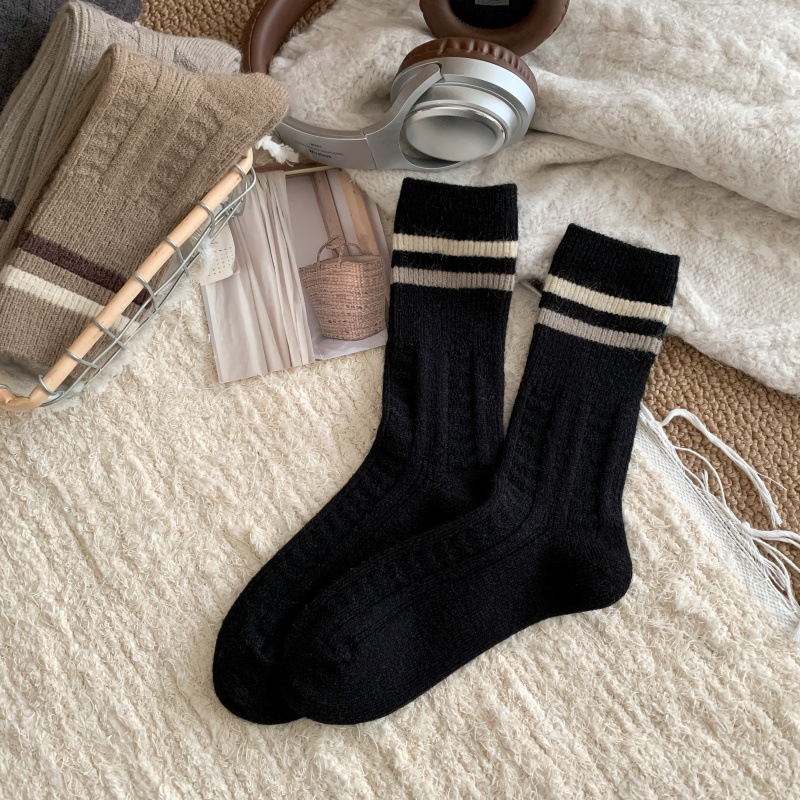두꺼운 양말 여성 봄, 가을 따뜻한 양모 양말 중반 송아지 양말 플러스 벨벳 두꺼운 캐시미어 양말 줄무늬 스타킹 스타킹