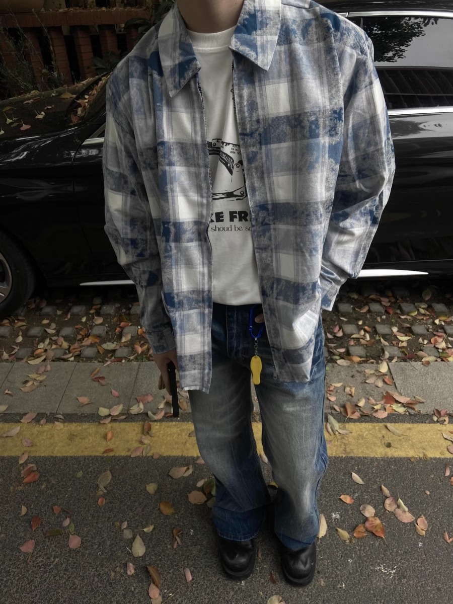 레트로 얼룩덜룩 한 블루 격자 무늬 지퍼 셔츠 봄과 가을 새로운 느슨한 틈새 발견 클렌핏 재킷스토어 가기