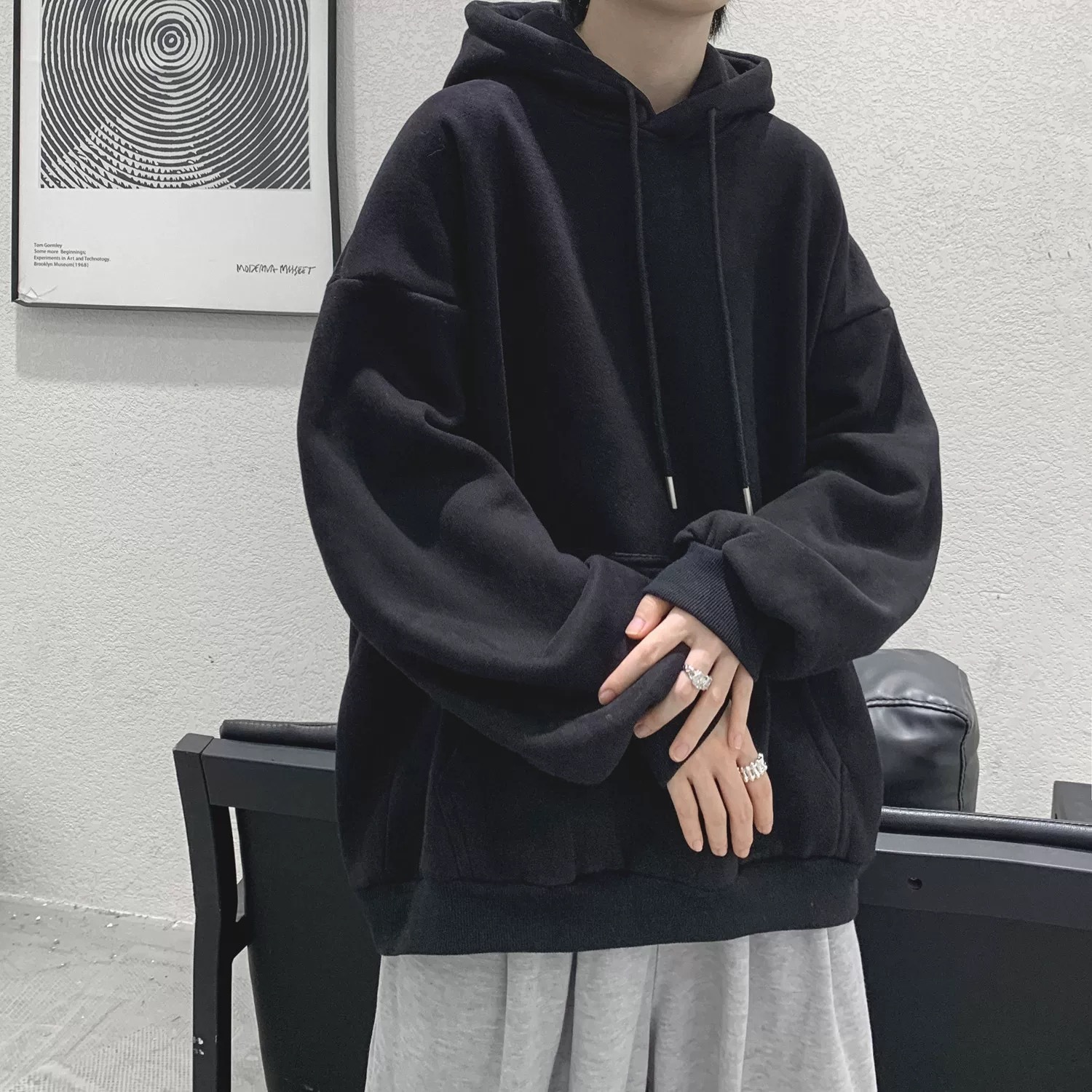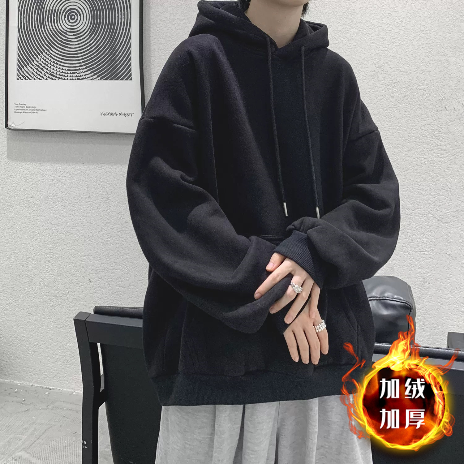 • 블랙 후드 스웨트셔츠와 벨벳 스타일 - 솔리드 컬러 [GL]
