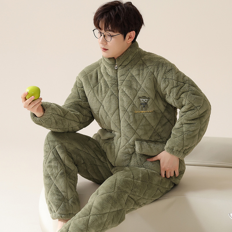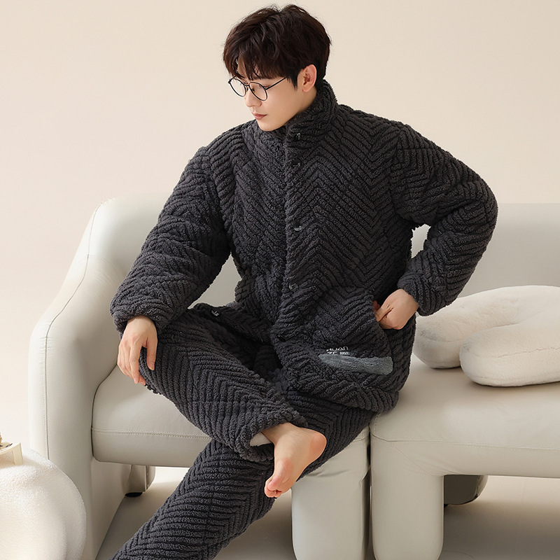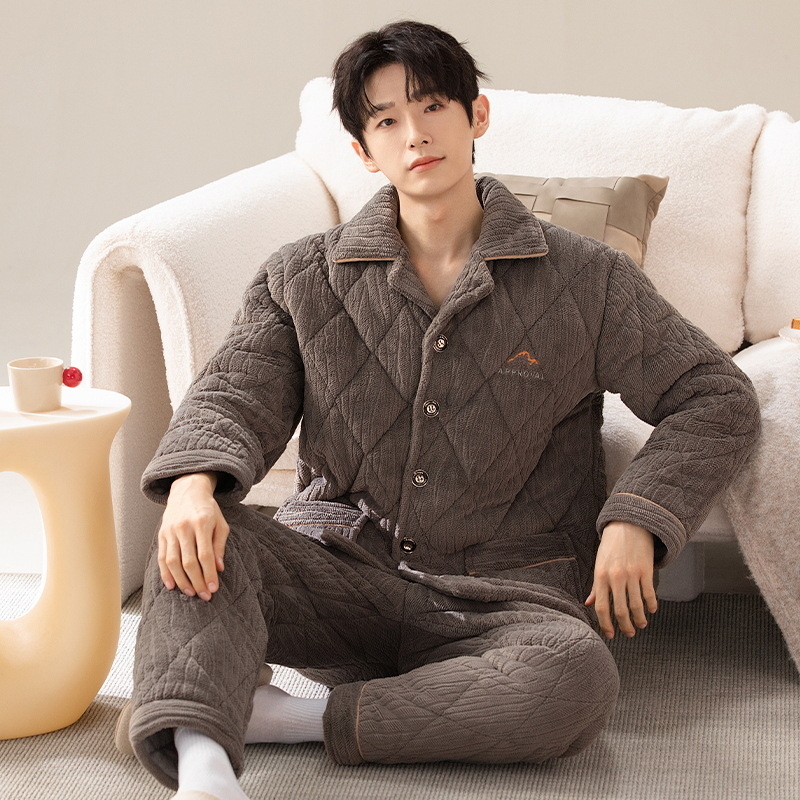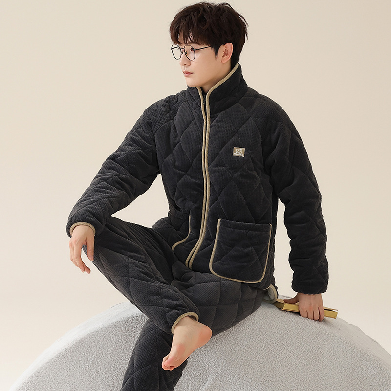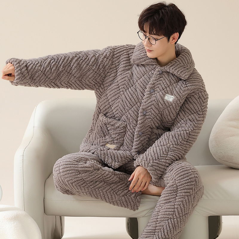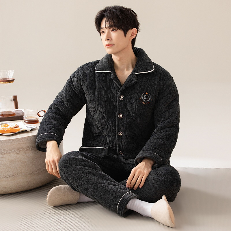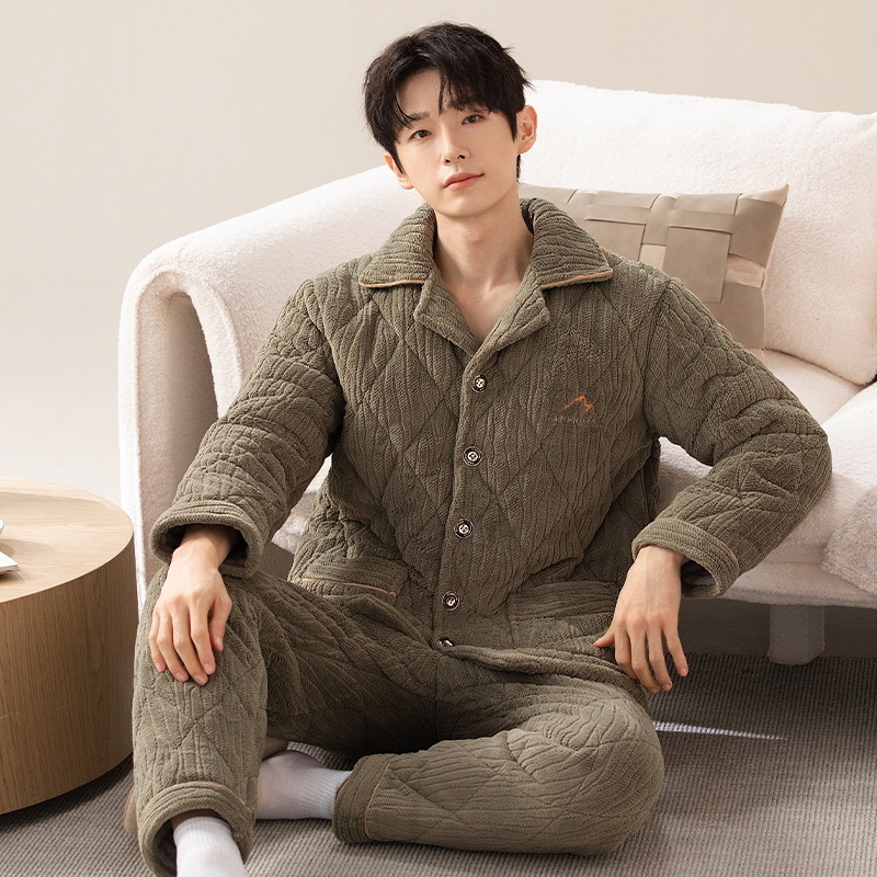 두꺼운 기모 겨울 남자 퀼트 플란넬 긴 소매 잠옷 카디건 따뜻한 세트 가을과 겨울 홈 옷