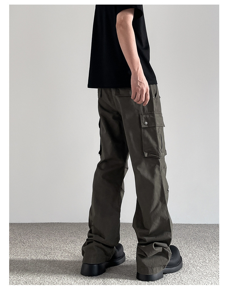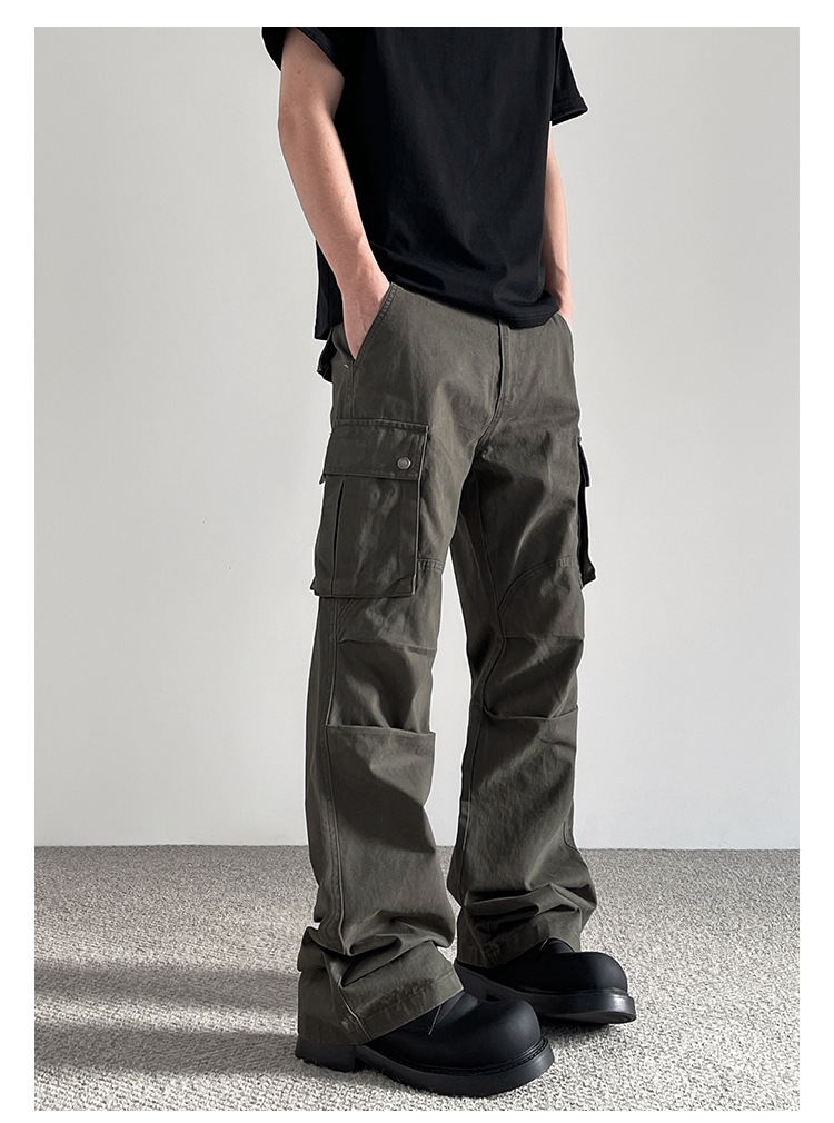 하이 스트리트 바이브 주름 낙하산 병 바지 남성 봄과 가을 미국 스타일 레트로 멀티 포켓 스트레이트 마이크로 캐주얼 바지