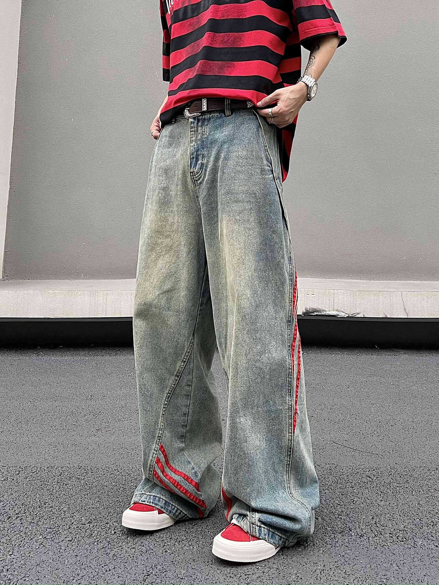 아메리칸 스타일 레트로 하이 스트리트 스트라이프 대비 컬러 스티칭 작업복 와이드 레그 청바지 남성용 트렌디 한 브랜드 루즈 스트레이트 캐주얼 바지