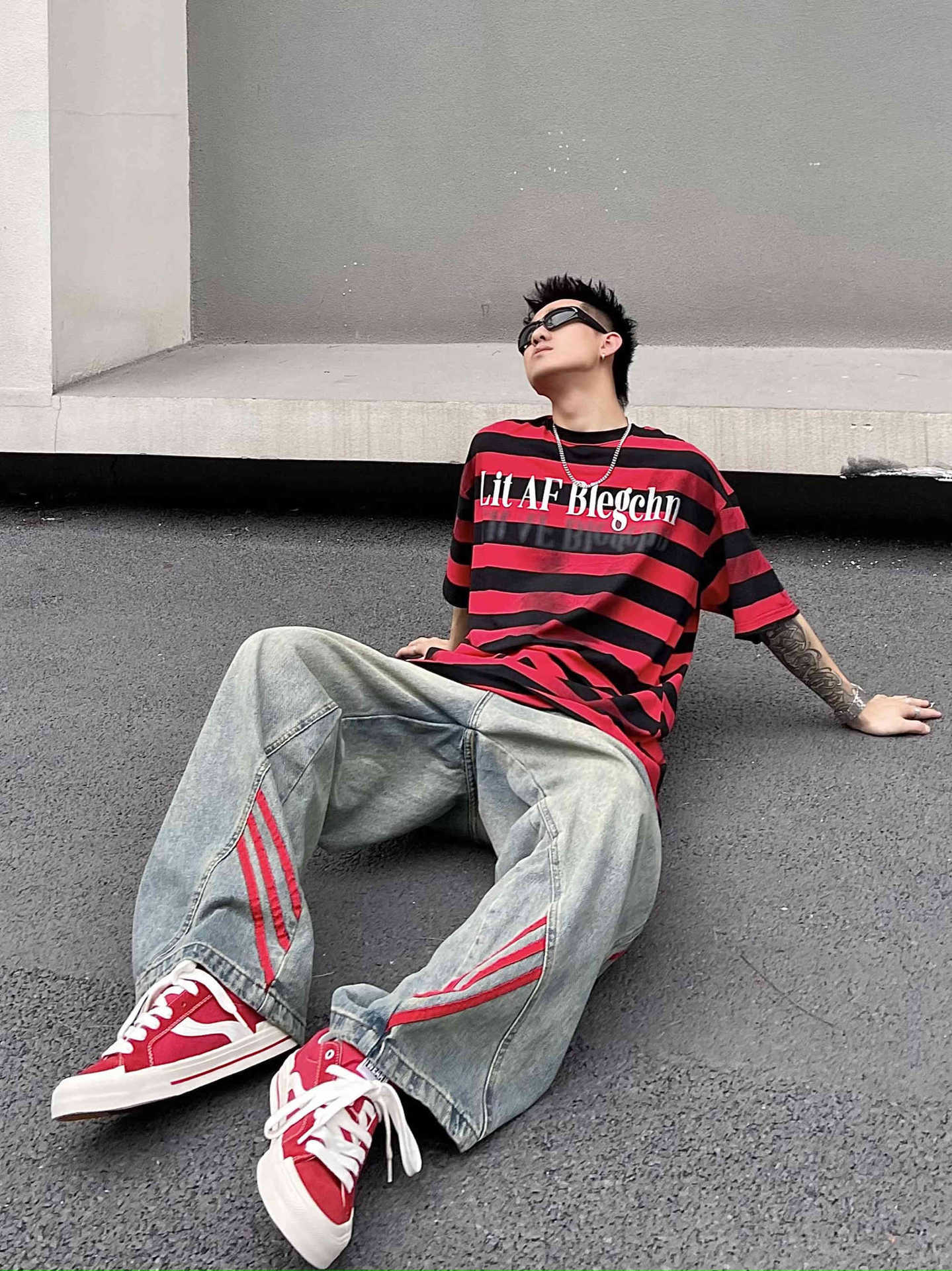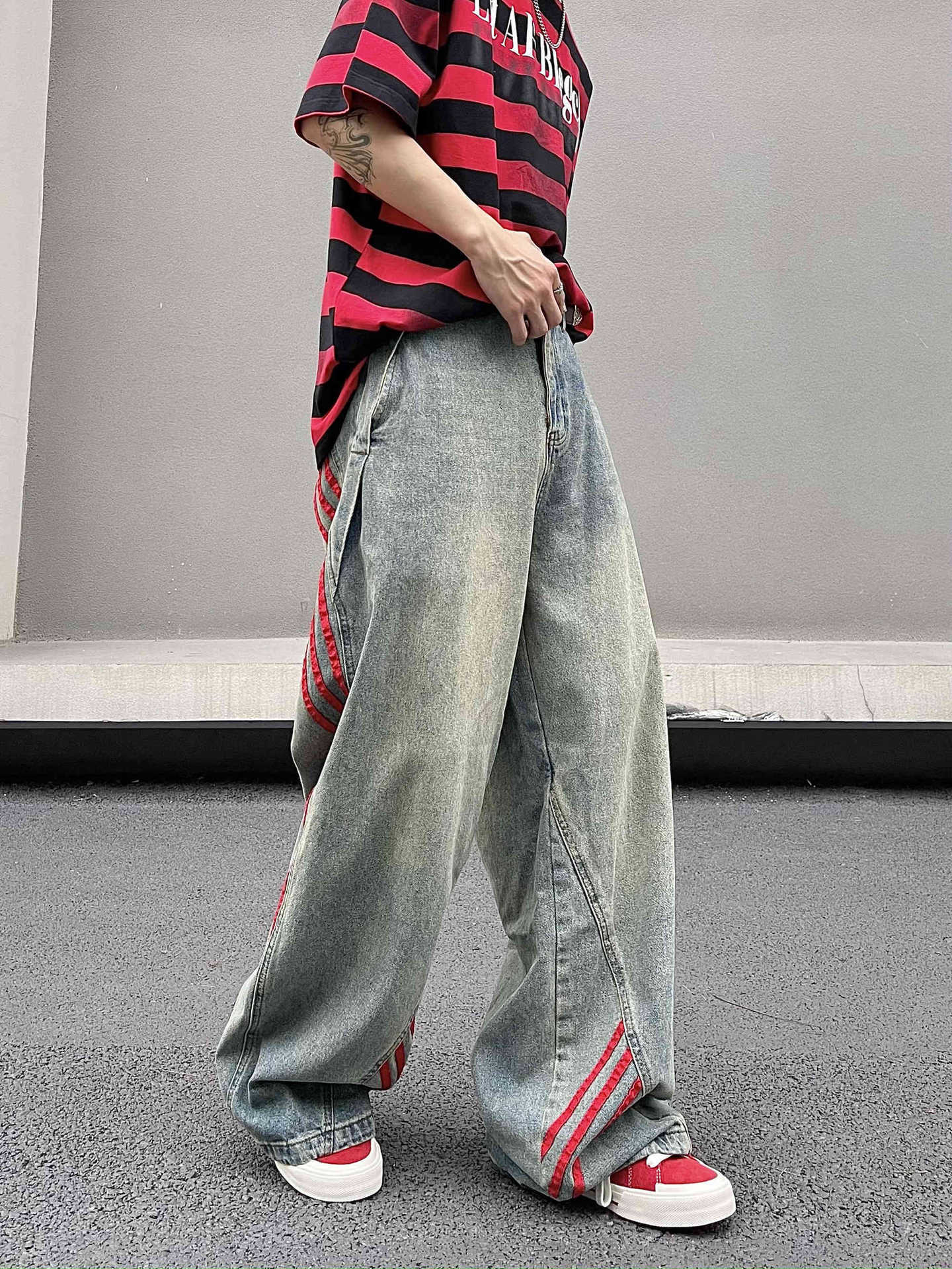 아메리칸 스타일 레트로 하이 스트리트 스트라이프 대비 컬러 스티칭 작업복 와이드 레그 청바지 남성용 트렌디 한 브랜드 루즈 스트레이트 캐주얼 바지스토어 가기