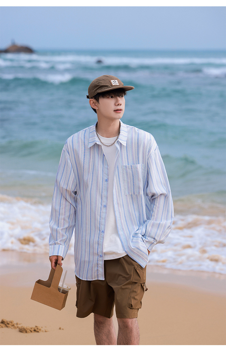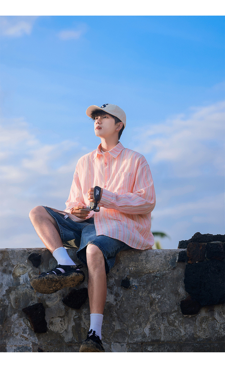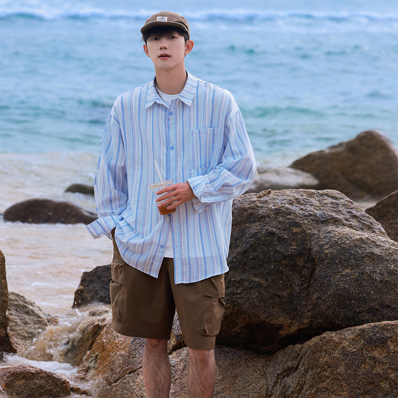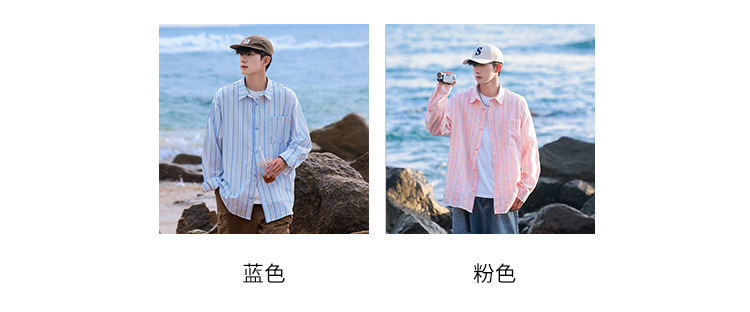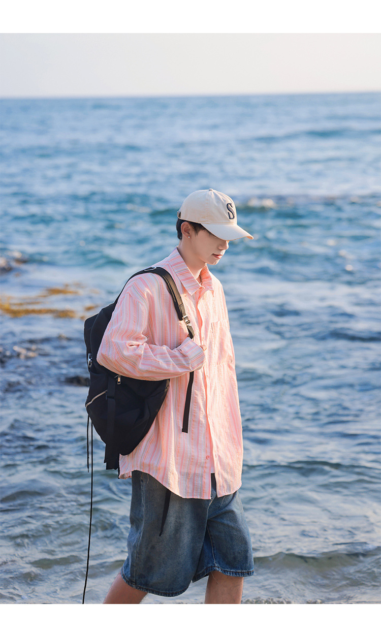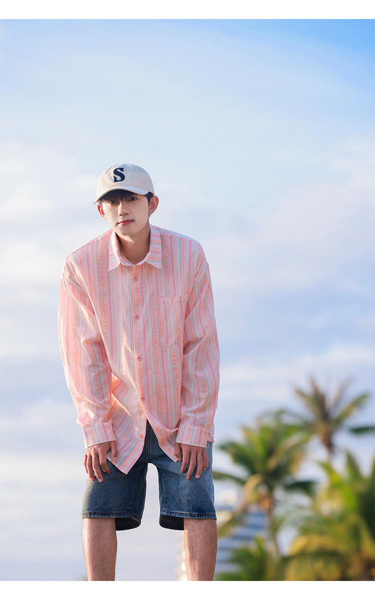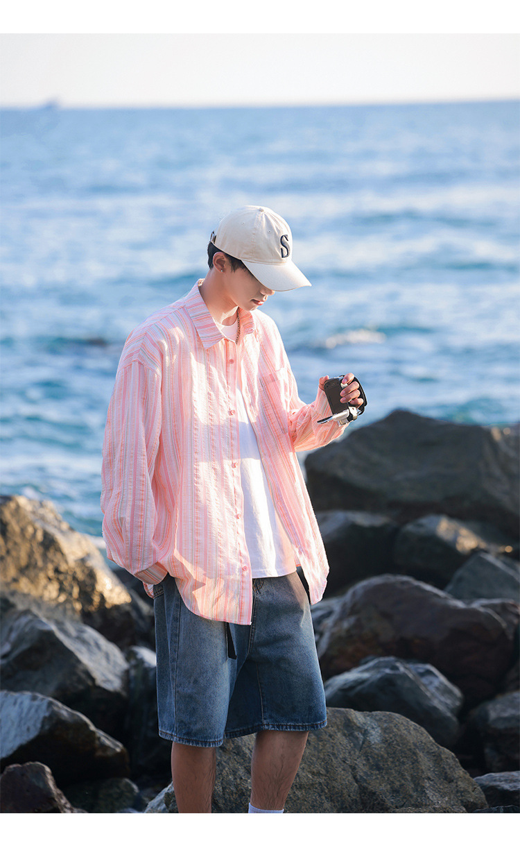 첫사랑 핑크 줄무늬 셔츠 남자 여름 2024 새로운 느슨한 캐주얼 선 스크린 긴 소매 코트 탑스토어 가기
