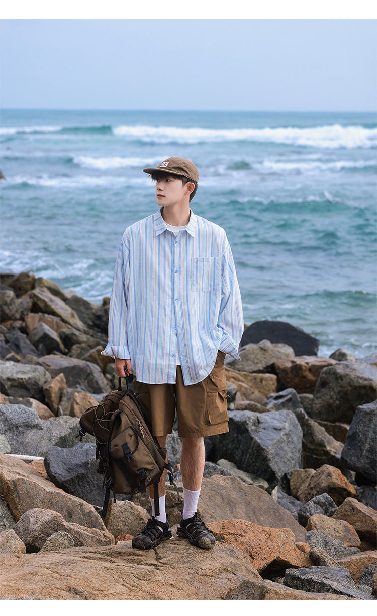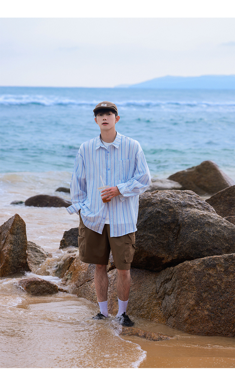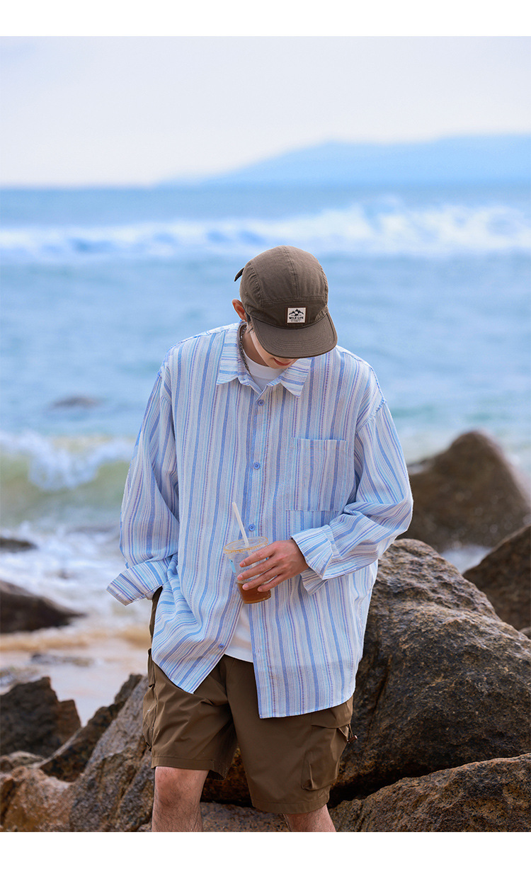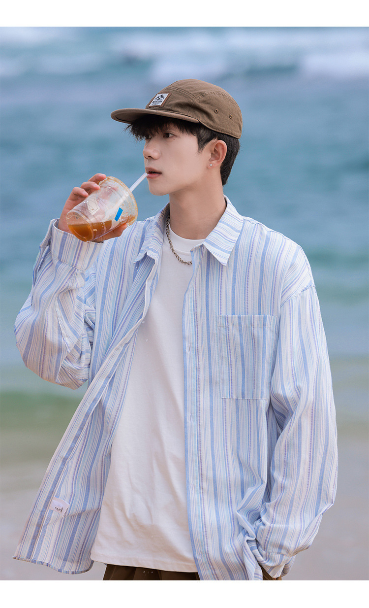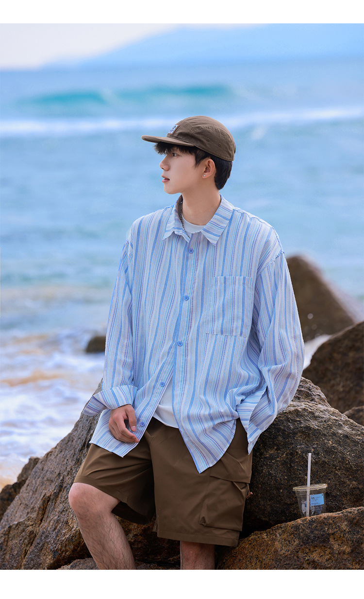 첫사랑 핑크 줄무늬 셔츠 남자 여름 2024 새로운 느슨한 캐주얼 선 스크린 긴 소매 코트 탑스토어 가기