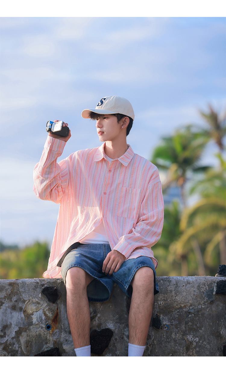첫사랑 핑크 줄무늬 셔츠 남자 여름 2024 새로운 느슨한 캐주얼 선 스크린 긴 소매 코트 탑