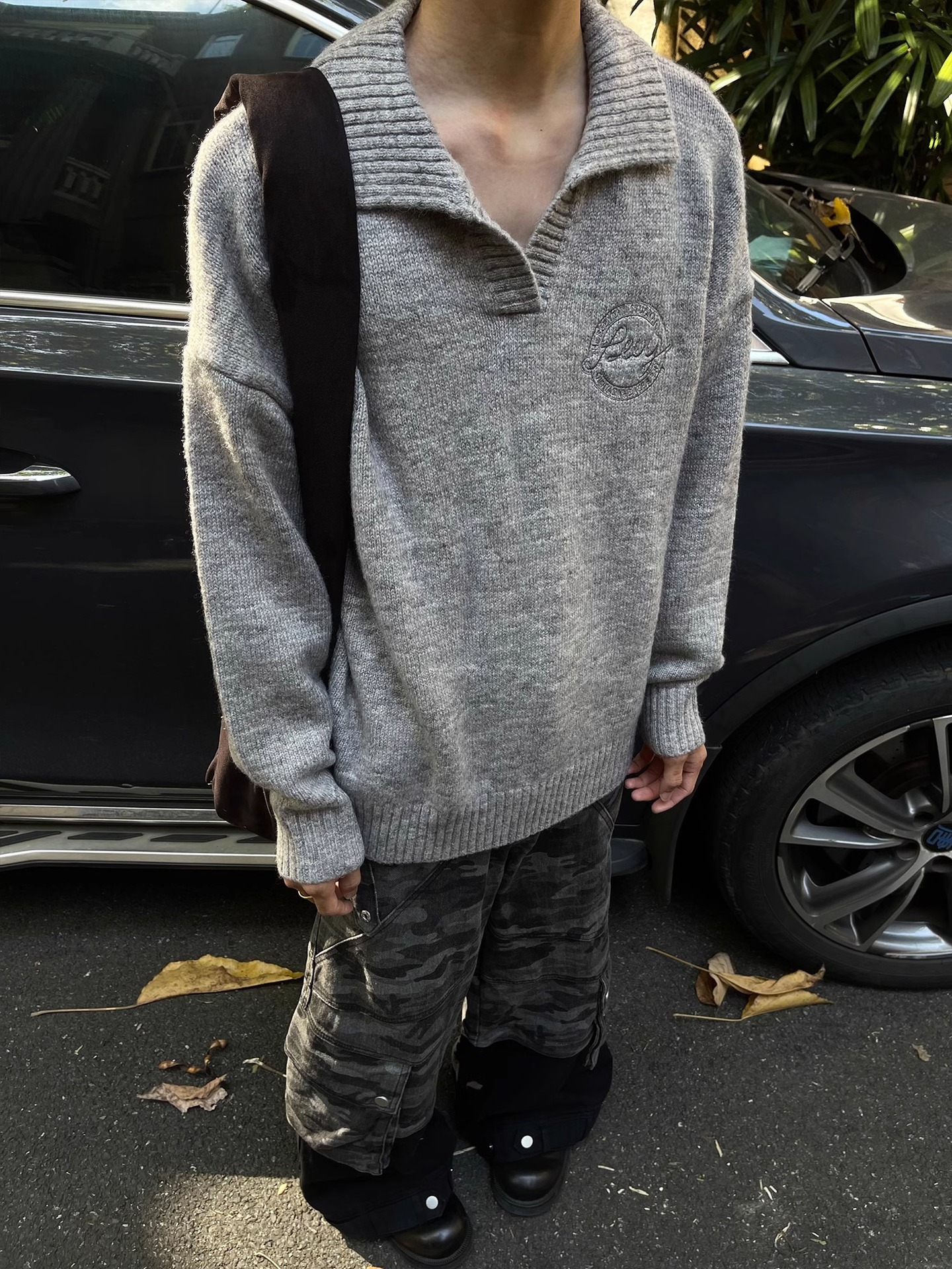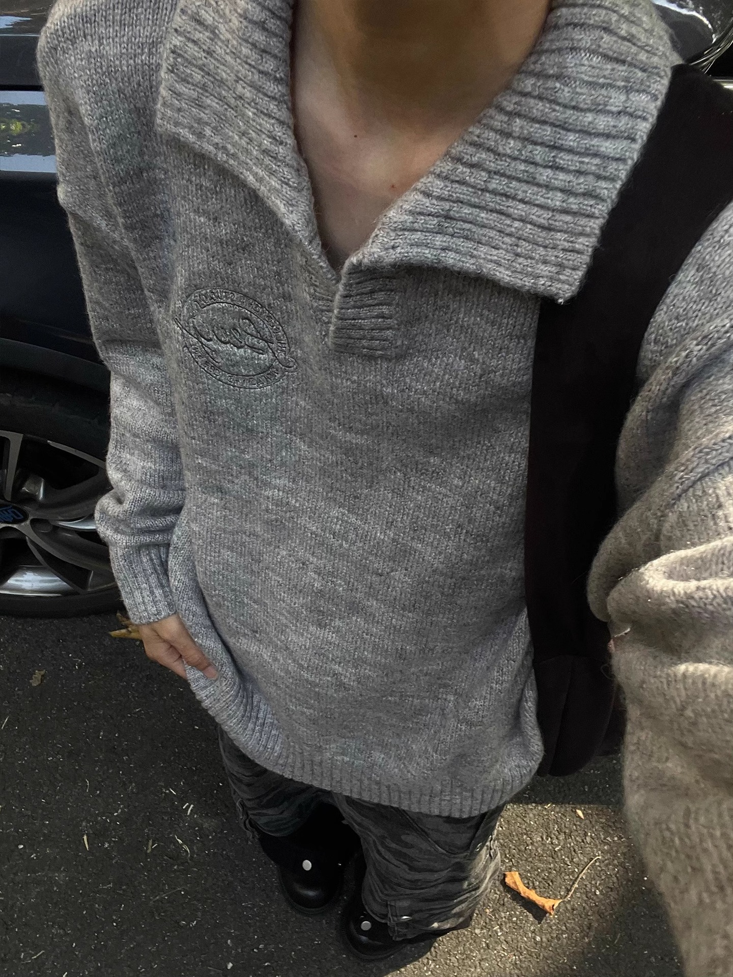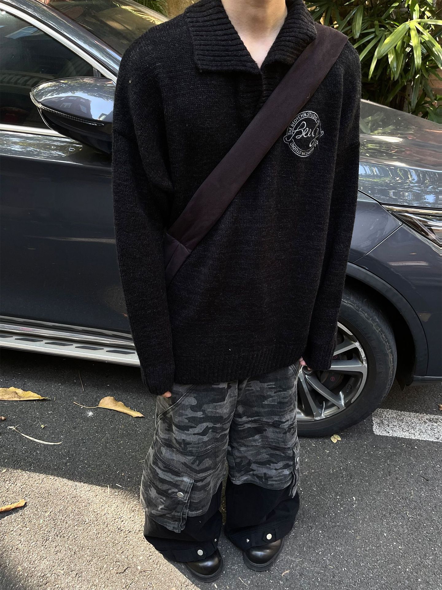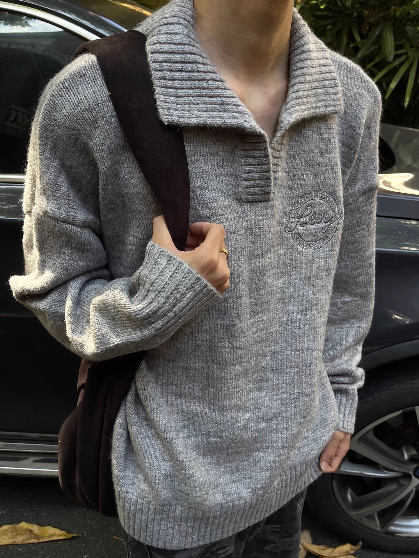 빈티지 자수 디자인 폴로 칼라 스웨터 남자의 가을과 겨울 새로운 캐주얼 게으른 스타일 느슨한 니트 탑