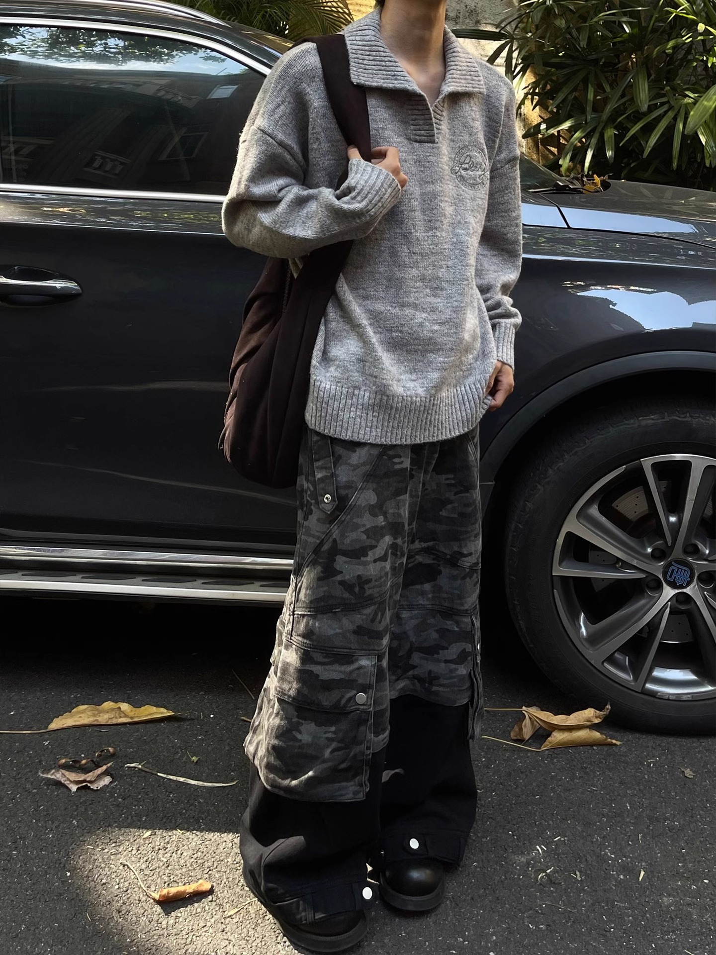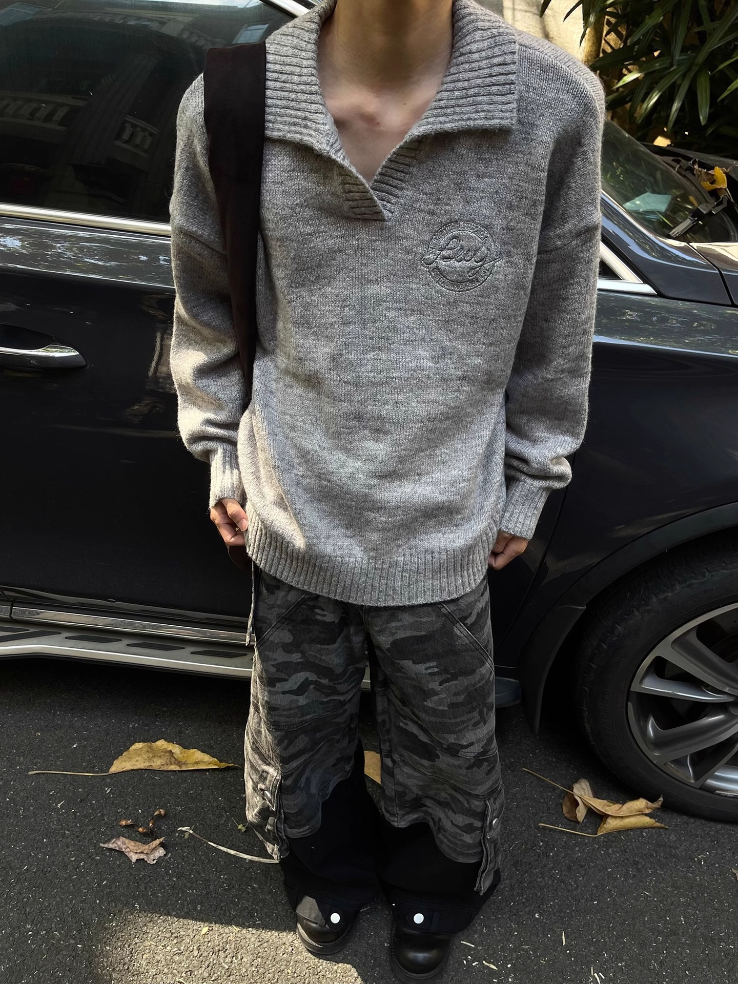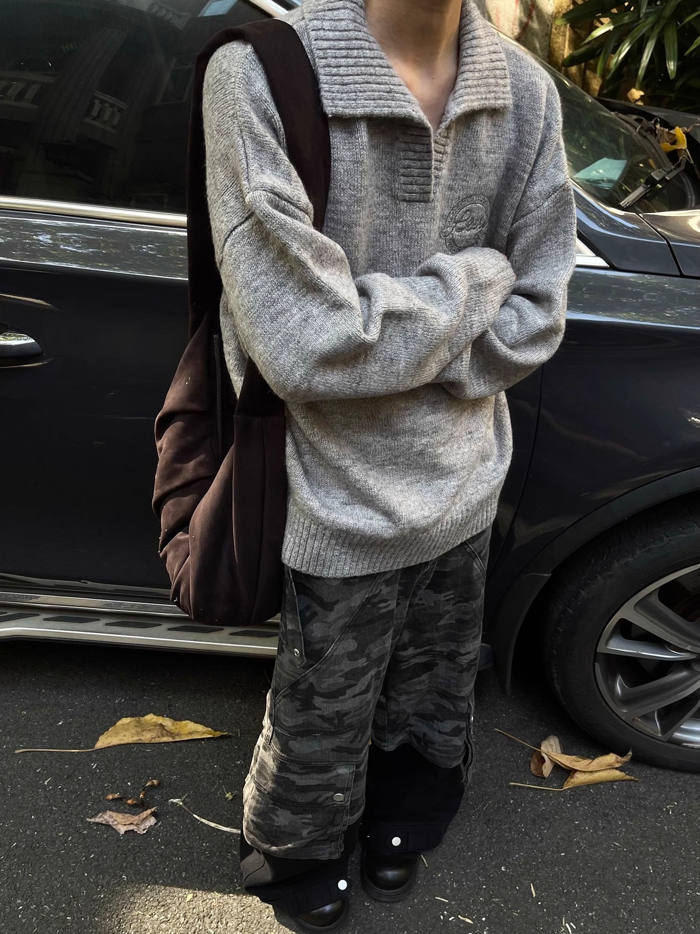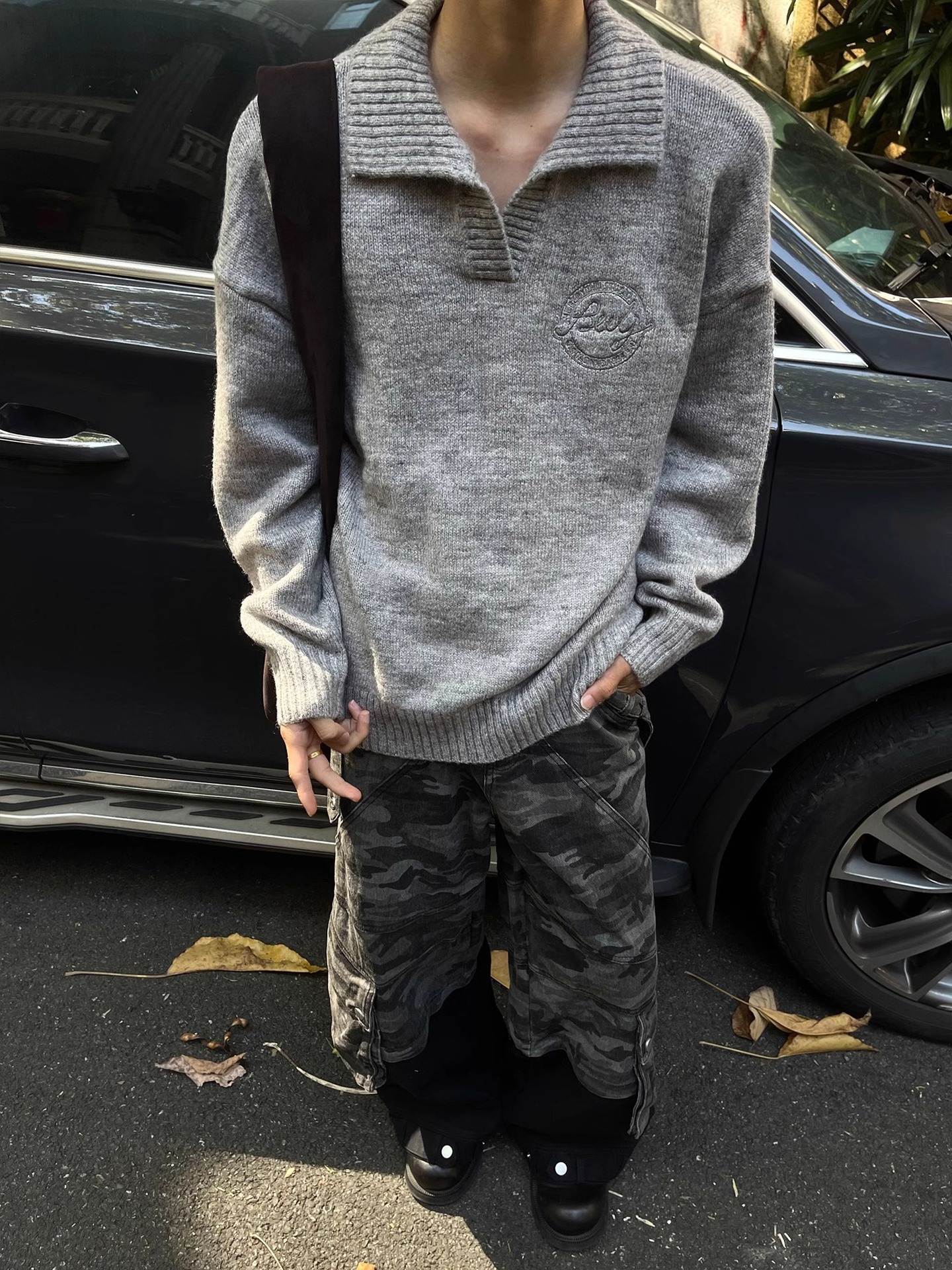 빈티지 자수 디자인 폴로 칼라 스웨터 남자의 가을과 겨울 새로운 캐주얼 게으른 스타일 느슨한 니트 탑