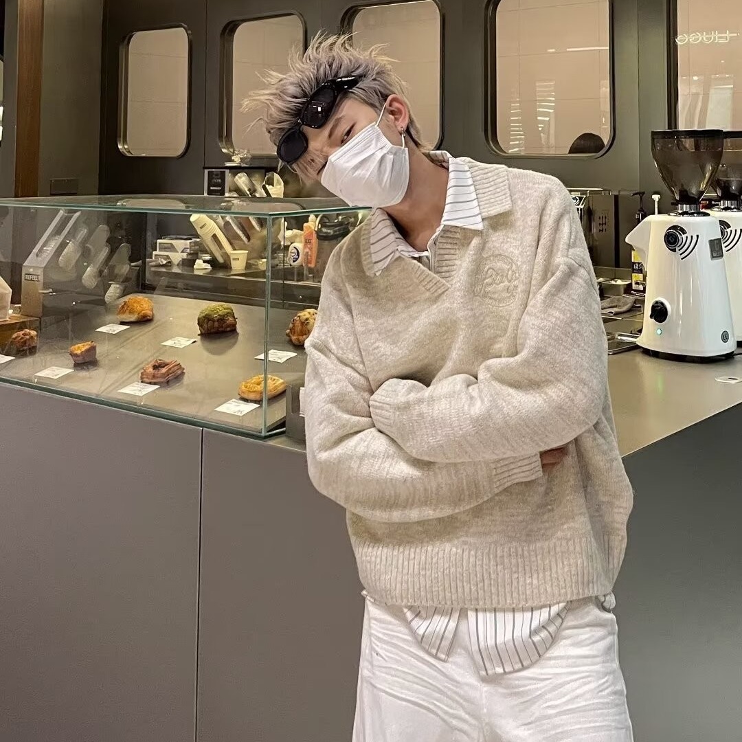 빈티지 자수 디자인 폴로 칼라 스웨터 남자의 가을과 겨울 새로운 캐주얼 게으른 스타일 느슨한 니트 탑스토어 가기