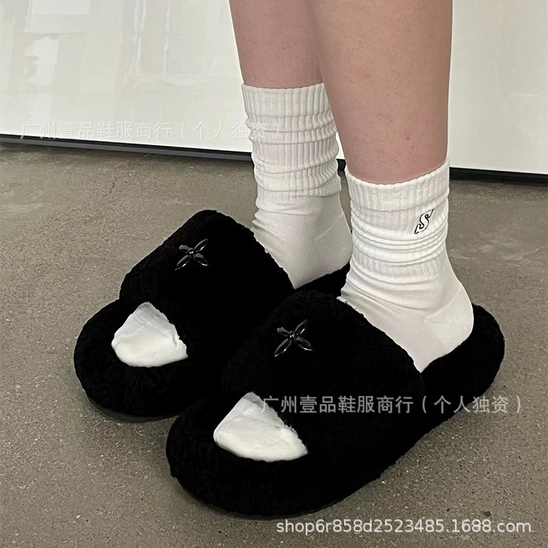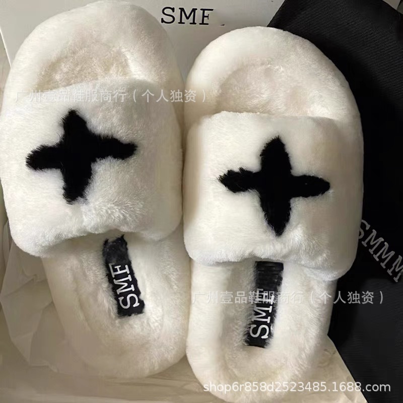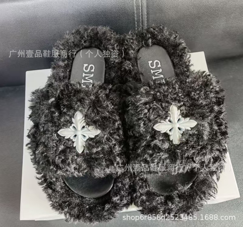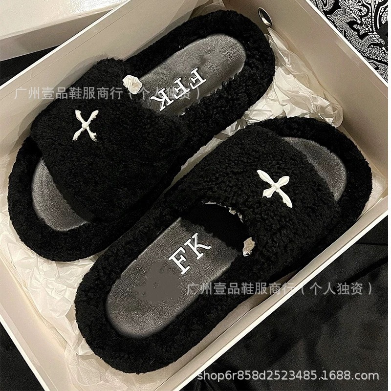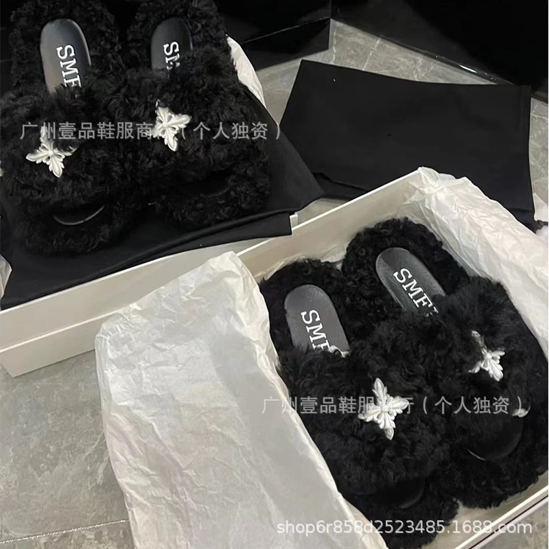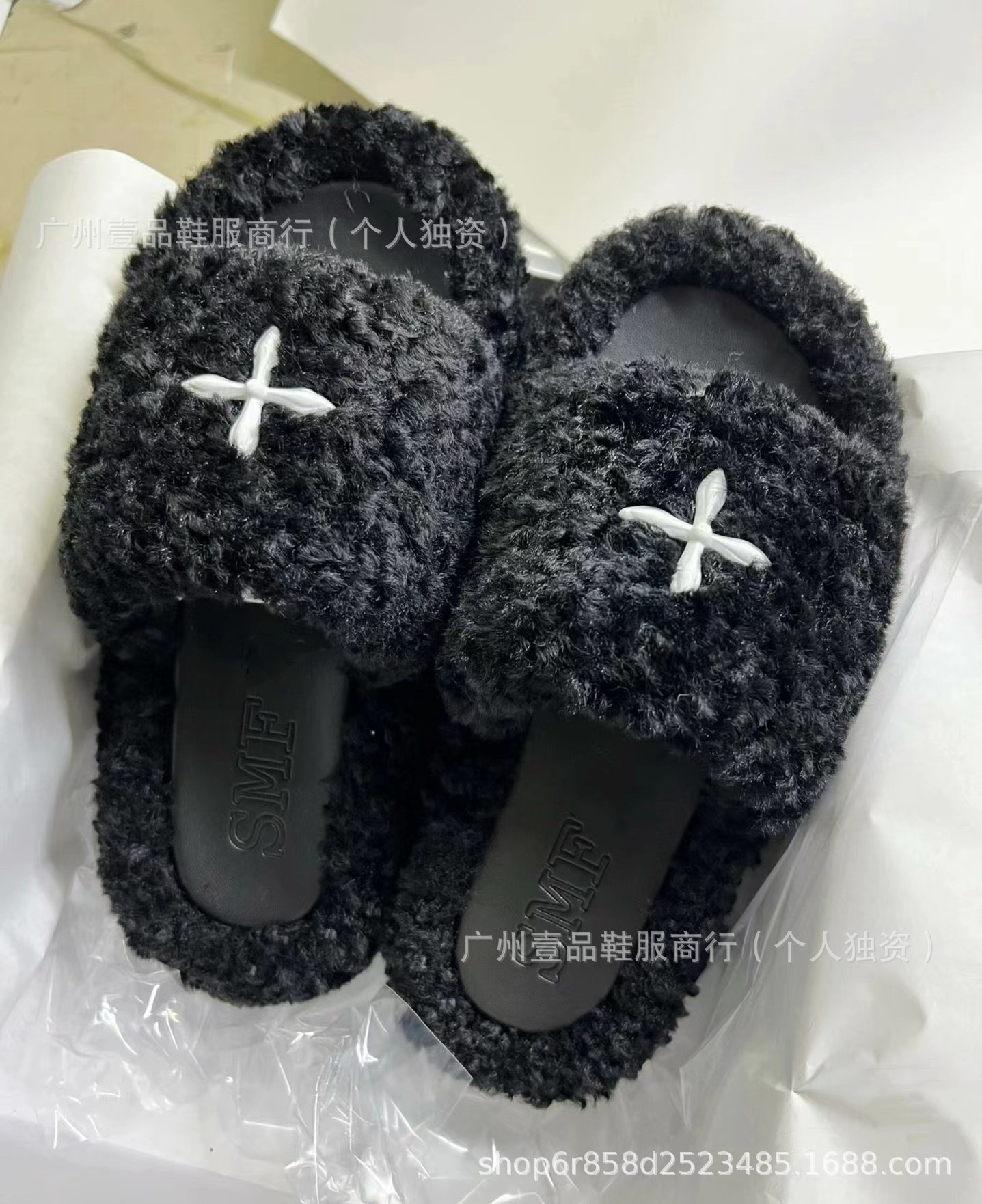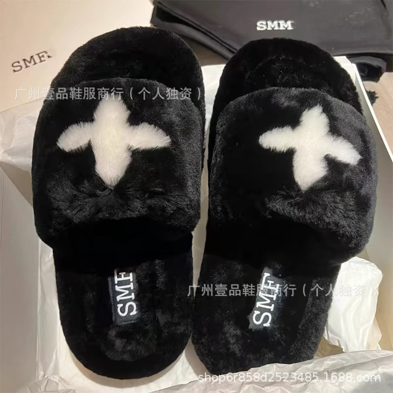 하이 퀄리티 SK 블랙 및 화이트 벨벳 모피 슬리퍼 십자형 두꺼운 하단 블랙 풍선 가죽 슬리퍼
