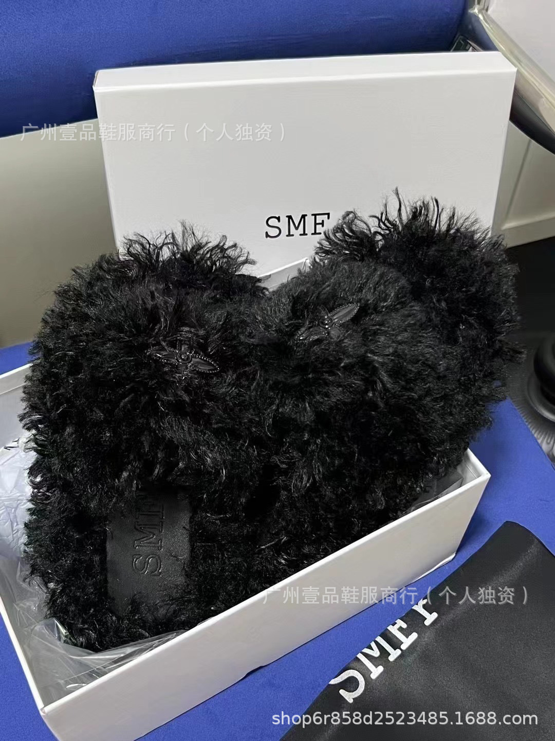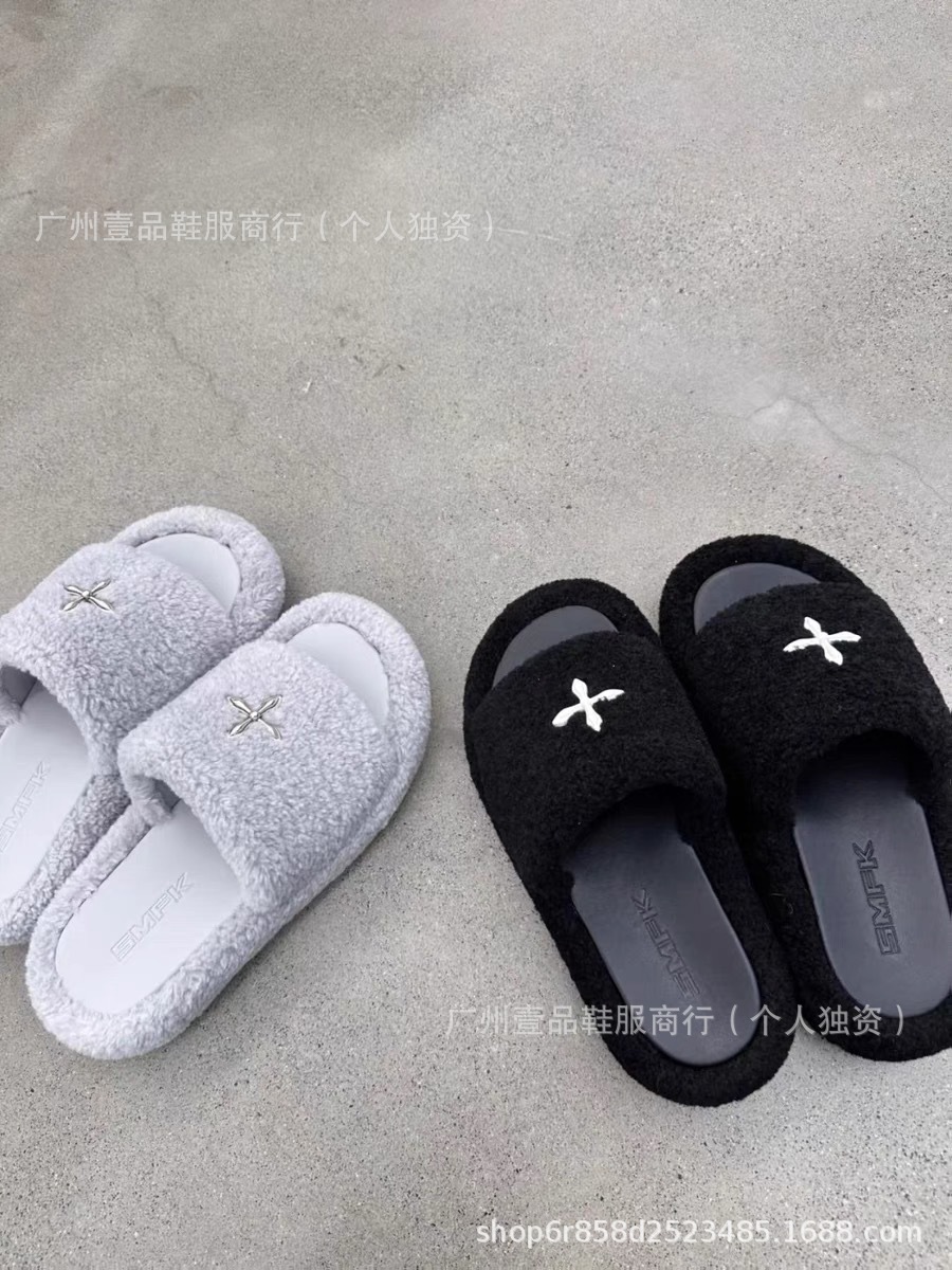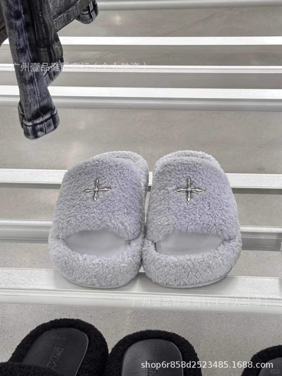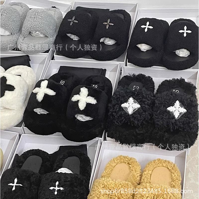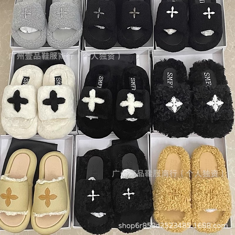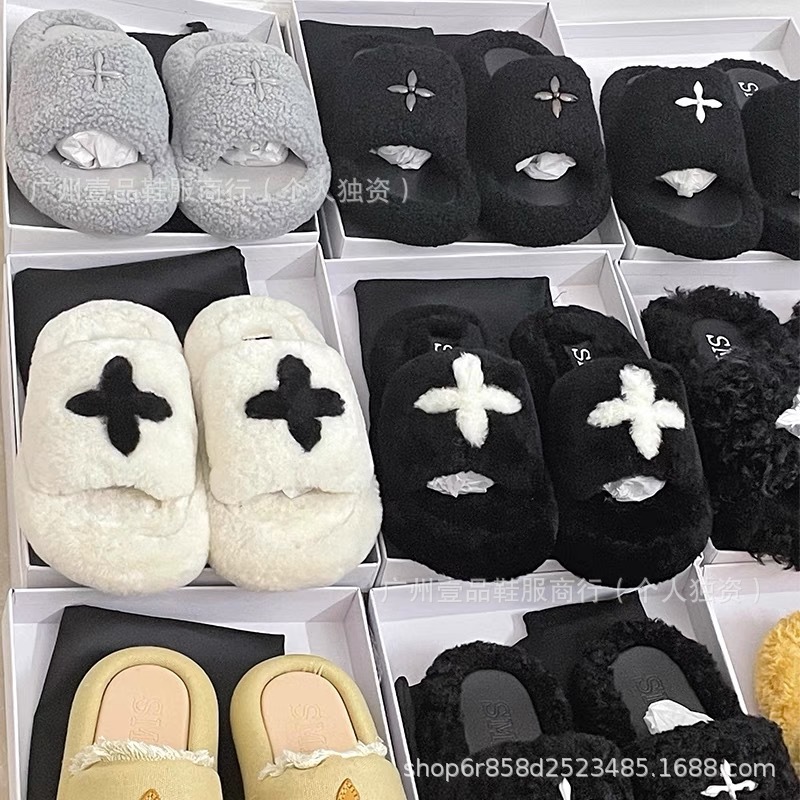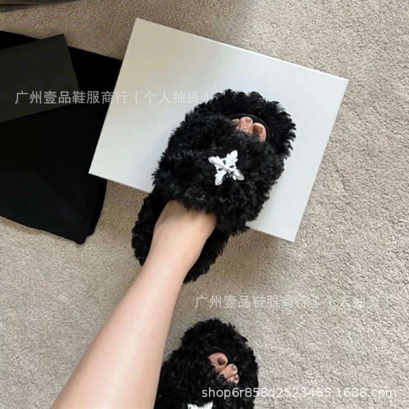 하이 퀄리티 SK 블랙 및 화이트 벨벳 모피 슬리퍼 십자형 두꺼운 하단 블랙 풍선 가죽 슬리퍼