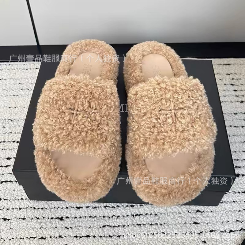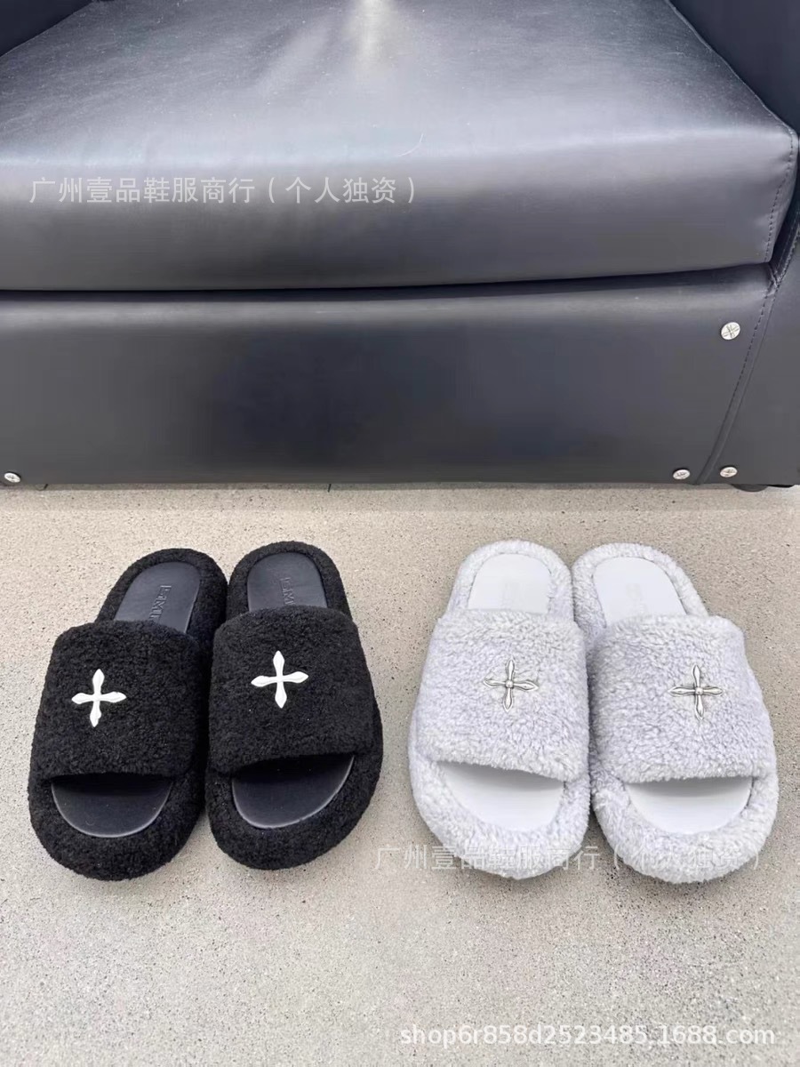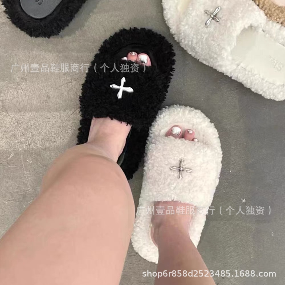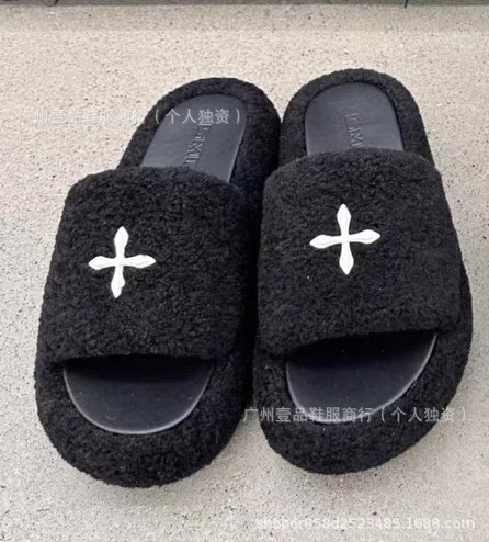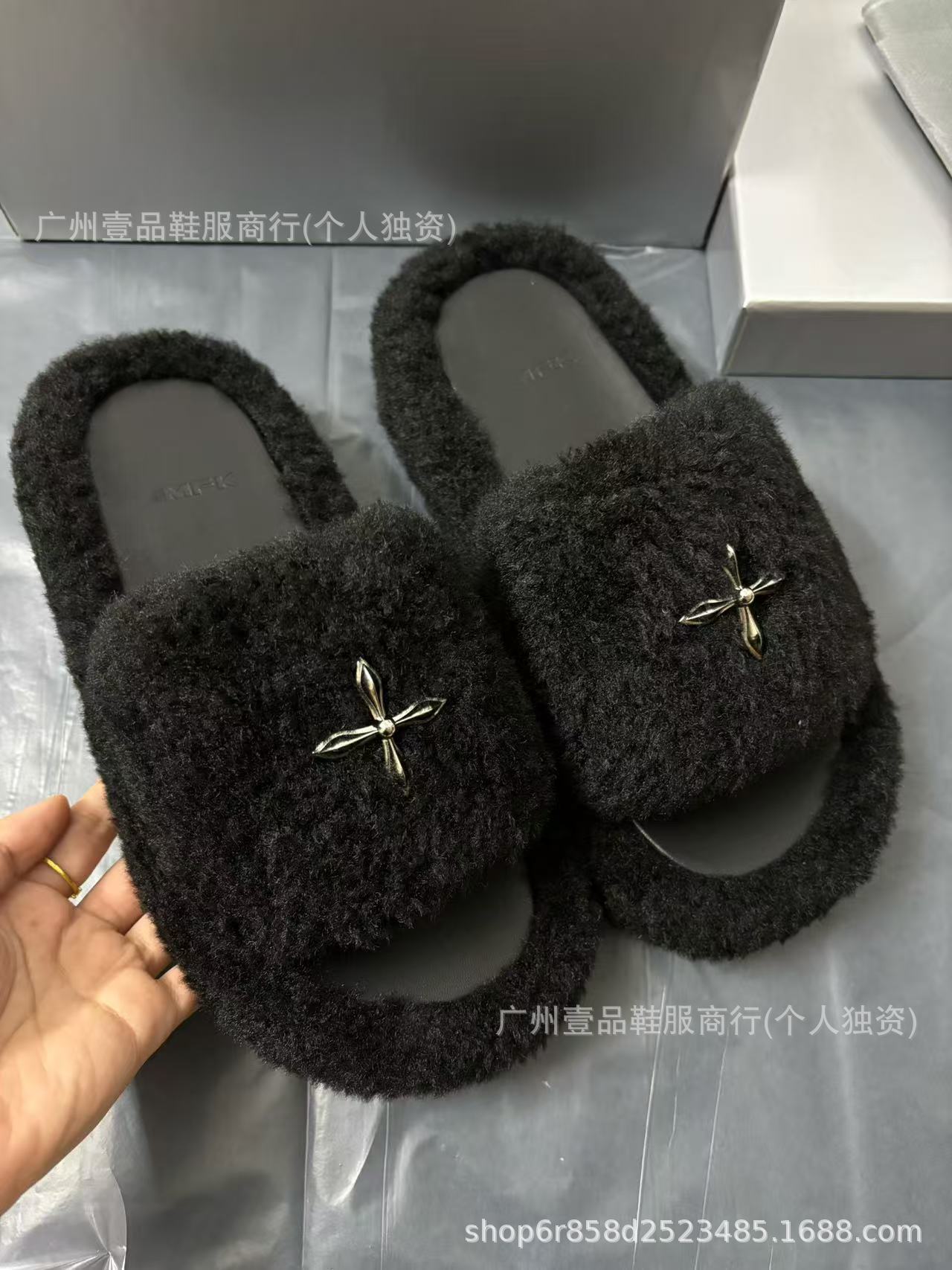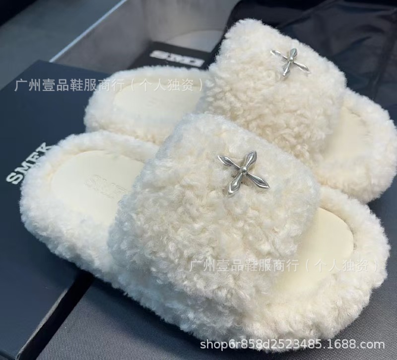 하이 퀄리티 SK 블랙 및 화이트 벨벳 모피 슬리퍼 십자형 두꺼운 하단 블랙 풍선 가죽 슬리퍼