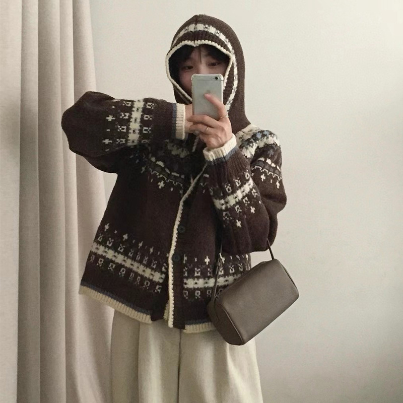페어 아일 스웨터 여성 자켓 후드 니트 카디건 2025 가을, 겨울 새로운 복고풍 한국 스타일 게으른 스타일 겉옷