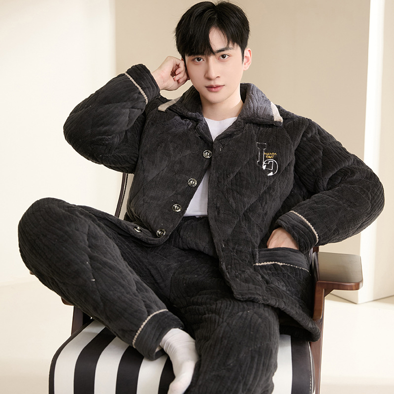겨울 남자 3 층 플란넬 퀼트 파자마 산호 양털 두꺼운 따뜻한 집 옷 세트 면면 재킷 착용