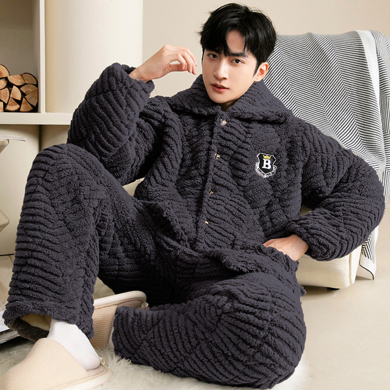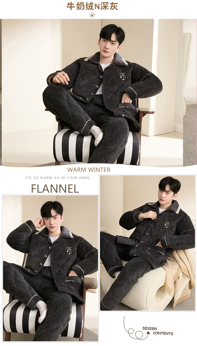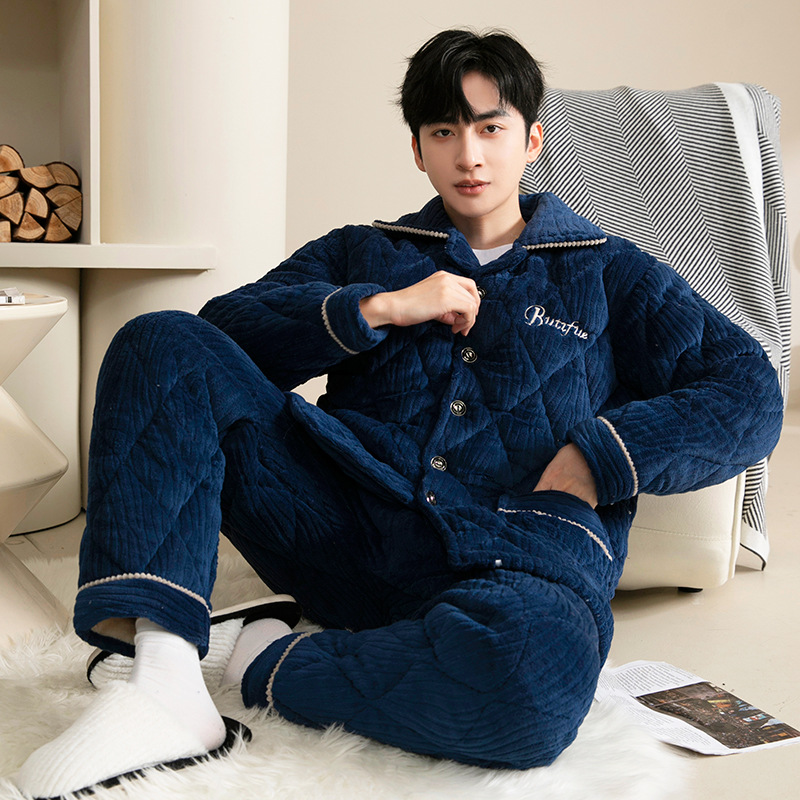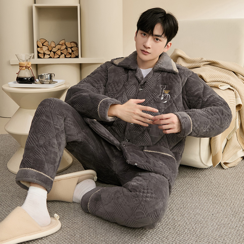 겨울 남자 3 층 플란넬 퀼트 파자마 산호 양털 두꺼운 따뜻한 집 옷 세트 면면 재킷 착용스토어 가기
