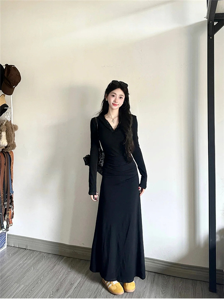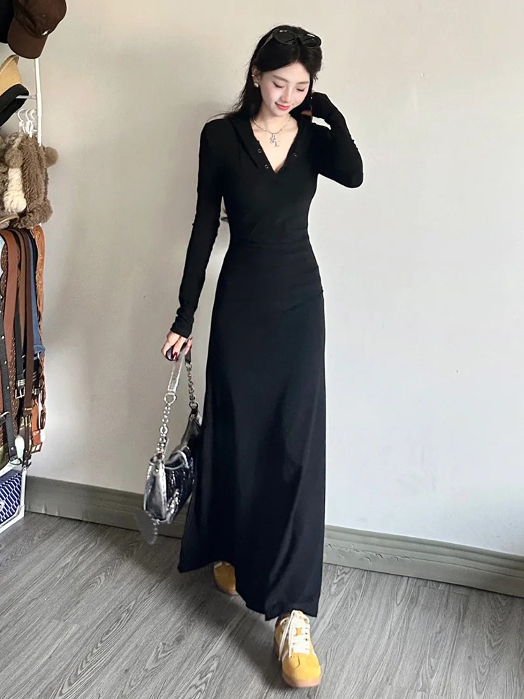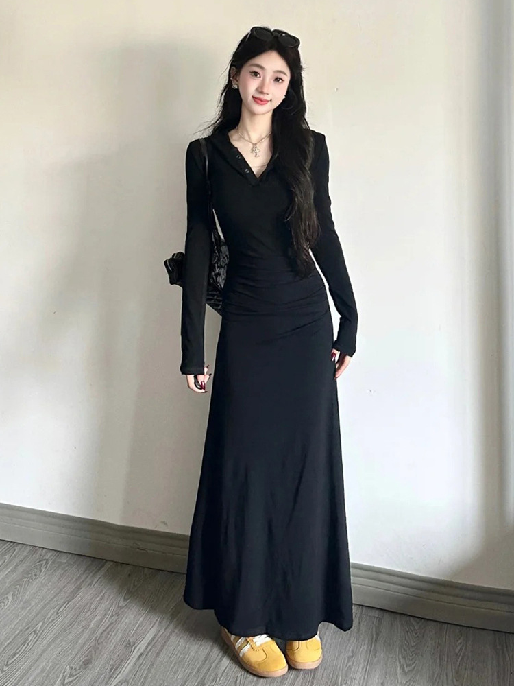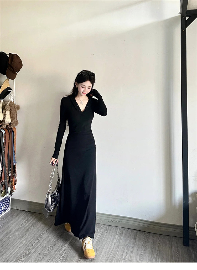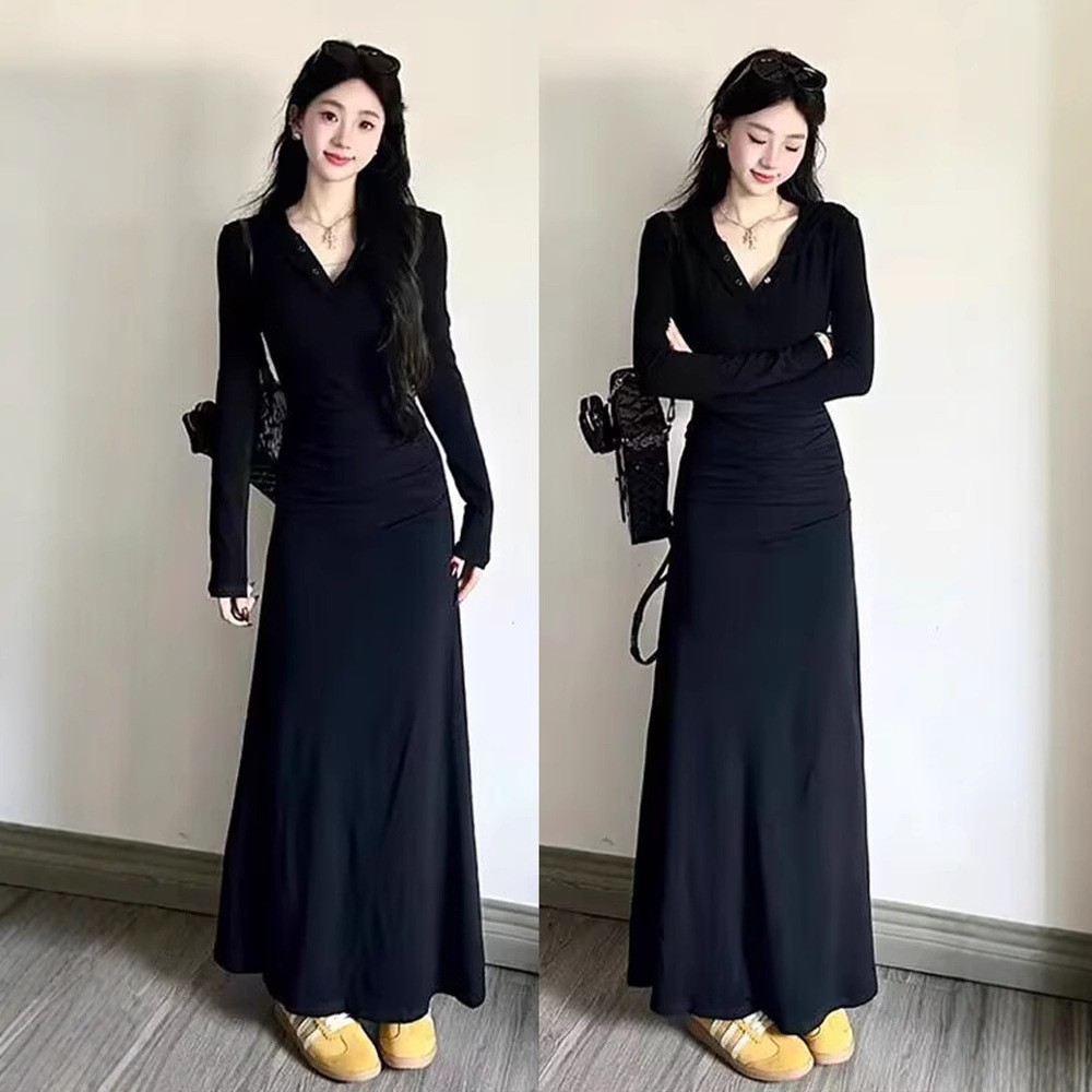 봄과 가을 검은 헵번 스타일 긴팔 원피스 여성 한국 국경 새로운 프랑스 스타일 우아한 힙합 V 넥 원피스