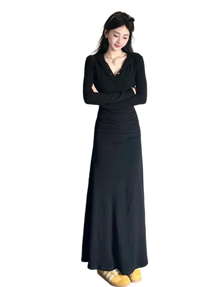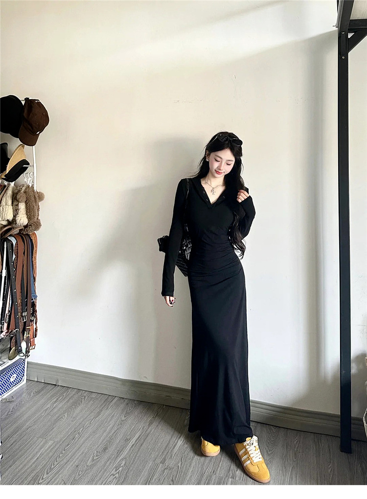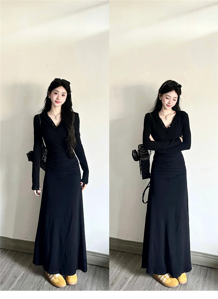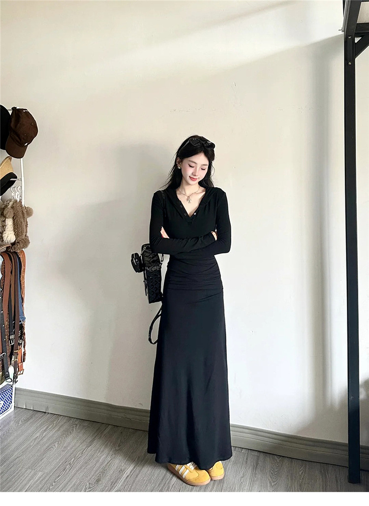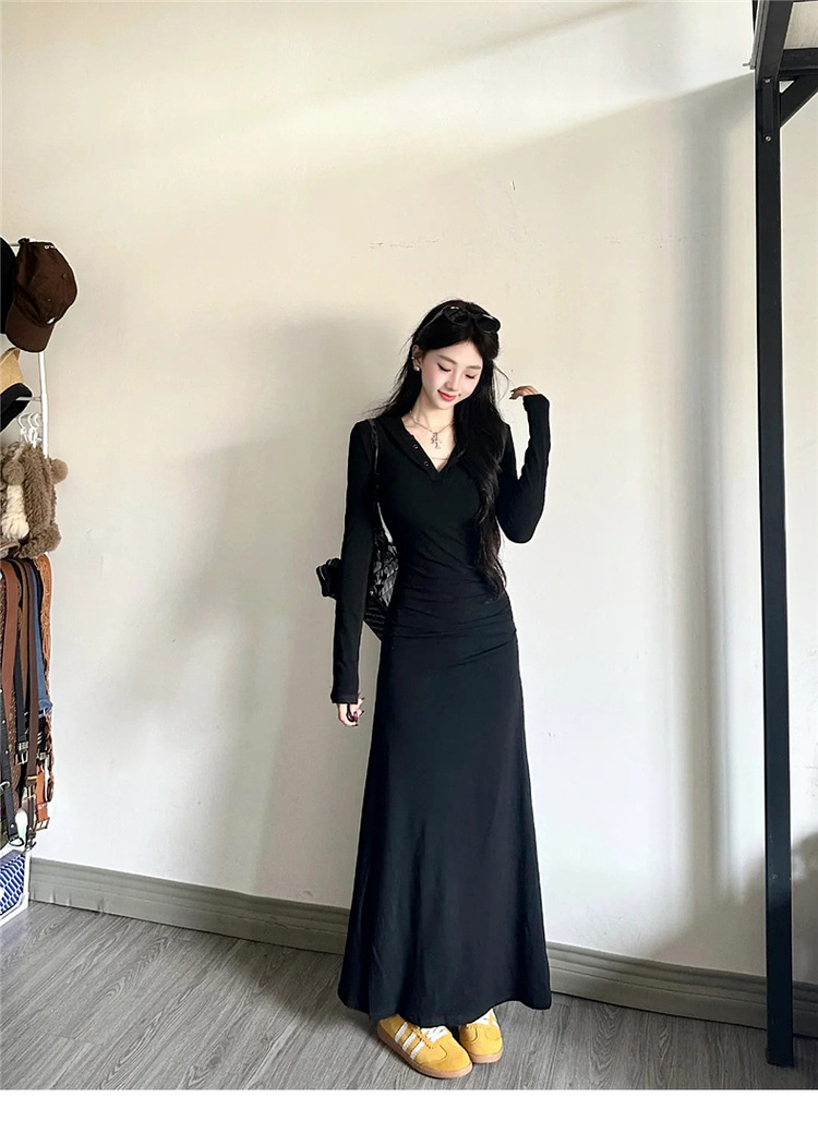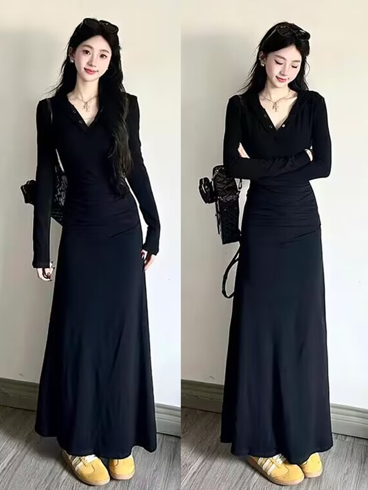 봄과 가을 검은 헵번 스타일 긴팔 원피스 여성 한국 국경 새로운 프랑스 스타일 우아한 힙합 V 넥 원피스