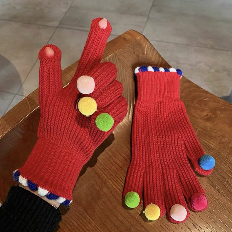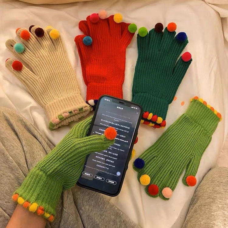 컬러 볼 울 니트 장갑 여성 겨울 귀여운 볼 터치 스크린 손가락 머리 따뜻한 5 손가락 사이클링 따뜻한스토어 가기