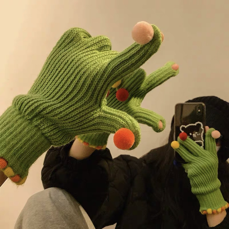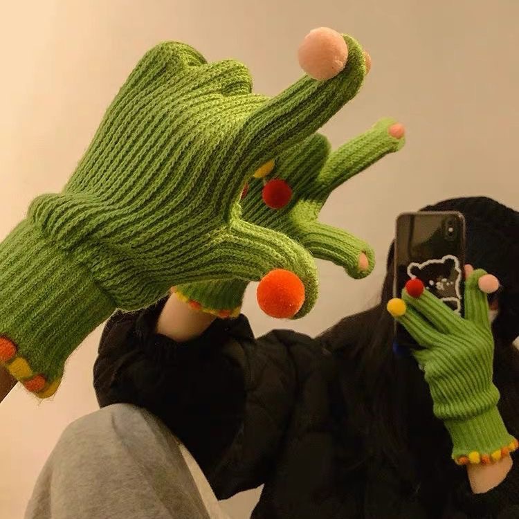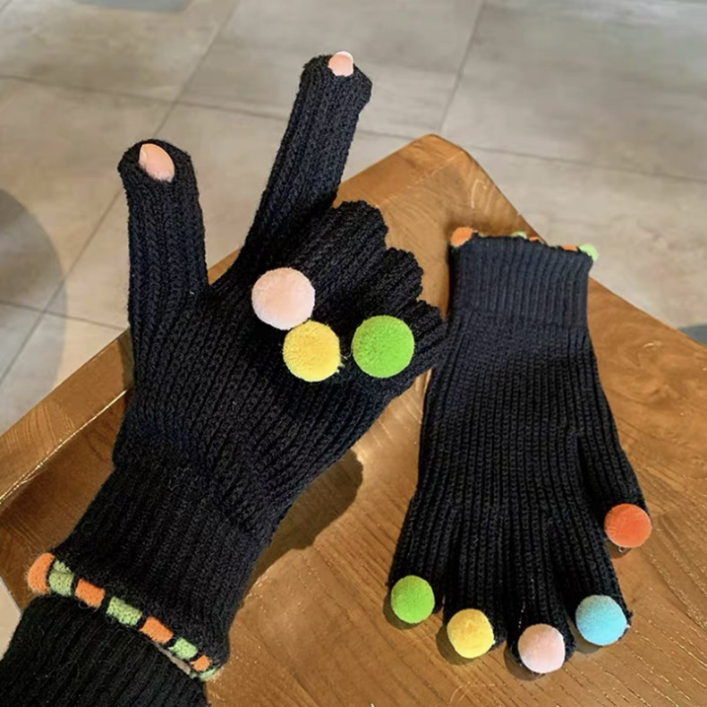 彩色球球毛线针织手套女冬季可爱小球触屏露手指头保暖五指骑车暖