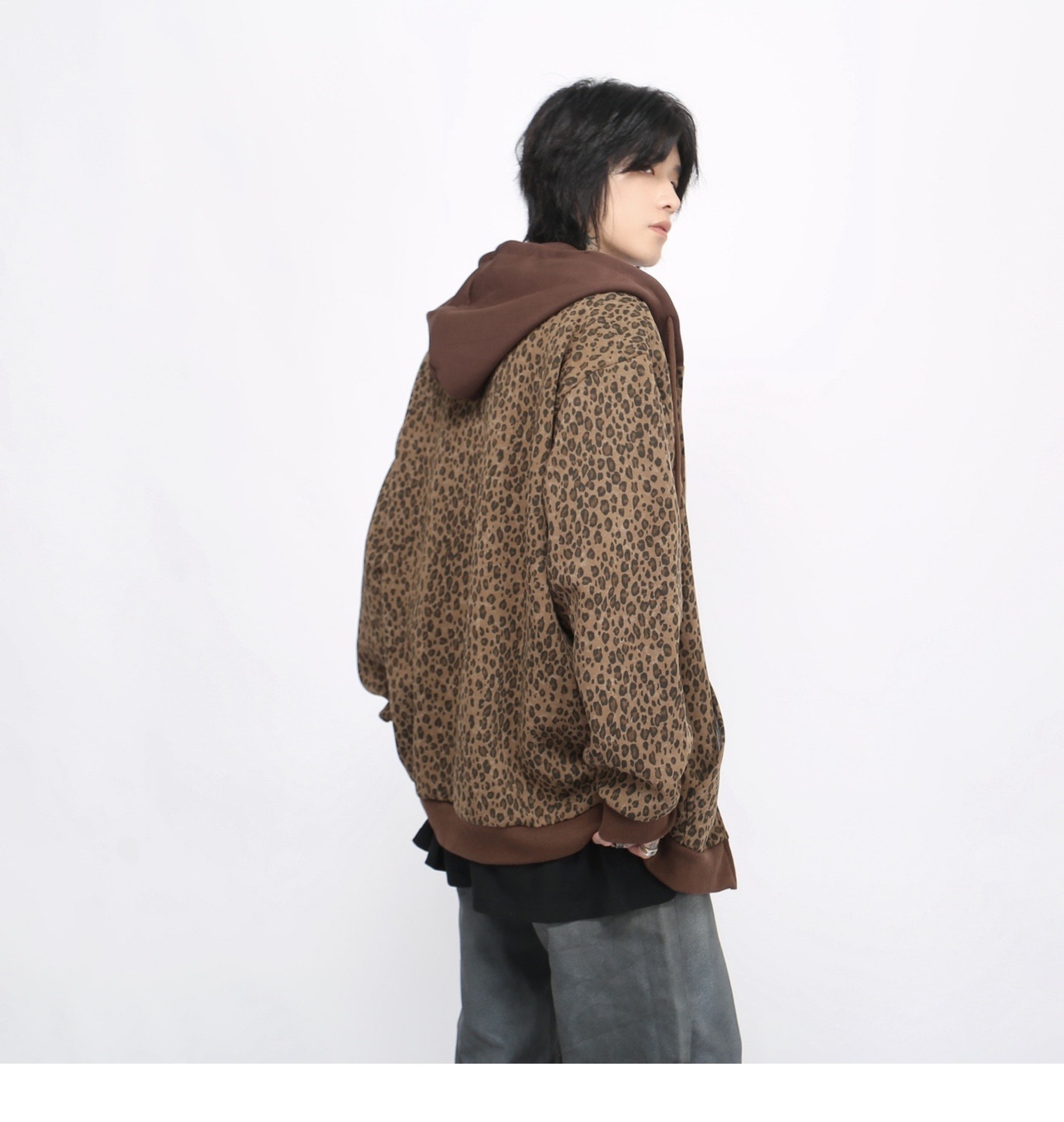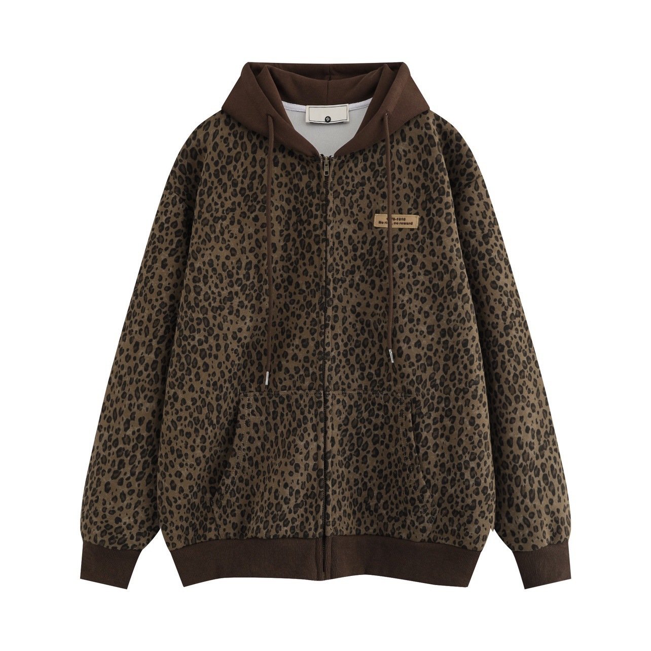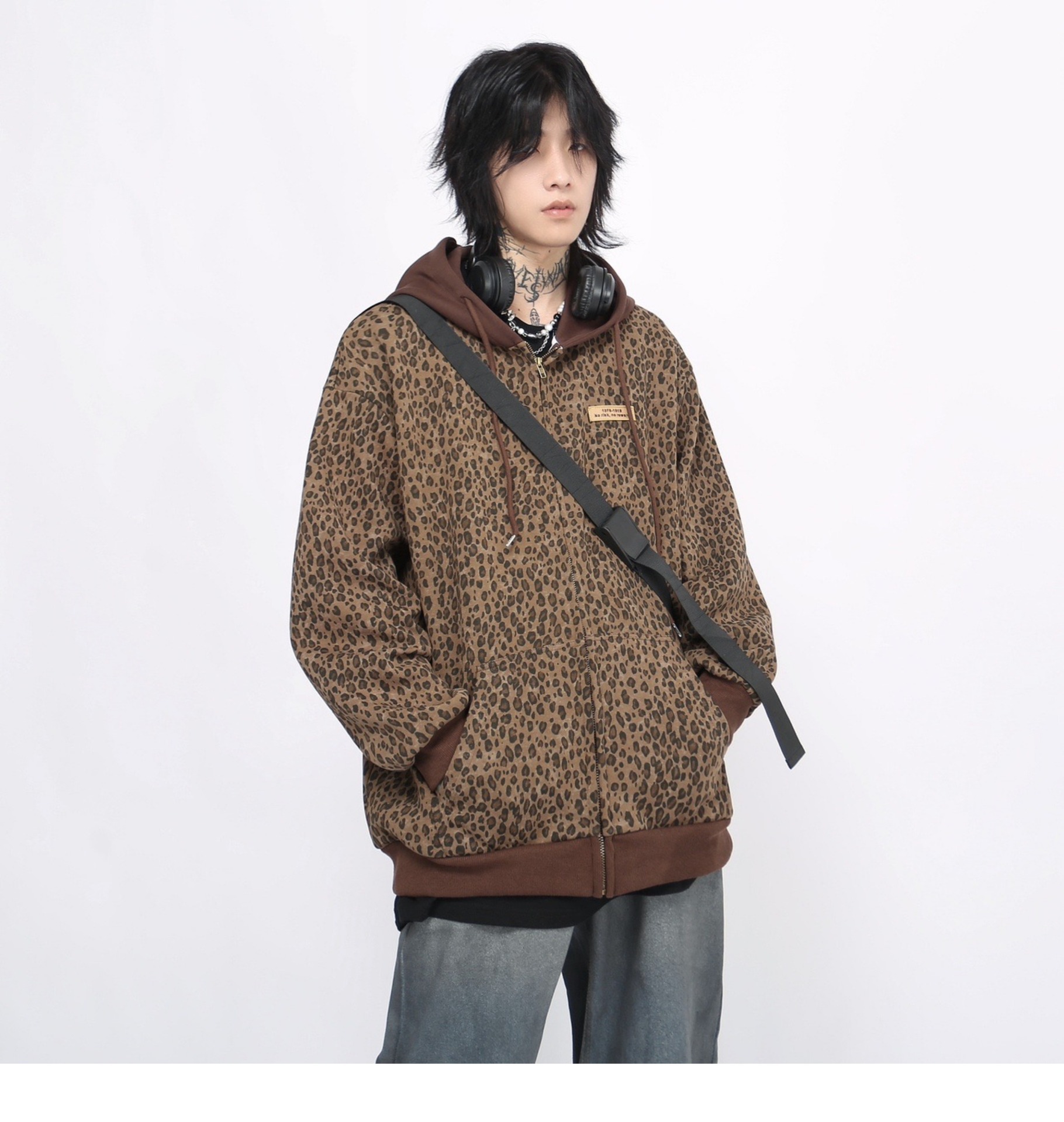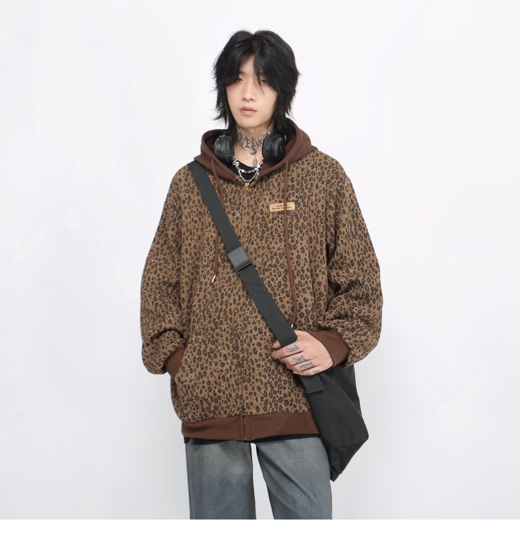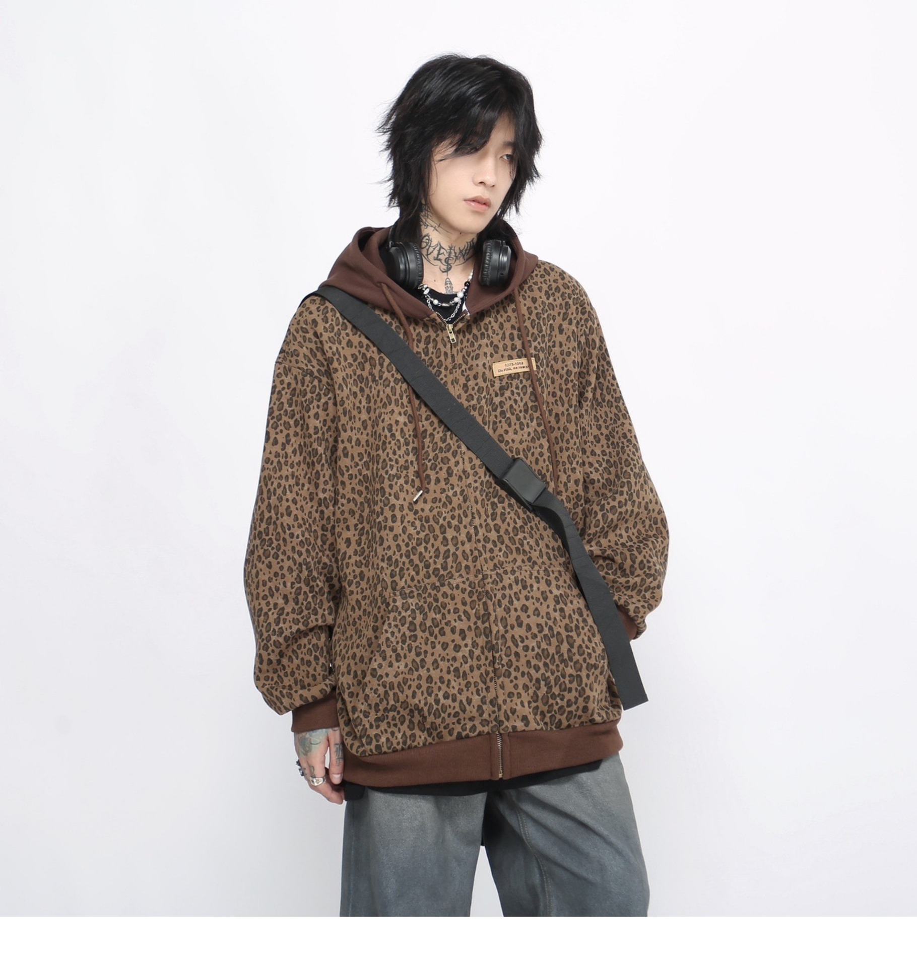 아메리칸 스타일 레트로 레오파드 무늬 후드 지퍼 스웨트 남성 2024 년 봄과 가을 새로운 느슨한 캐주얼 올 매치 커플의 코트 트렌디스토어 가기