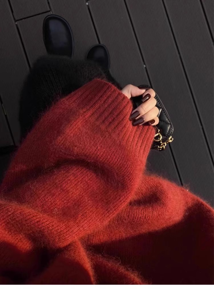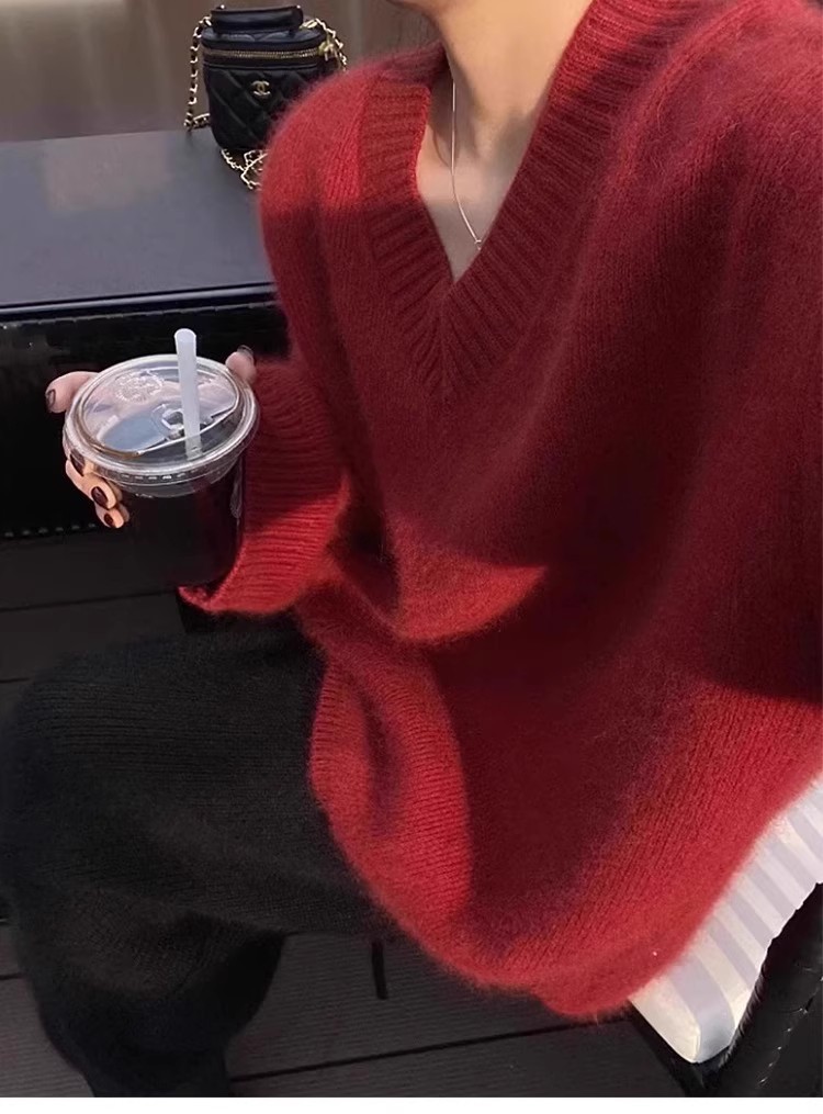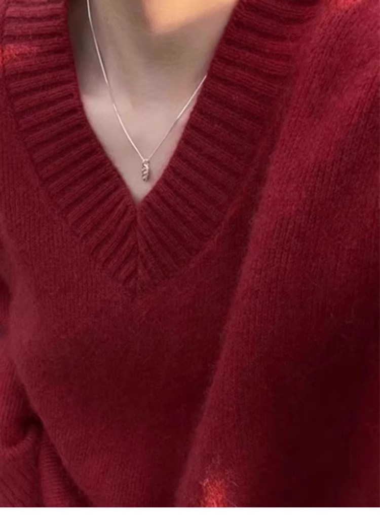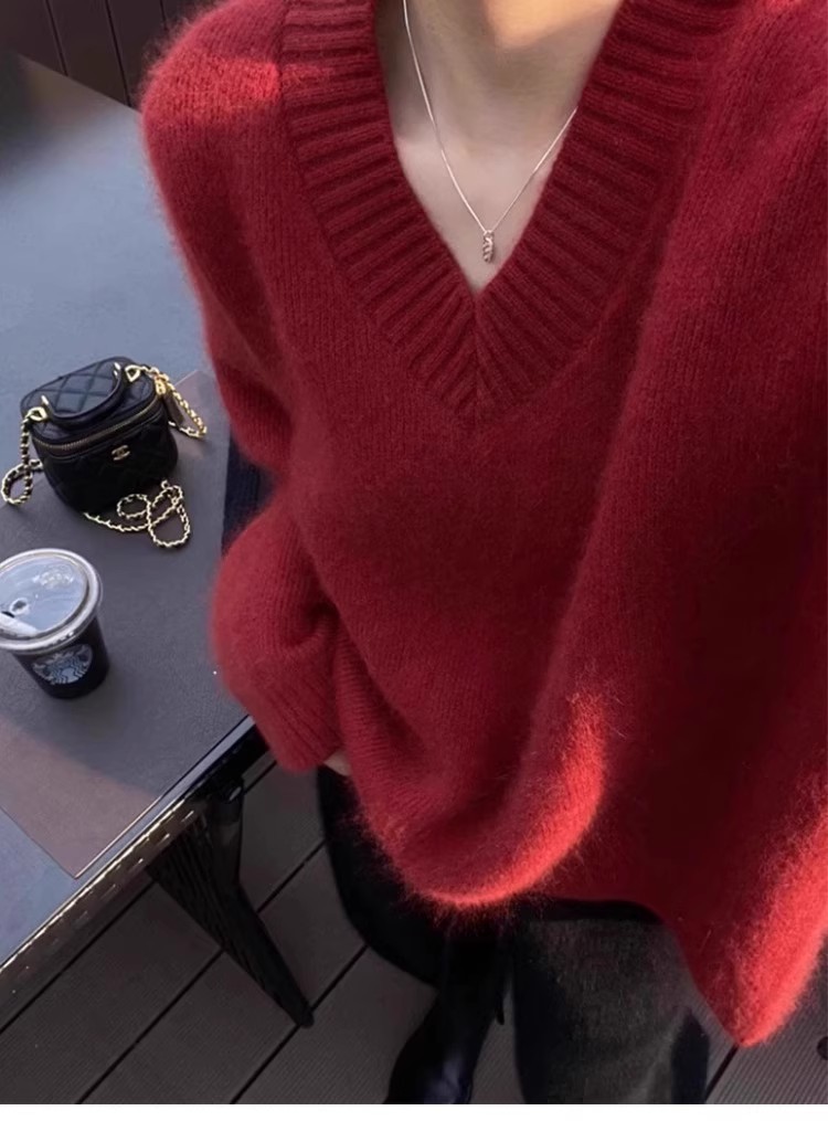 秋冬新款慵懒风红色v领套头毛衣女2024加厚宽松软糯针织衫上衣
