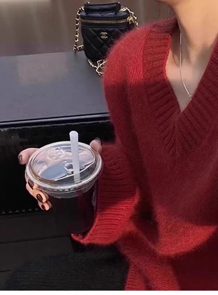 가을과 겨울 새로운 게으른 스타일 레드 V 넥 풀오버 스웨터 여성의 2024 여성을위한 두꺼운 루즈 소프트 왁스 스웨터 탑스토어 가기