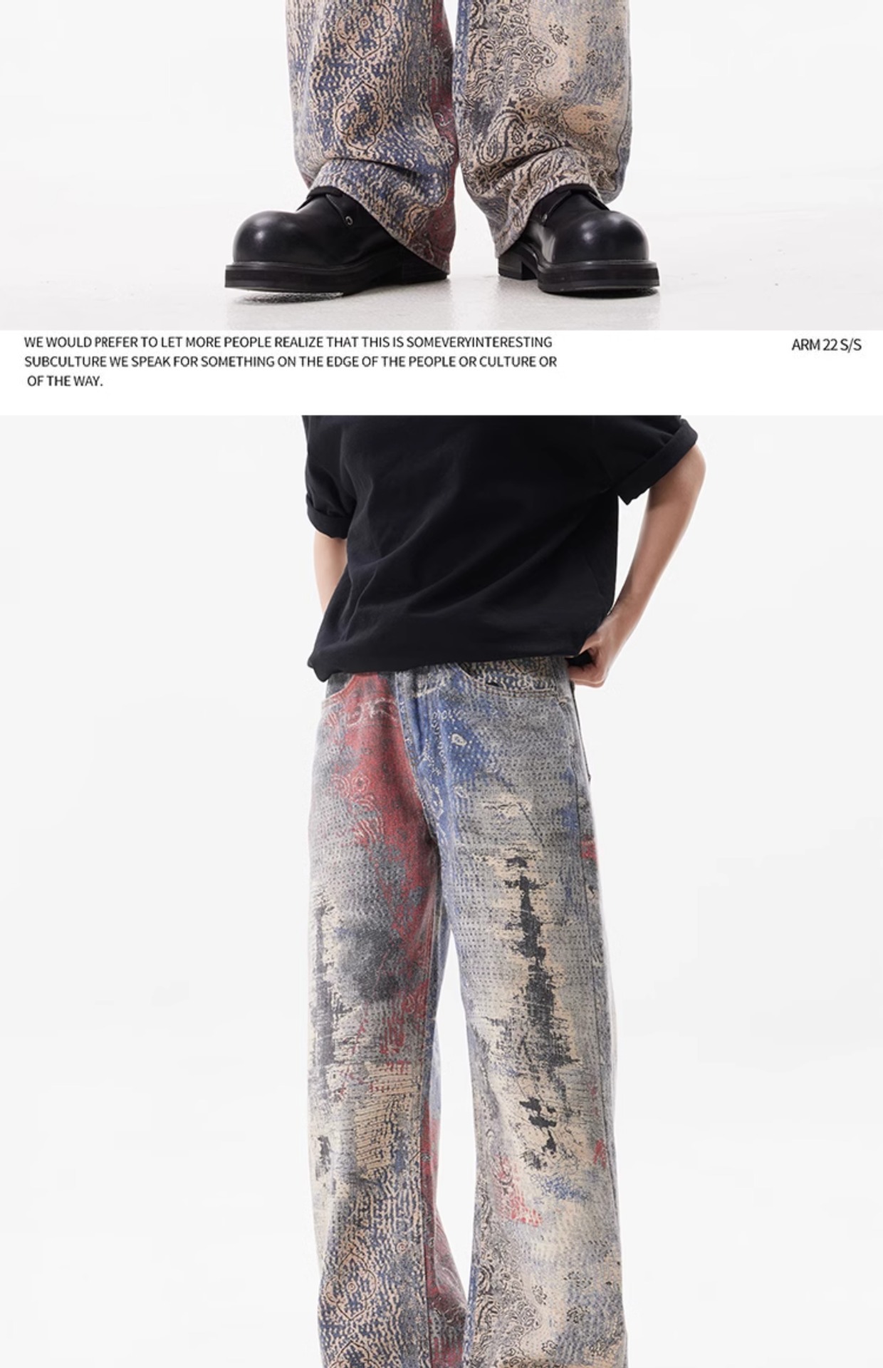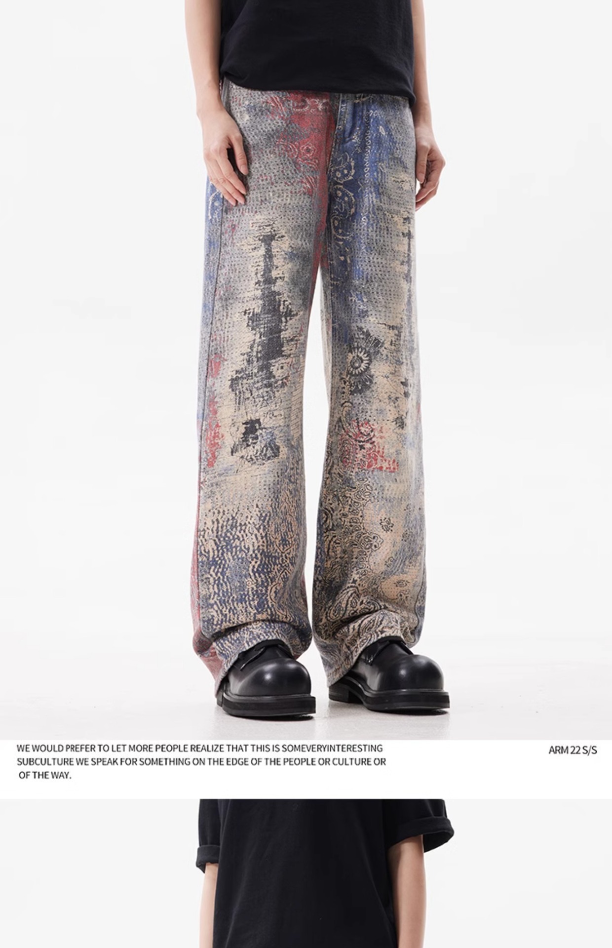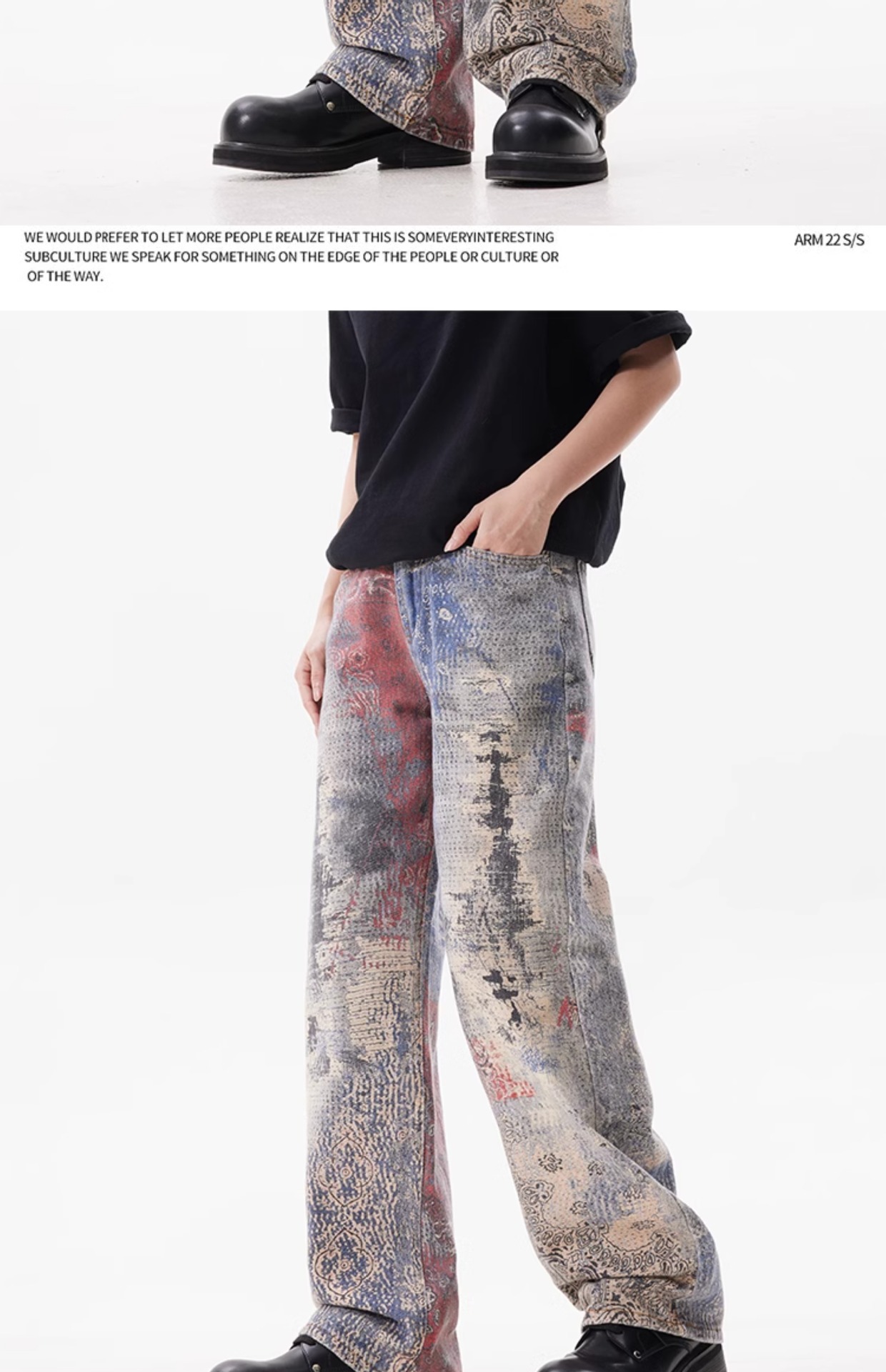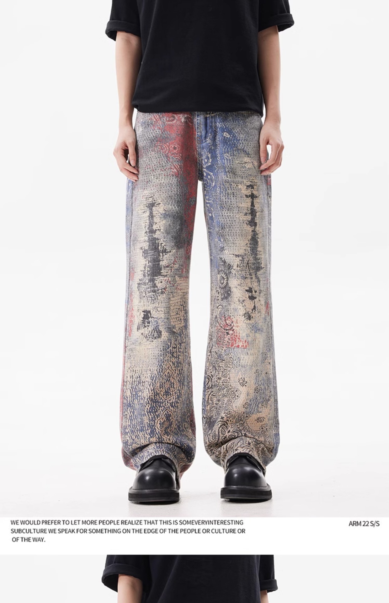 미국 틈새 디자인 센스 3D 디지털 인쇄 스트레이트 청바지 남성 봄과 가을 새로운 느슨한 넓은 다리 긴 바지
